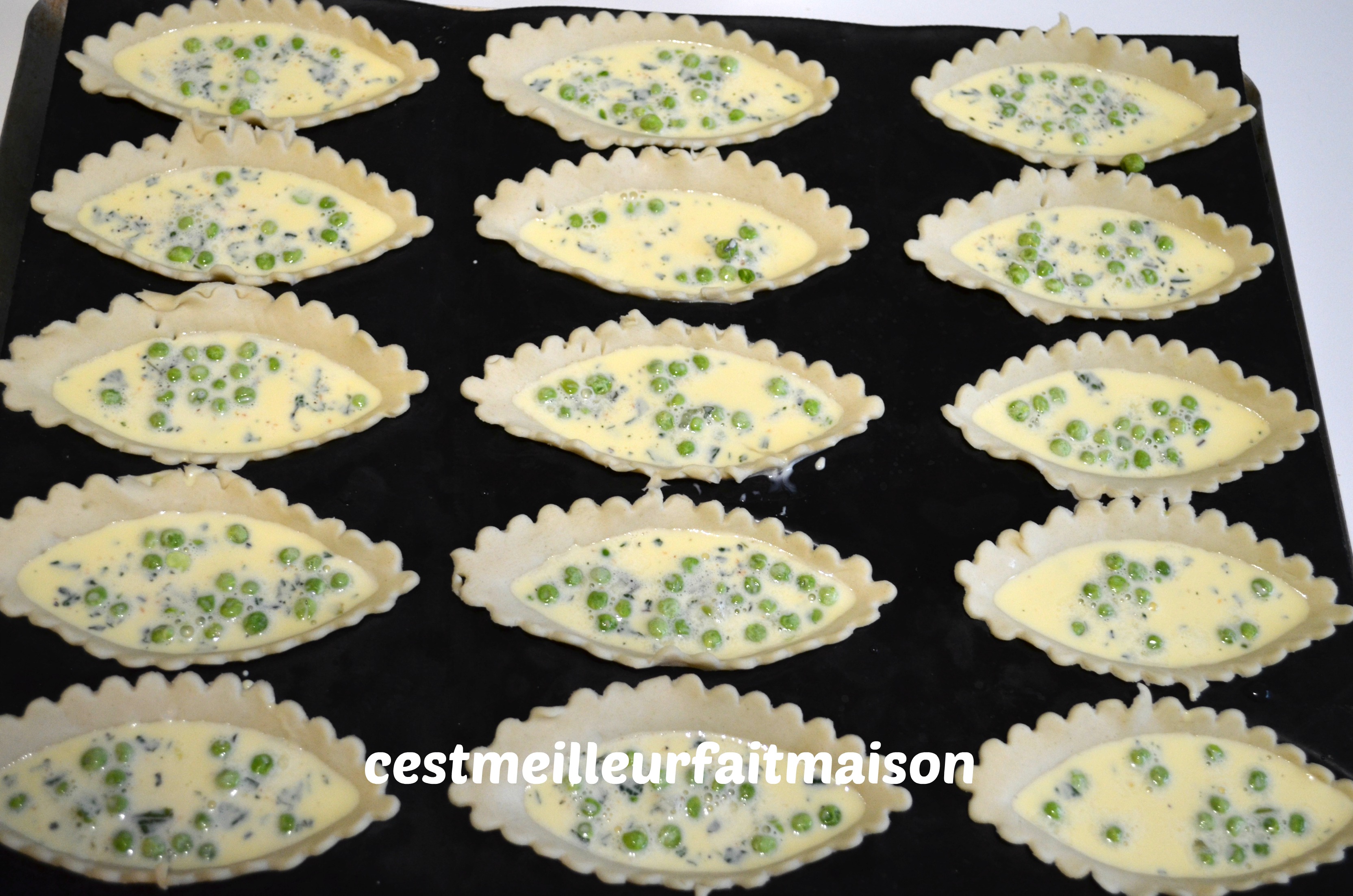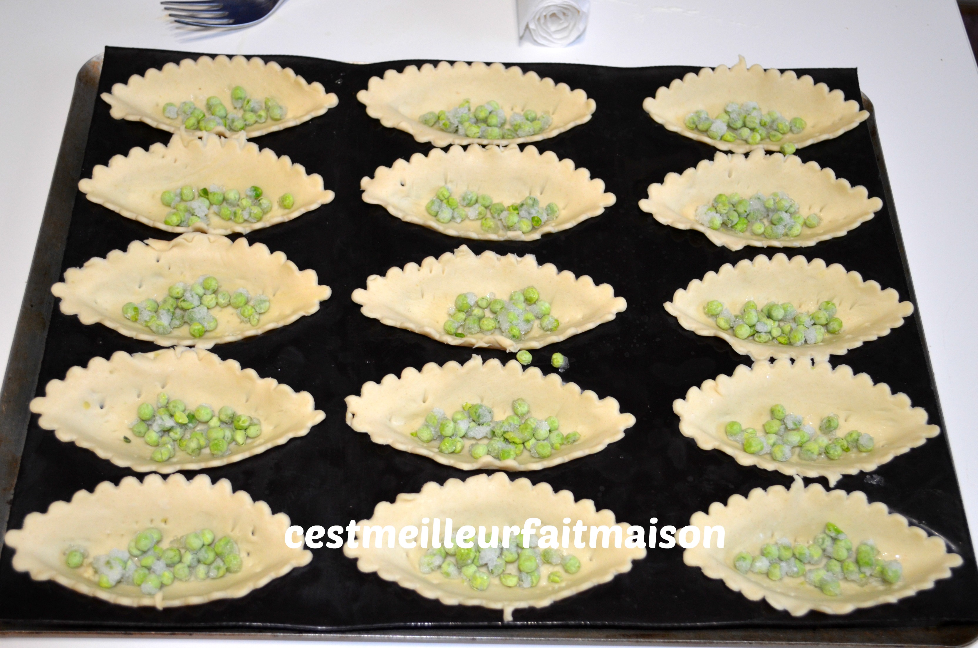 2- Mettre des petits pois au fond de chaque barquette. Sur la photo il n’y en a pas beaucoup car je n’en avais presque plus.