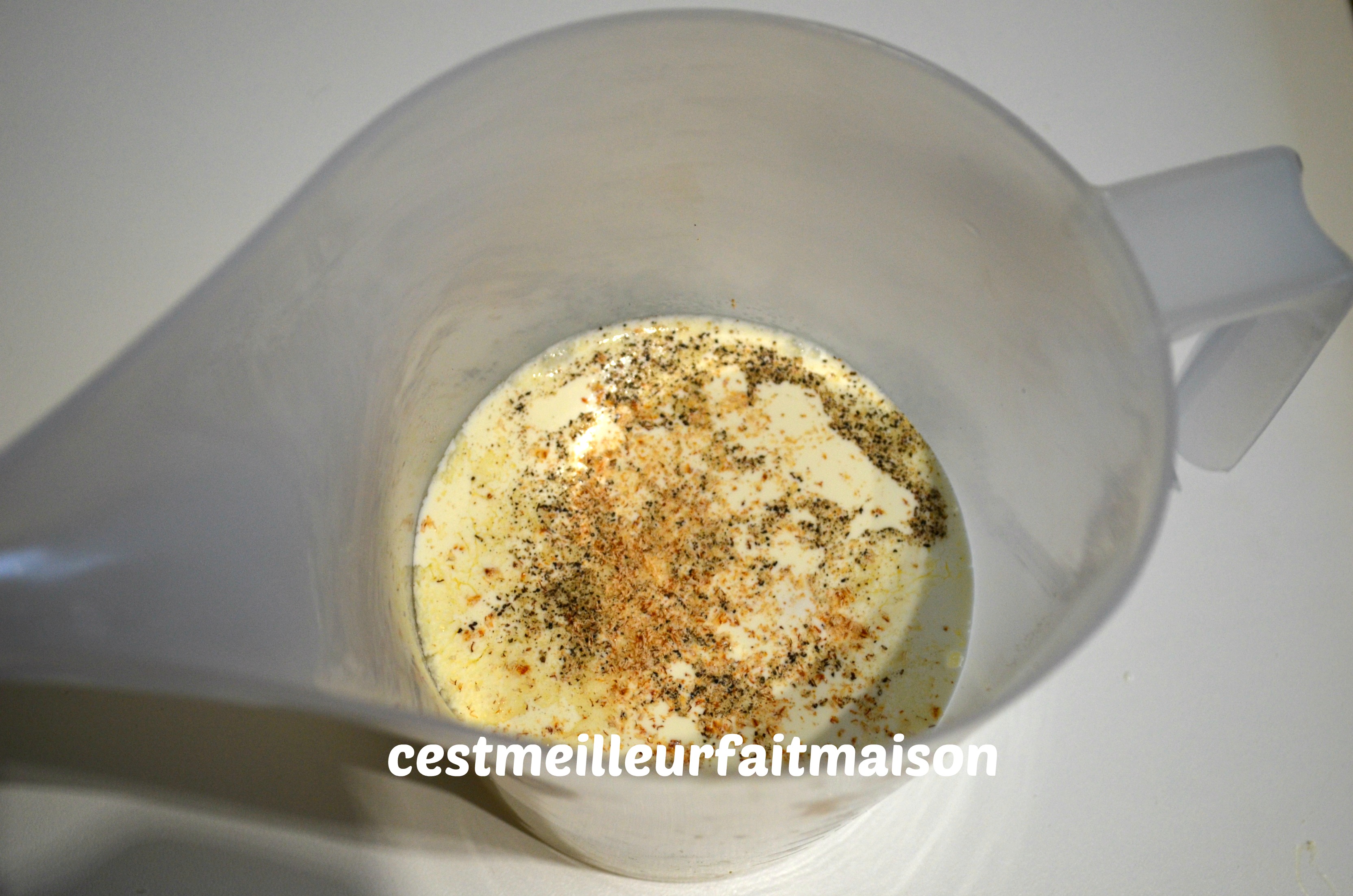 3- Dans le pichet Guy Demarle battre les œufs avec la crème. Ajouter le sel, le poivre, de la noix de muscade et la menthe hachée. A l’aide du bec verseur, verser la préparation dans les barquettes.
