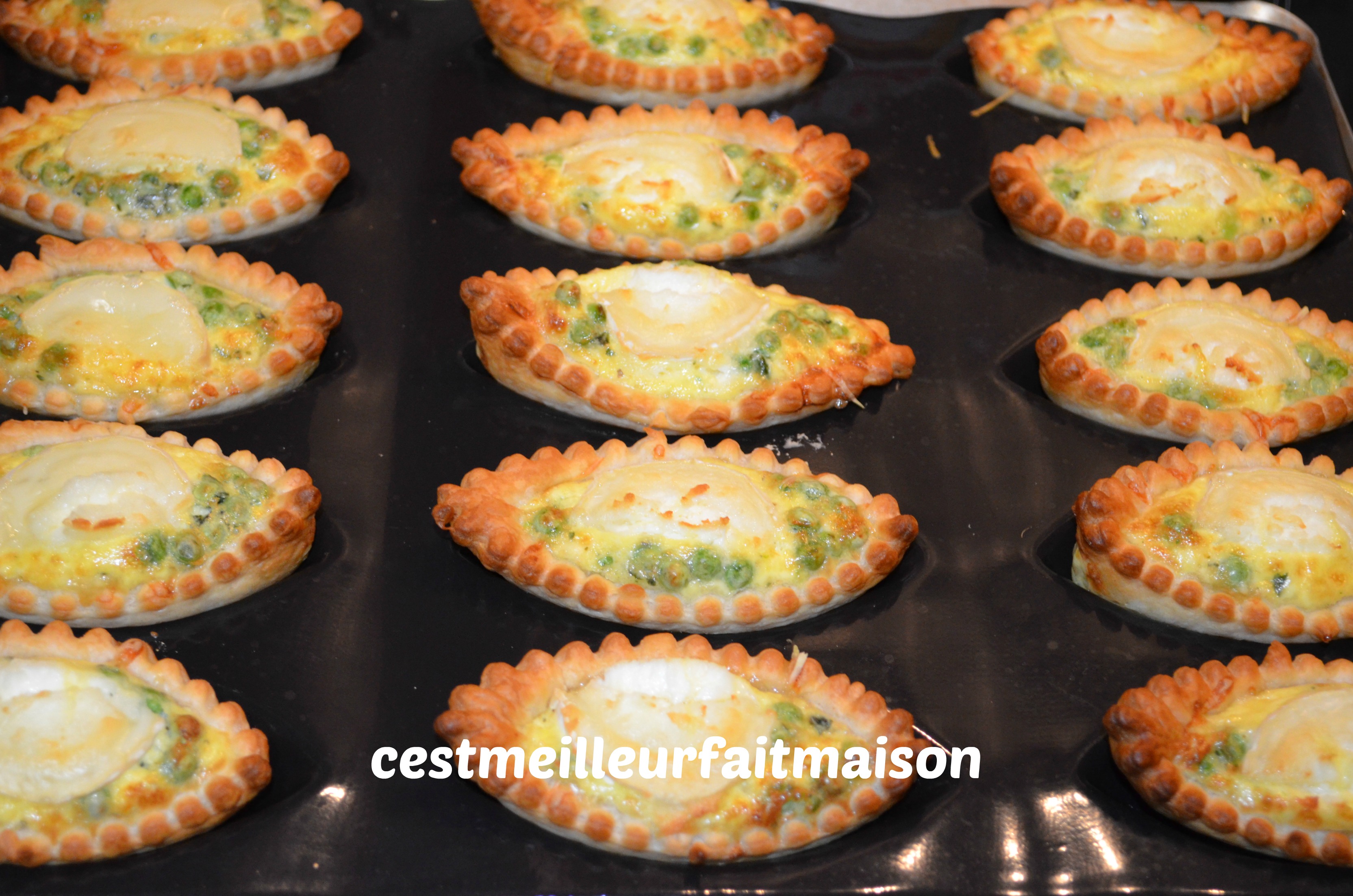 4- Parsemer de comté râpé. Couper la bûche de chèvre en tranche, puis en demi tranches et en déposer deux sur chaque barquette. Sur la photo, il n’y a qu’une demi tranche car j’avais suivi la recette initiale mais depuis, je mets deux demi tranches par barquette. C’est meilleur, on retrouve plus le goût du fromage.