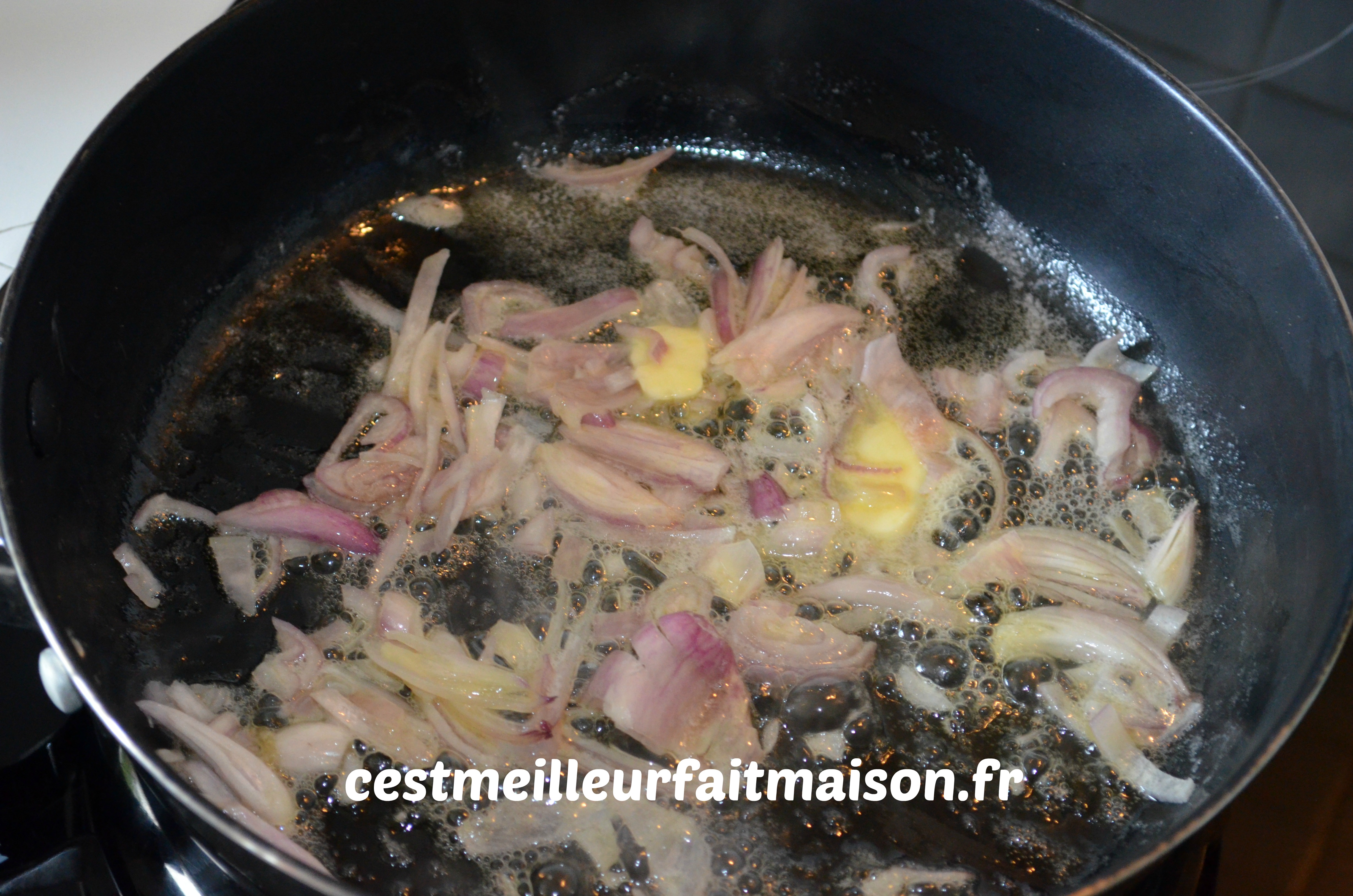 1- Dans une sauteuse, faire fondre le beurre et ajouter les oignons ou les échalotes. Laisser fondre quelques minutes jusqu’à ce que les oignons deviennent translucides.