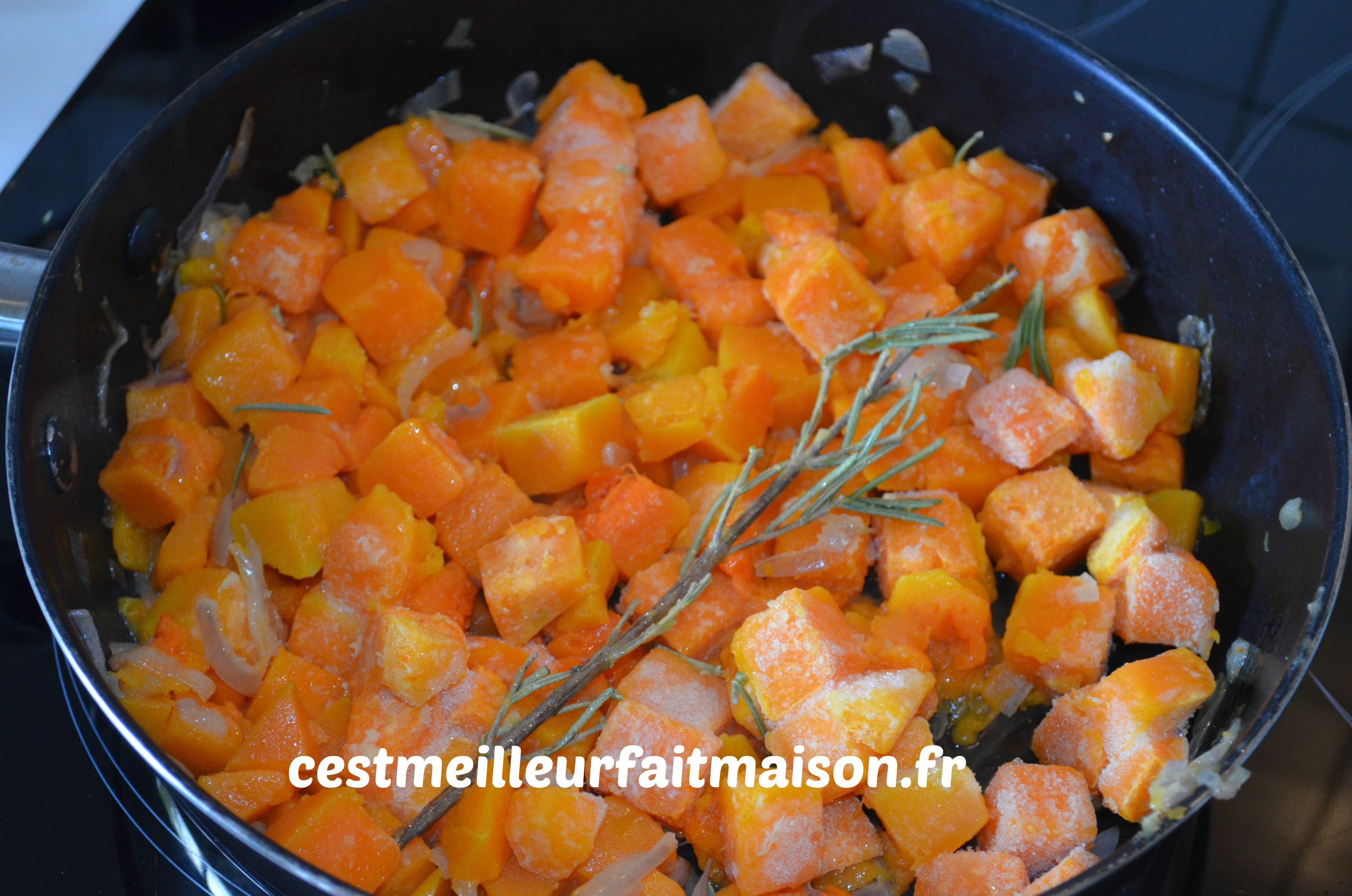 2- Ajouter les cubes de potiron et le romarin. Mélanger et laisser cuire jusqu’à ce que le potiron soit fondant. Remuer de temps en temps.