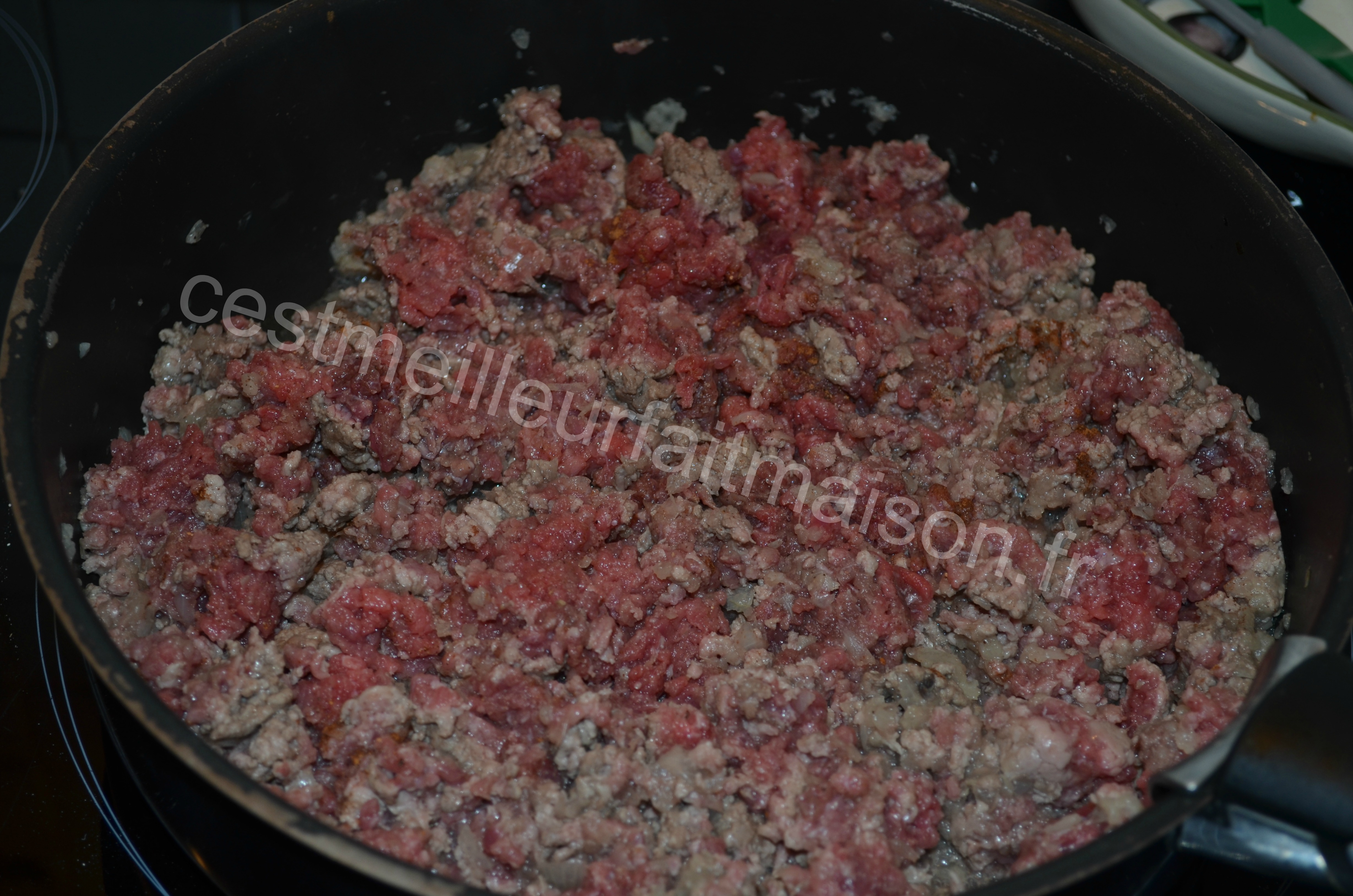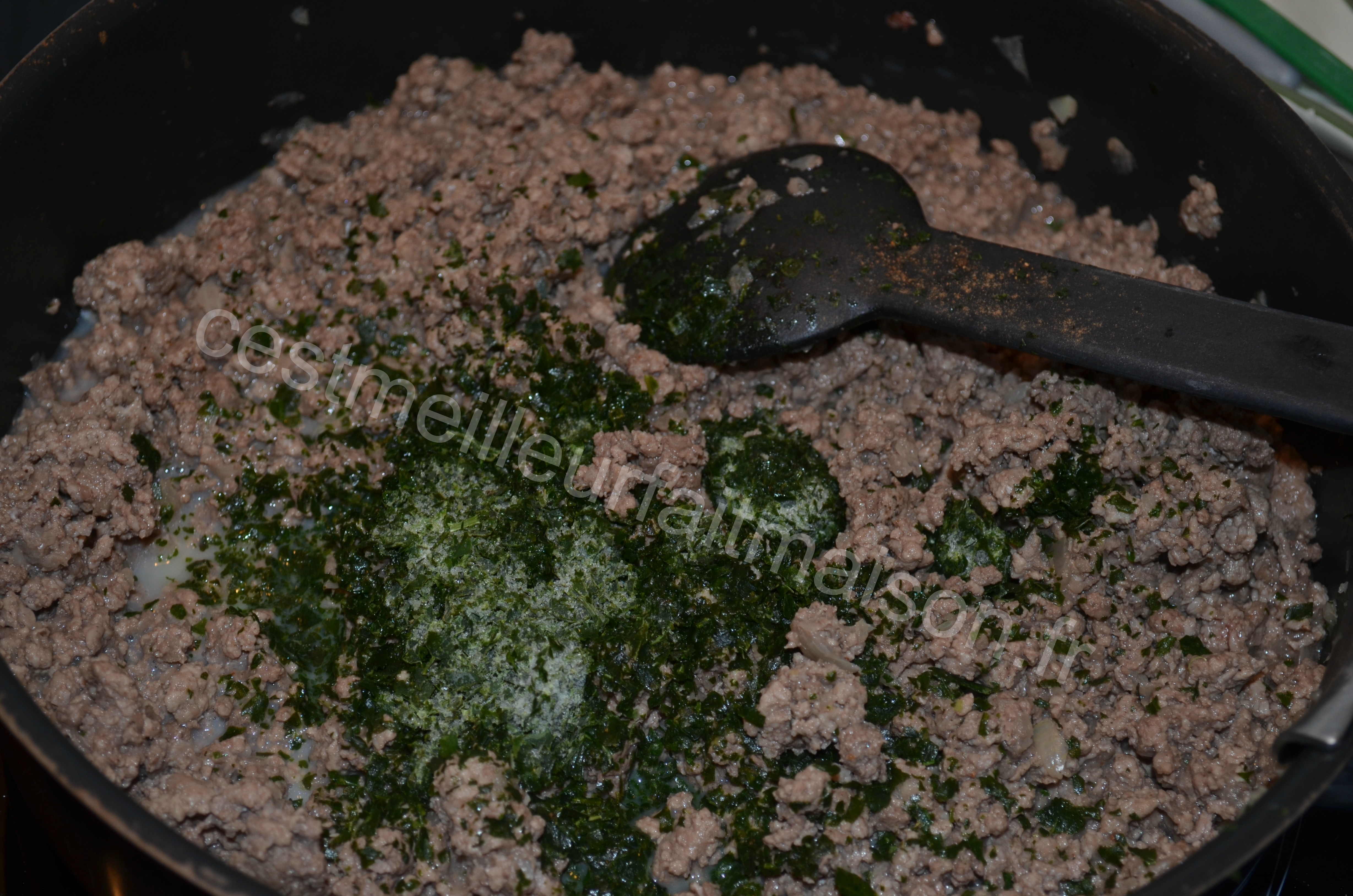 3- Ajouter la viande hachée, le sel et le poivre ainsi que la cannelle et la noix de muscade. Pour les quantités, c’est selon les goûts. Je mets plus de noix de muscade que de cannelle (environ 1/2 cc de muscade et un peu moins de cannelle).
