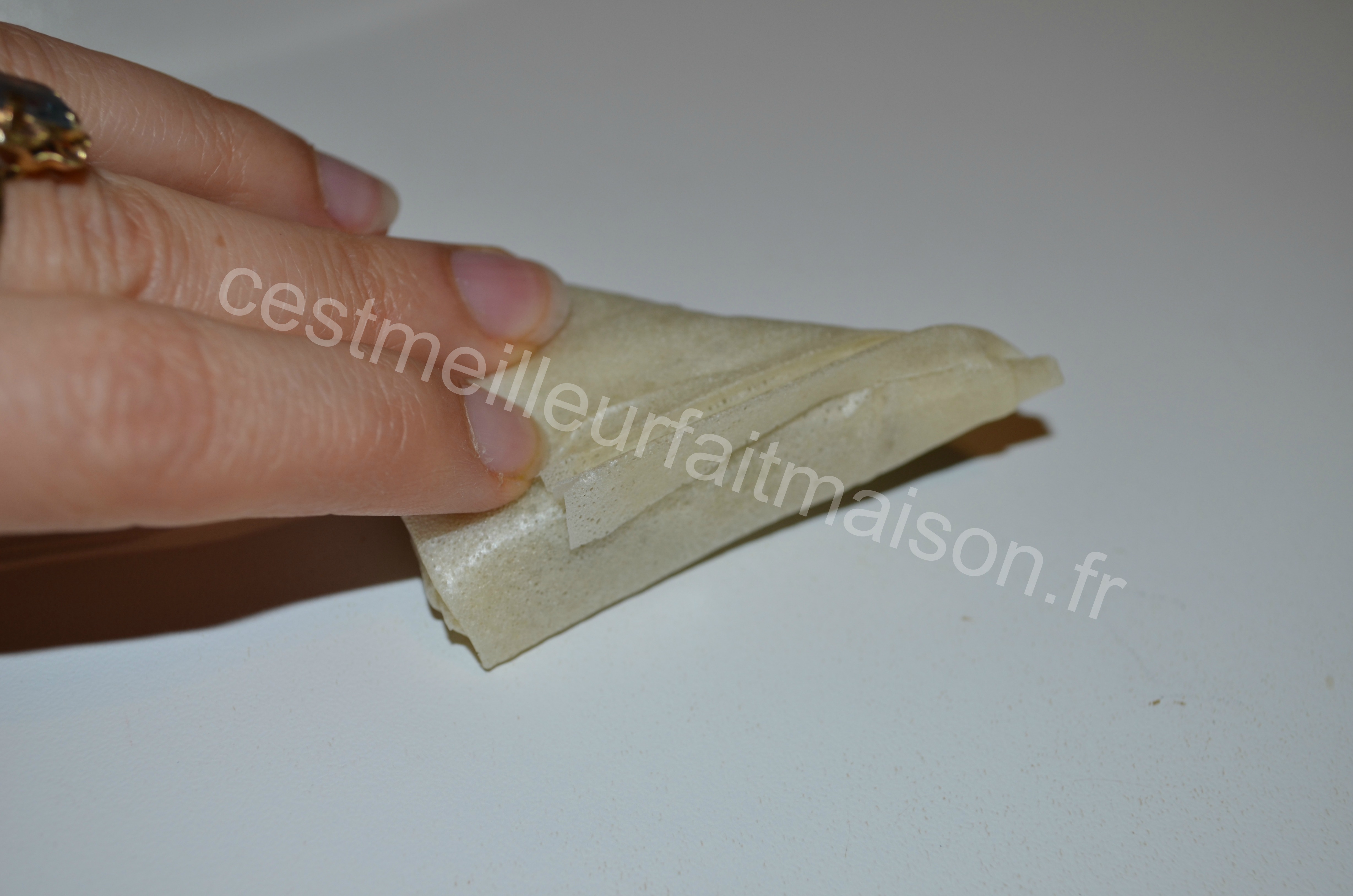 8- Replier chaque moitié de façon à avoir un rectangle. Déposer une cuillère à café de farce en bas et recouvrir avec la feuille en faisant un triangle. Remonter en suivant les bords du rectangle.