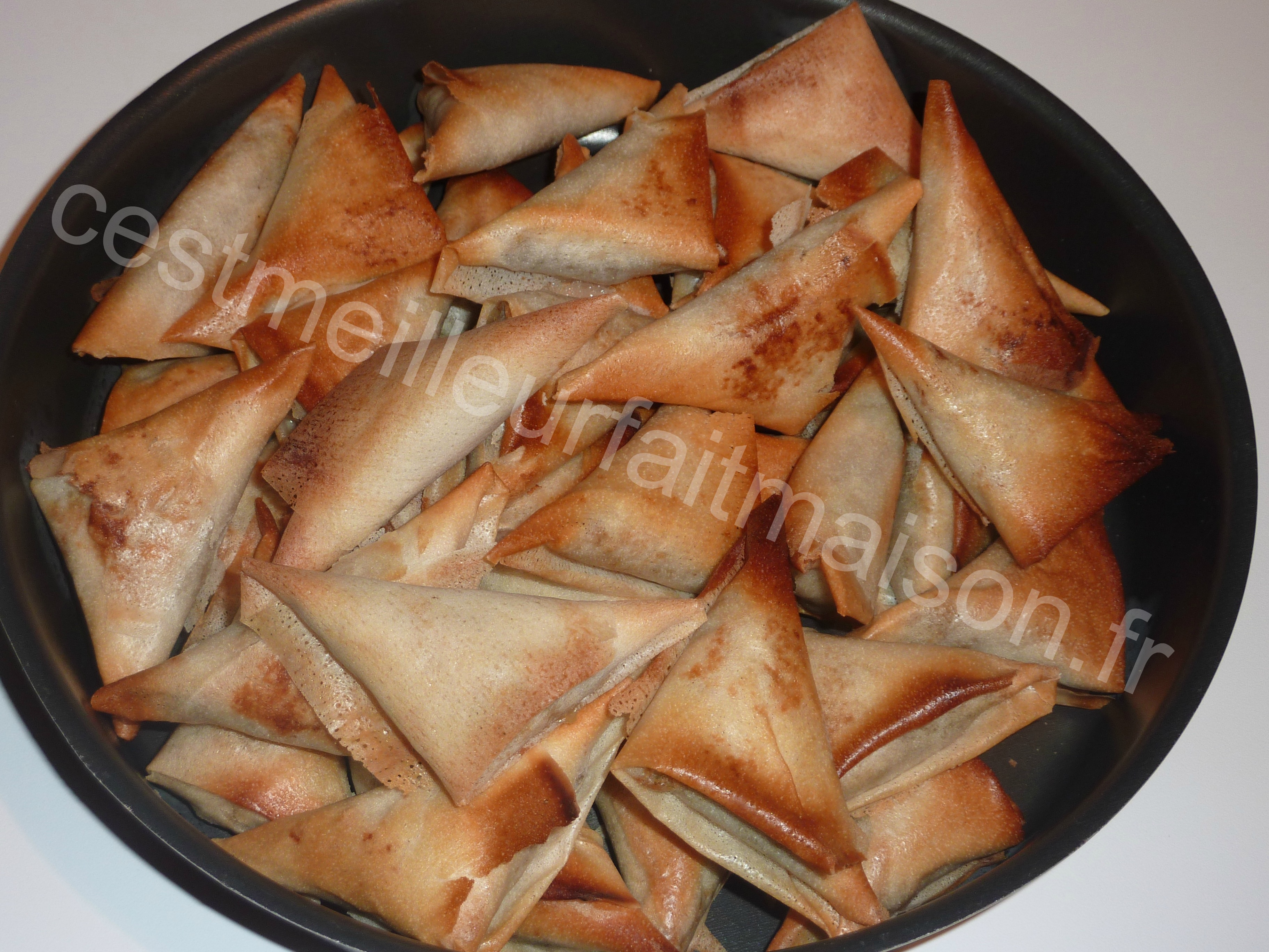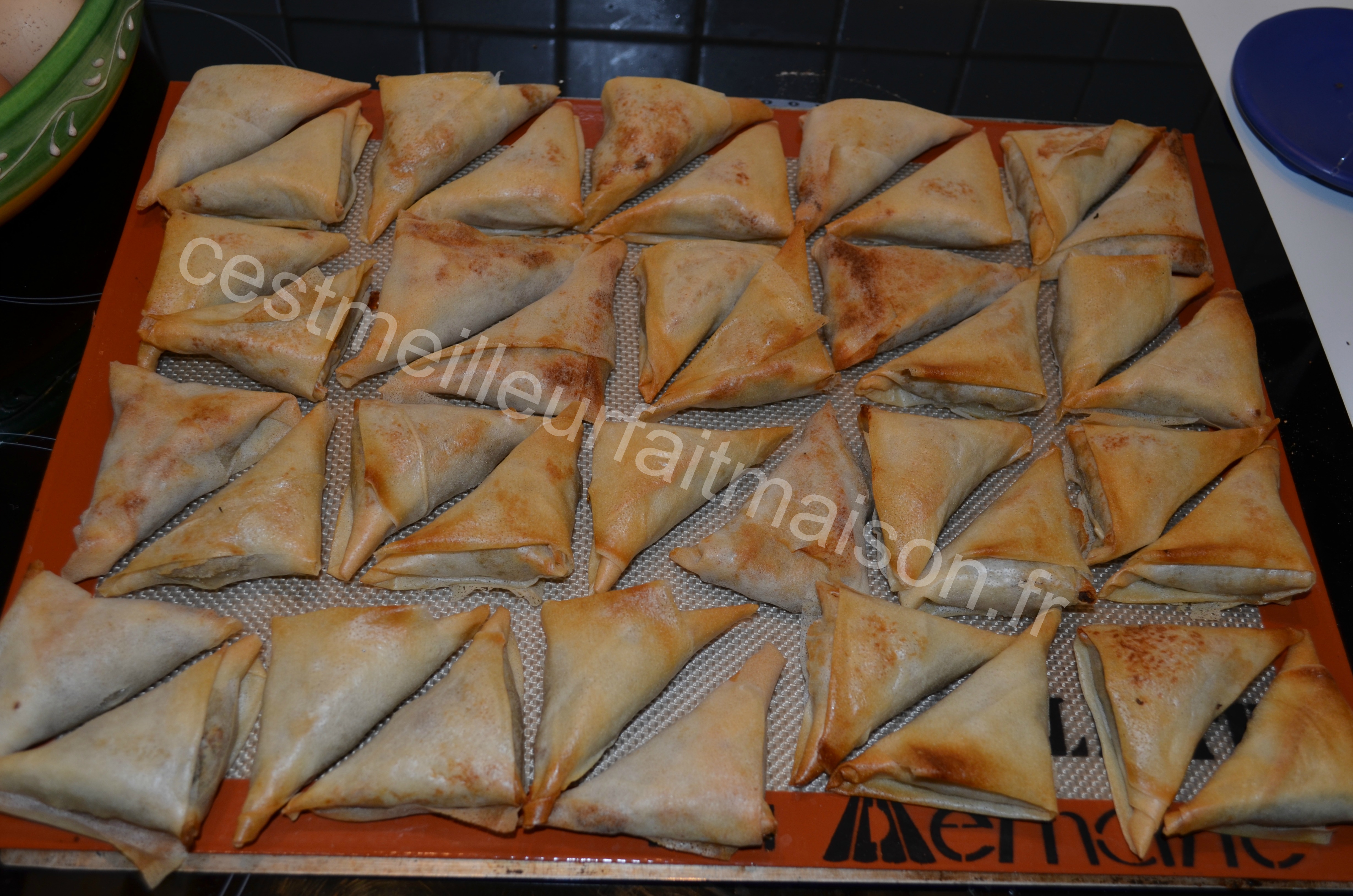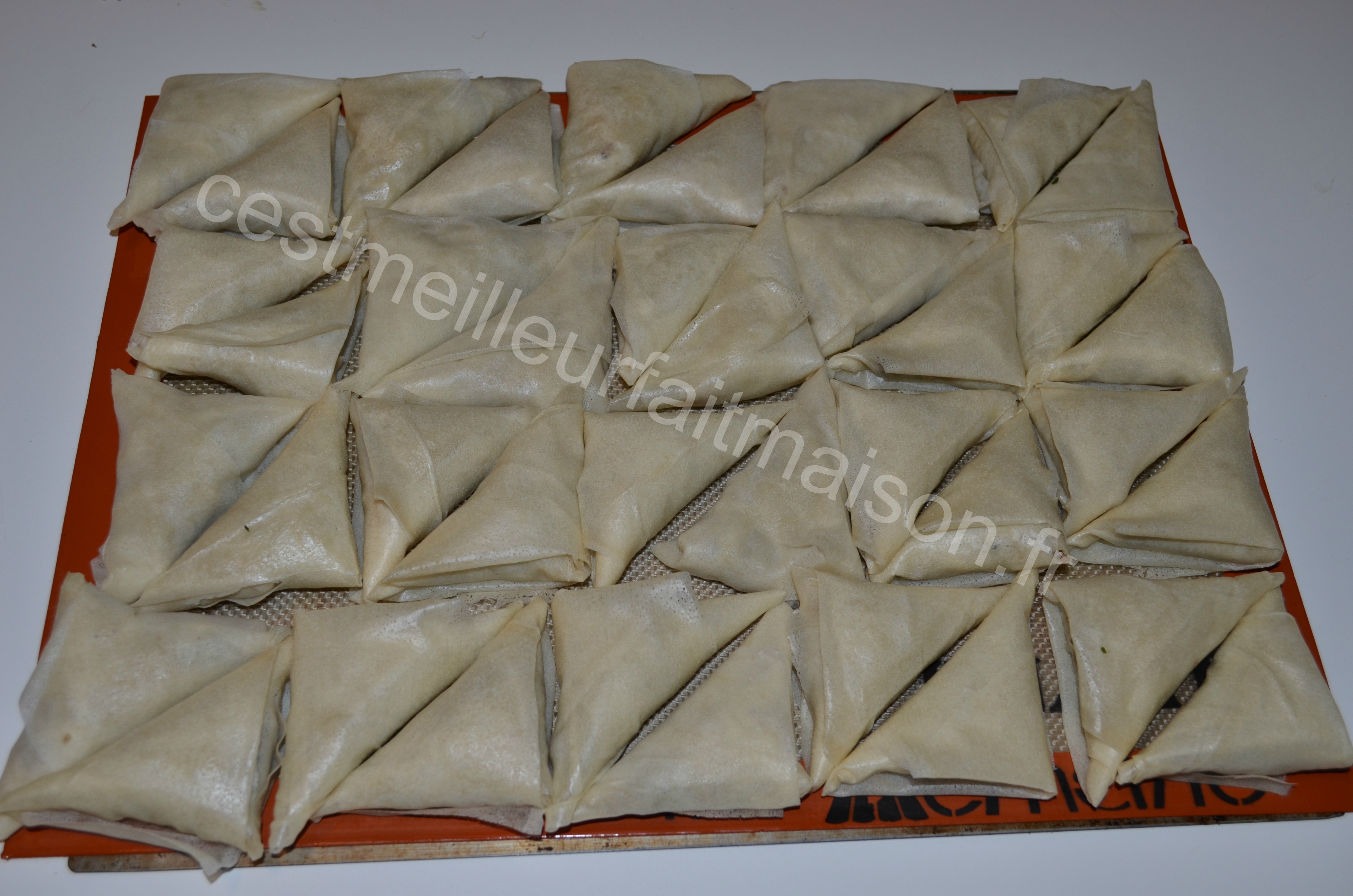 9- Poser chaque triangle (fermeture en dessous) sur une plaque de cuisson recouverte de papier cuisson ou d’une toile Silpat.