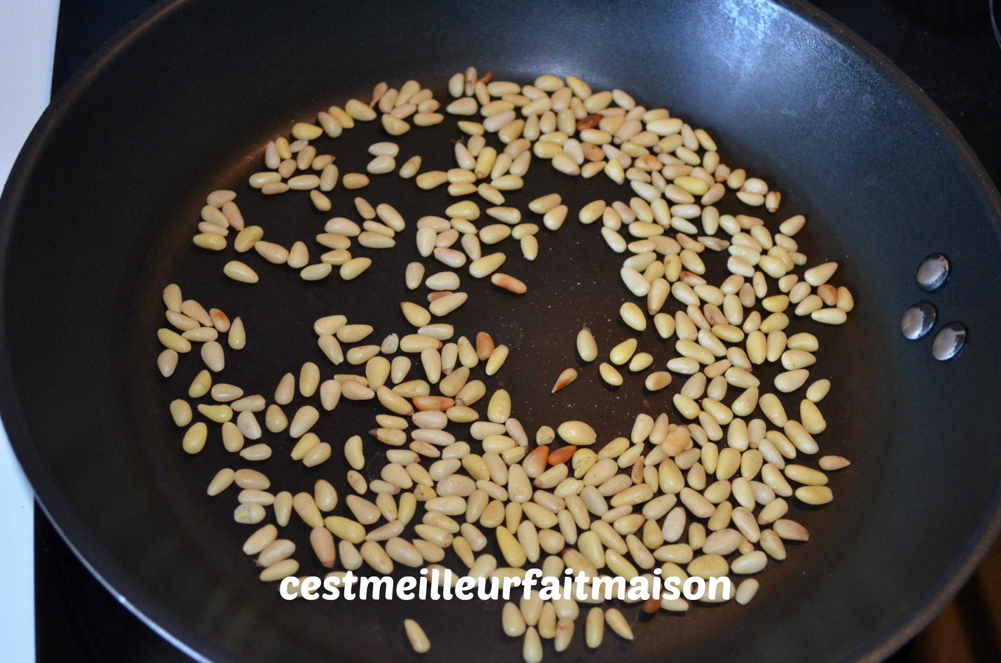 1- Dans une poêle, faire griller, à sec, les pignons de pin et réserver.