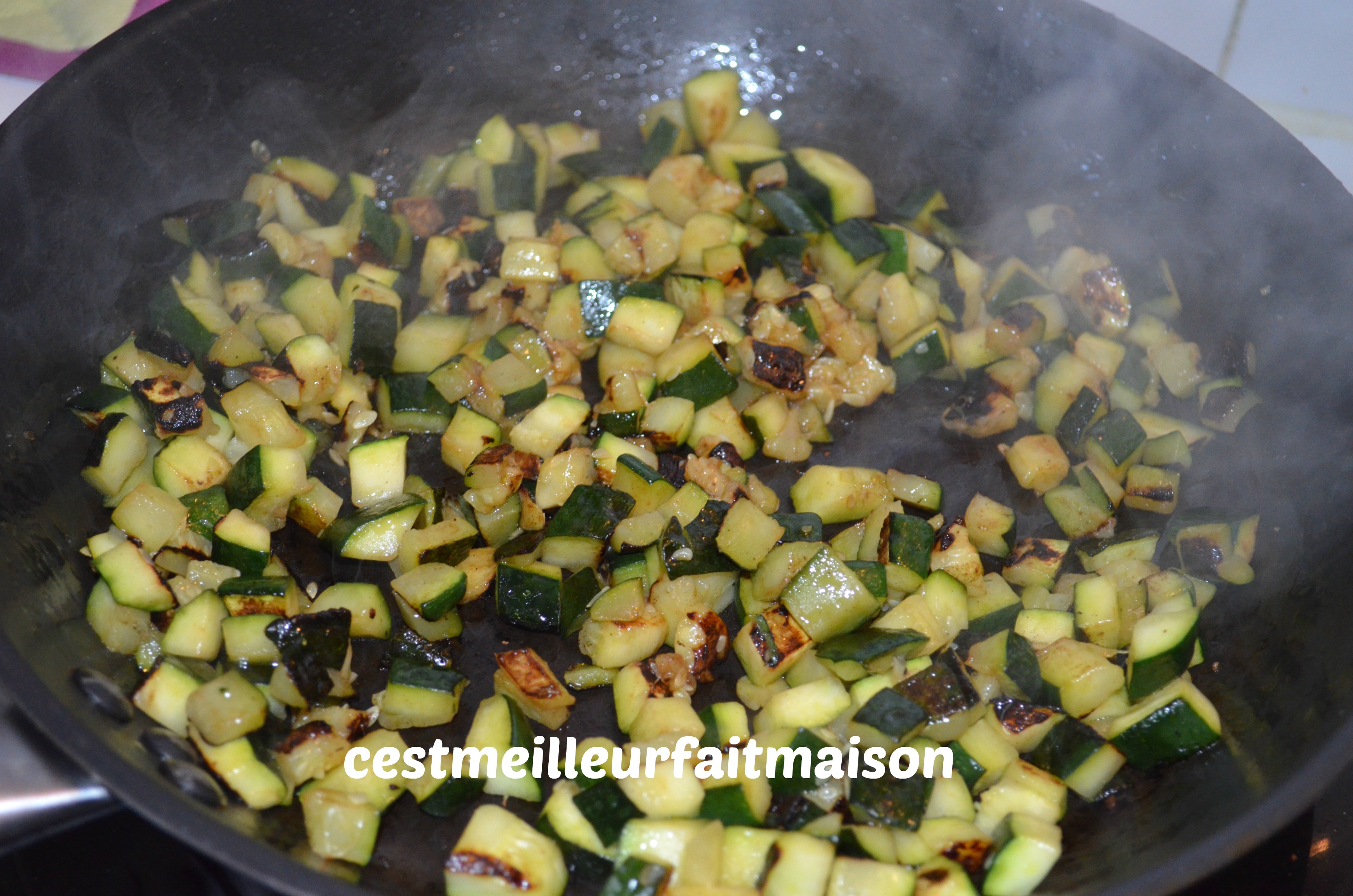 Dans la même poêle, ajouter 2 cs d’huile d’olive et les dès de courgettes. Faire revenir pendant 15 min. Saler et poivrer. Réserver les courgettes sur du papier absorbant.