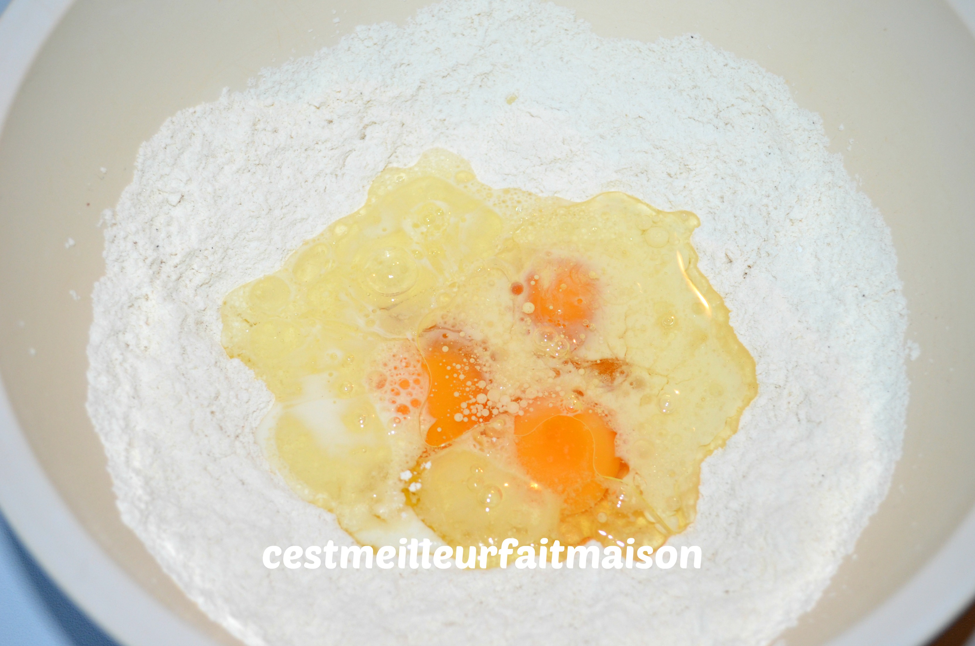 Dans un saladier, mélanger la farine, la levure le sel et le poivre. Faire un puits et ajouter les œufs, le lait et les 10 cl d’huile. Mélanger au fouet.