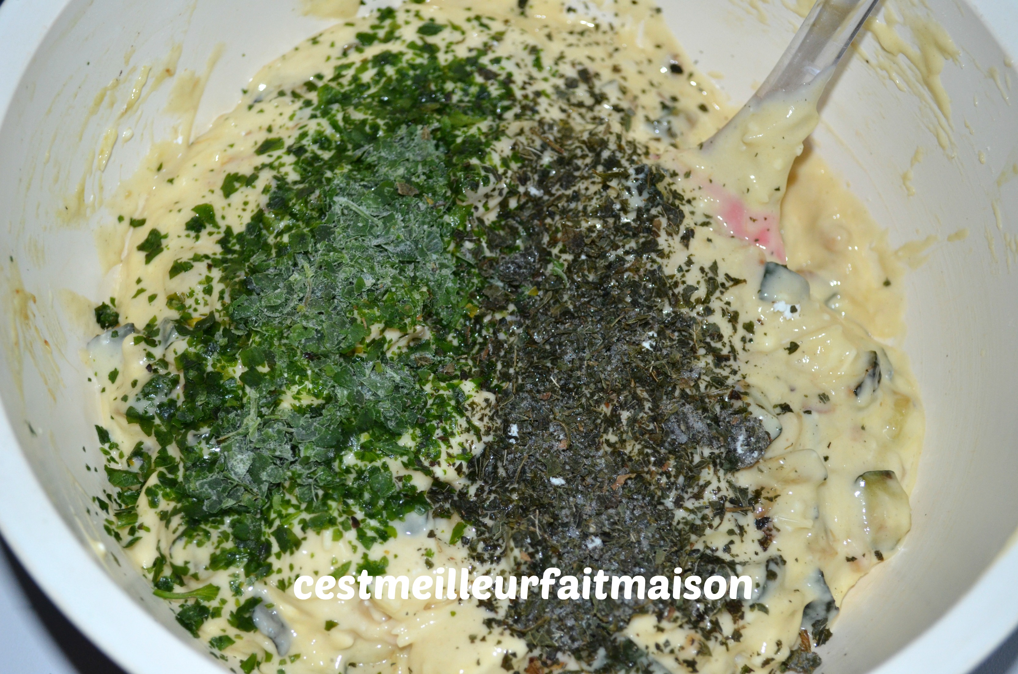 5- Ajouter les herbes hachées et mélanger. Verser dans un moule à cake.