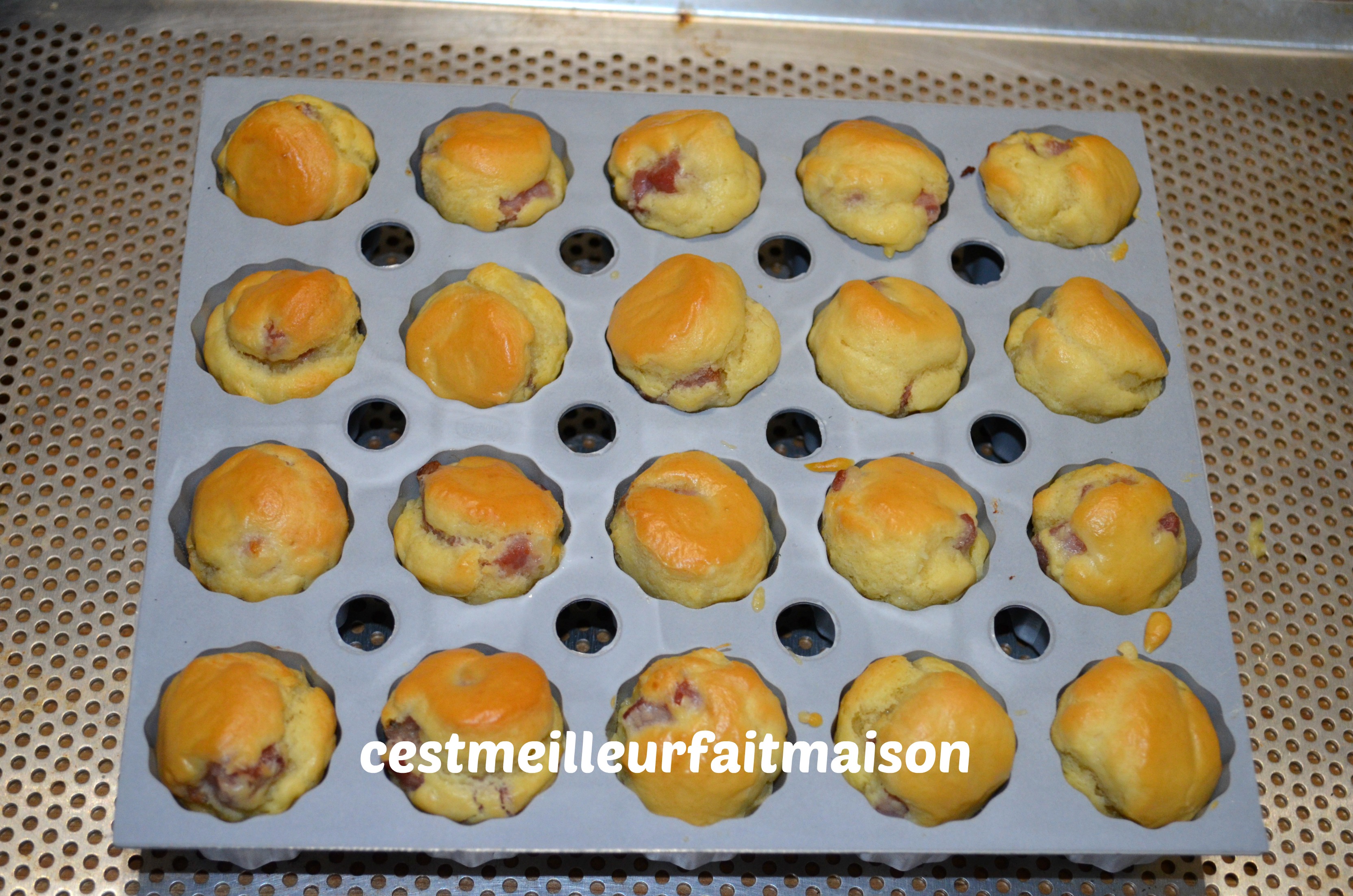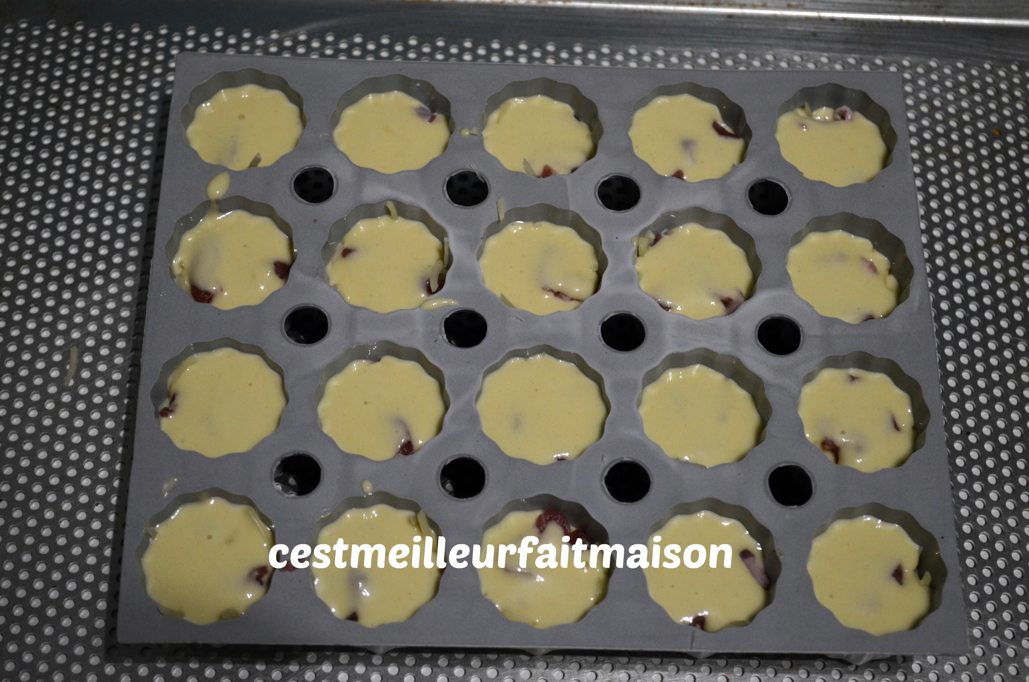Verser un peu de préparation au fond de chaque empreintes, mettre un peu de lardon (pour cette fois j’ai mis aussi un peu de fromage râpé), recouvrir de pâte, remettre des lardons et finir par de la pâte en faisant en sorte que les empreintes ne soient remplies qu’au 2/3.