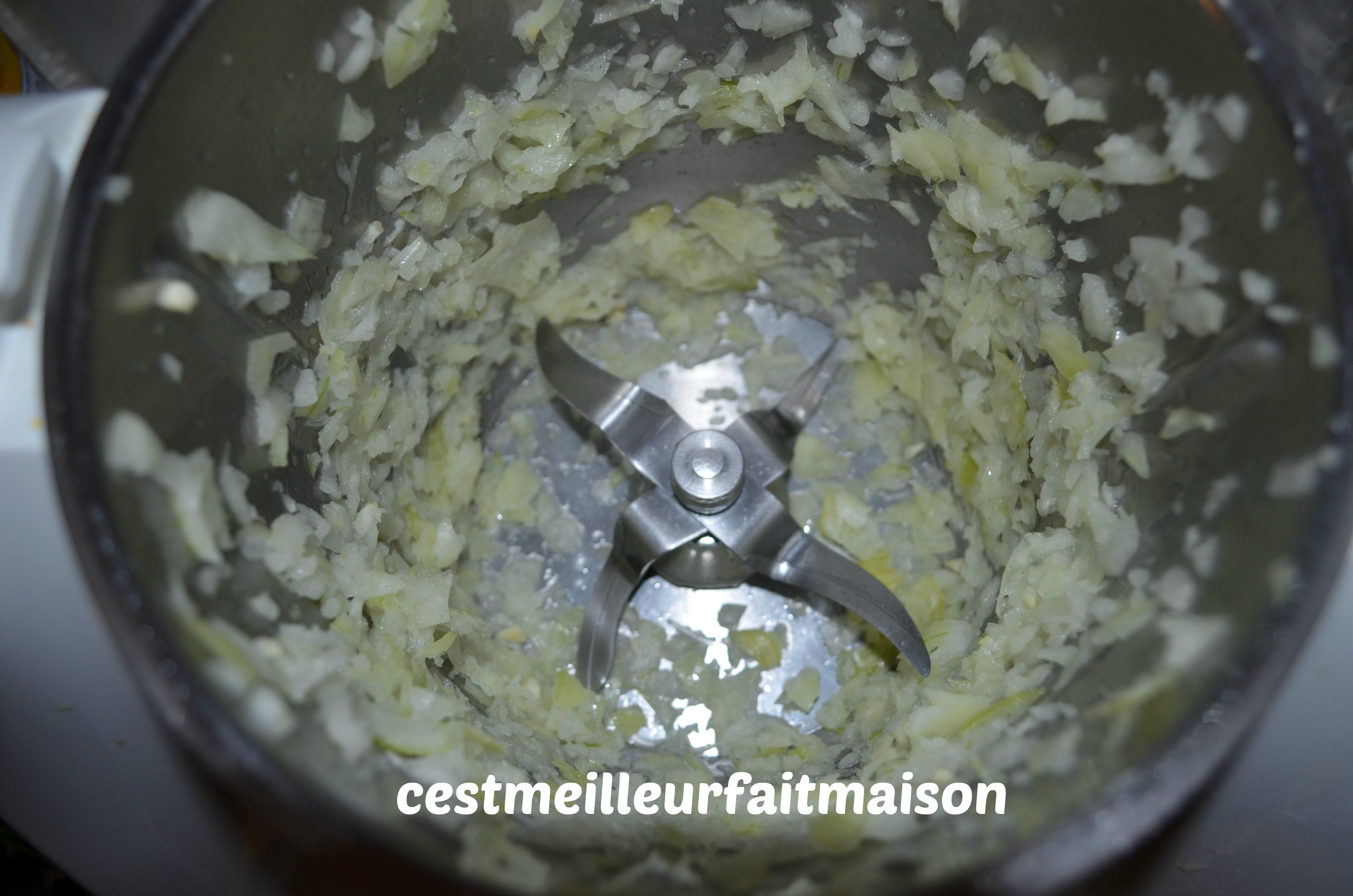 1- Couper l’oignon en 4 et le mettre dans le bol du Thermomix. Mixer 5 sec/Vit 5.