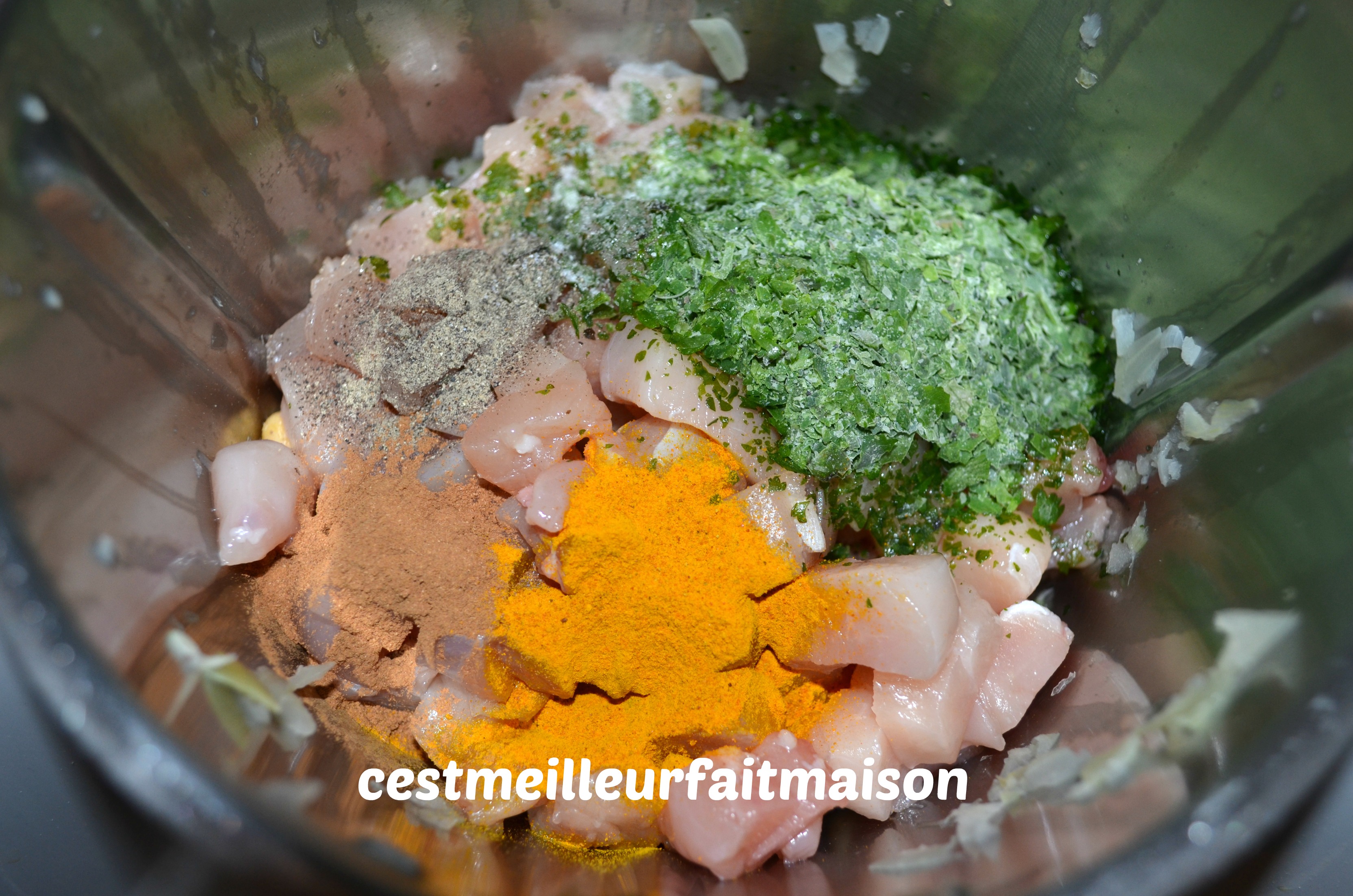 4- Mettre les pois chiches dans le bols du thermomix, ajouter la viande viande, la coriandre, la cannelle, le curcuma, le bouillon cube, le sel et le poivre. Ajouter de l’eau jusqu’au 3/4 du bol.