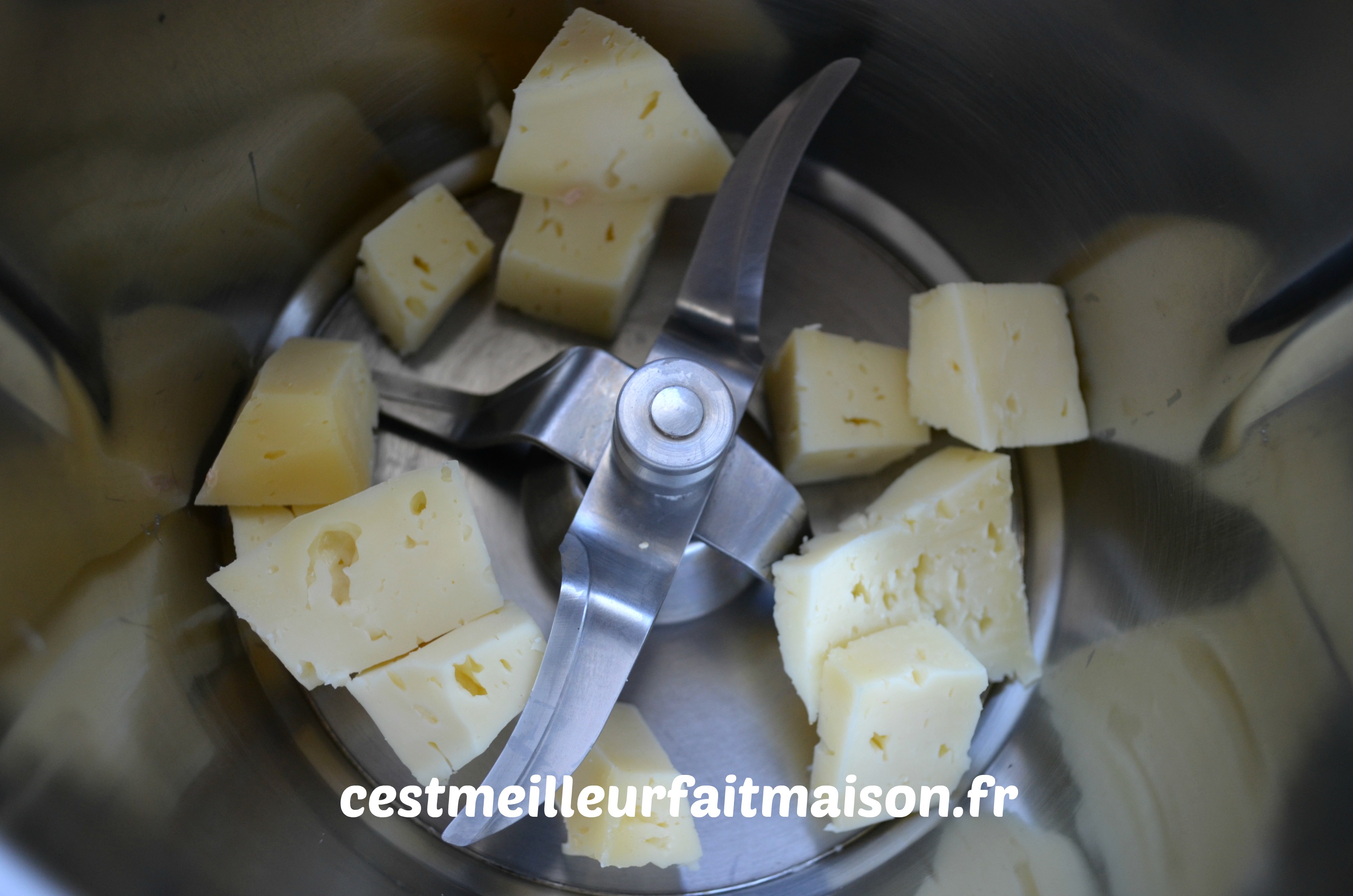 2- Dans le bol du Thermomix, mettre 75 g de fromage coupé en cube. Mixer 5 sec/Vit 8.