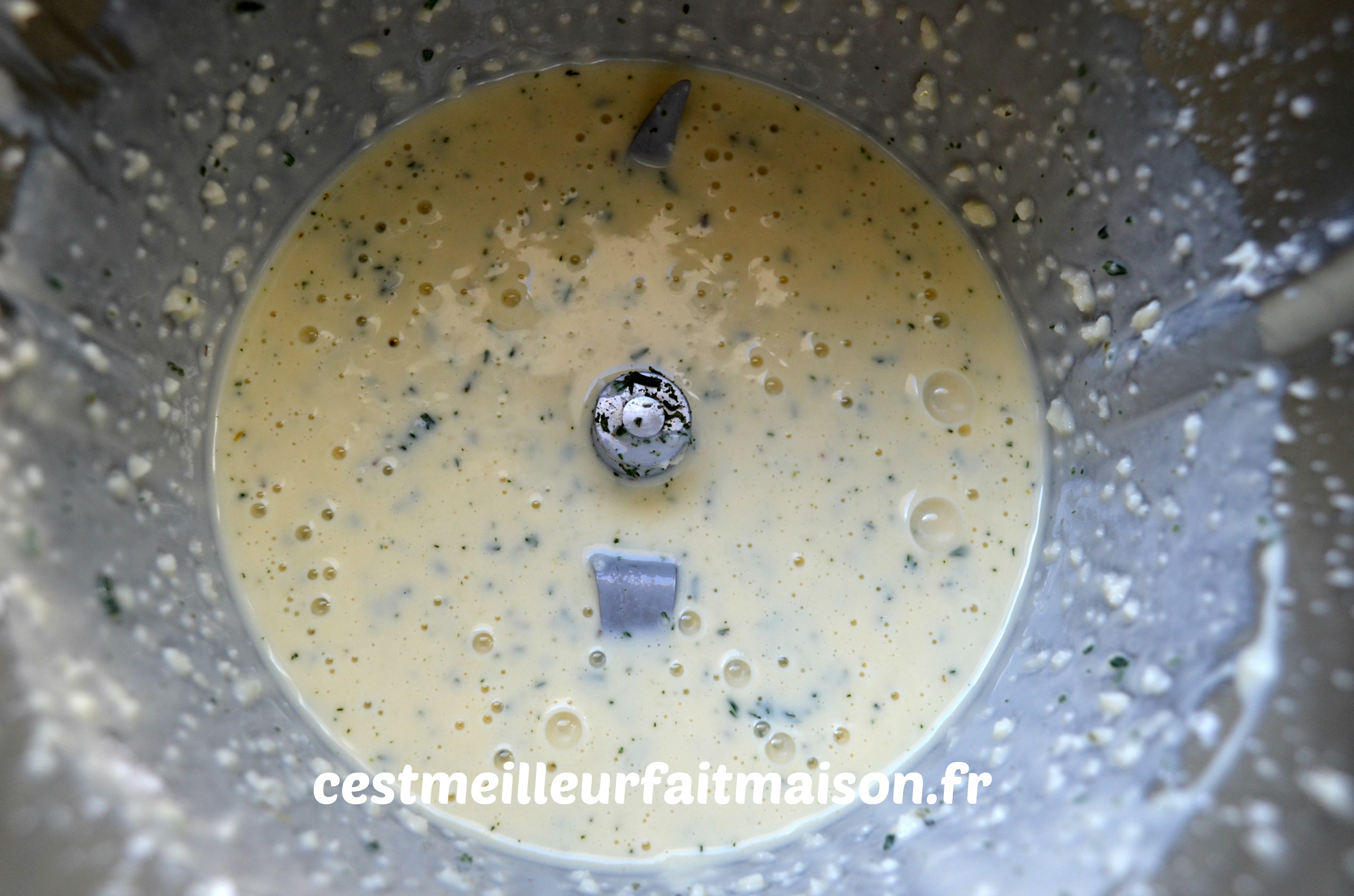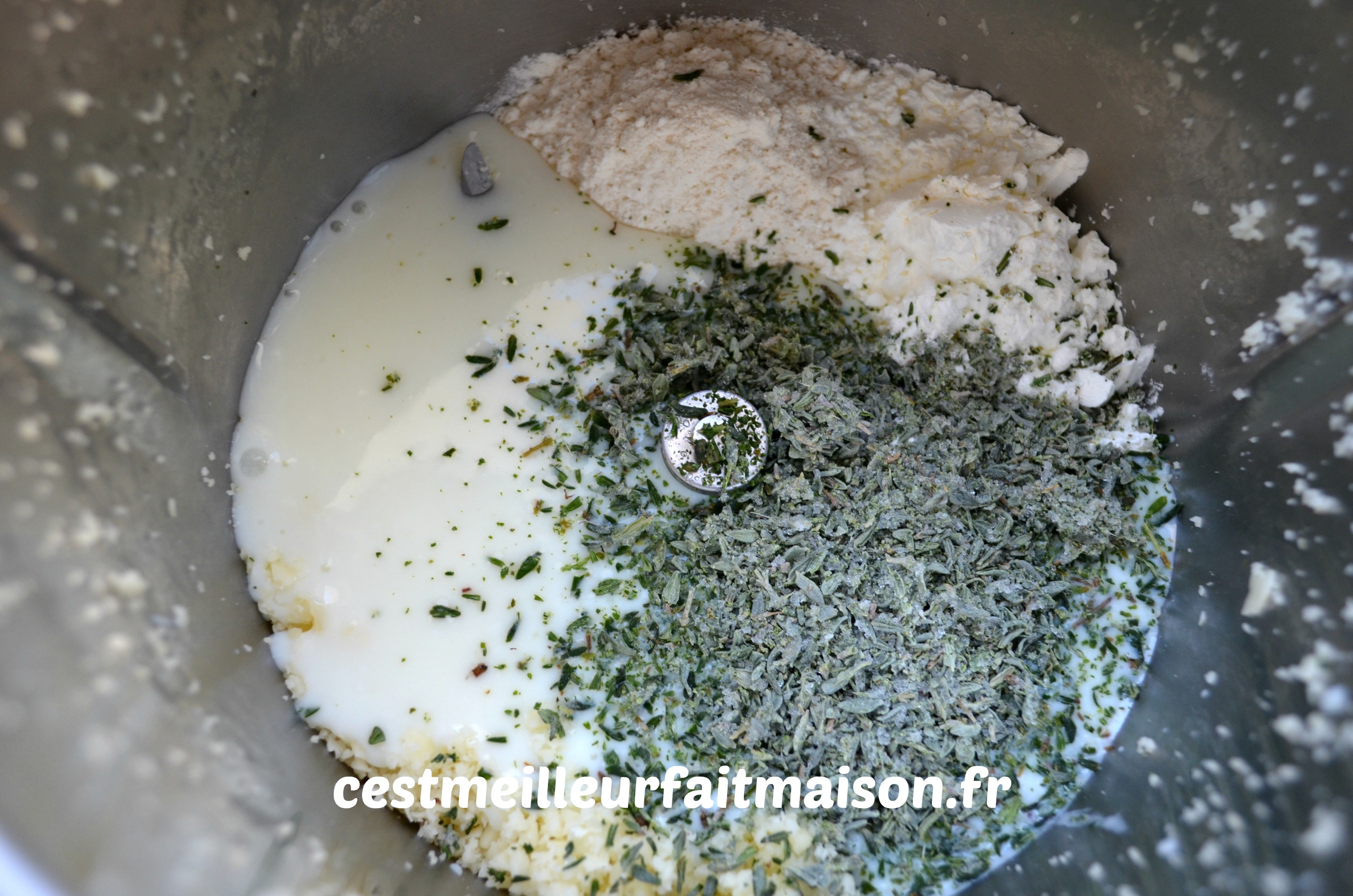 3- Ajouter les œufs, la farine, le lait Ribot, le thym, le sel et le poivre. Mélanger 10 sec/Vit 3. Racler les bords avec la spatule et mixer à nouveau 10 sec/Vit 3.