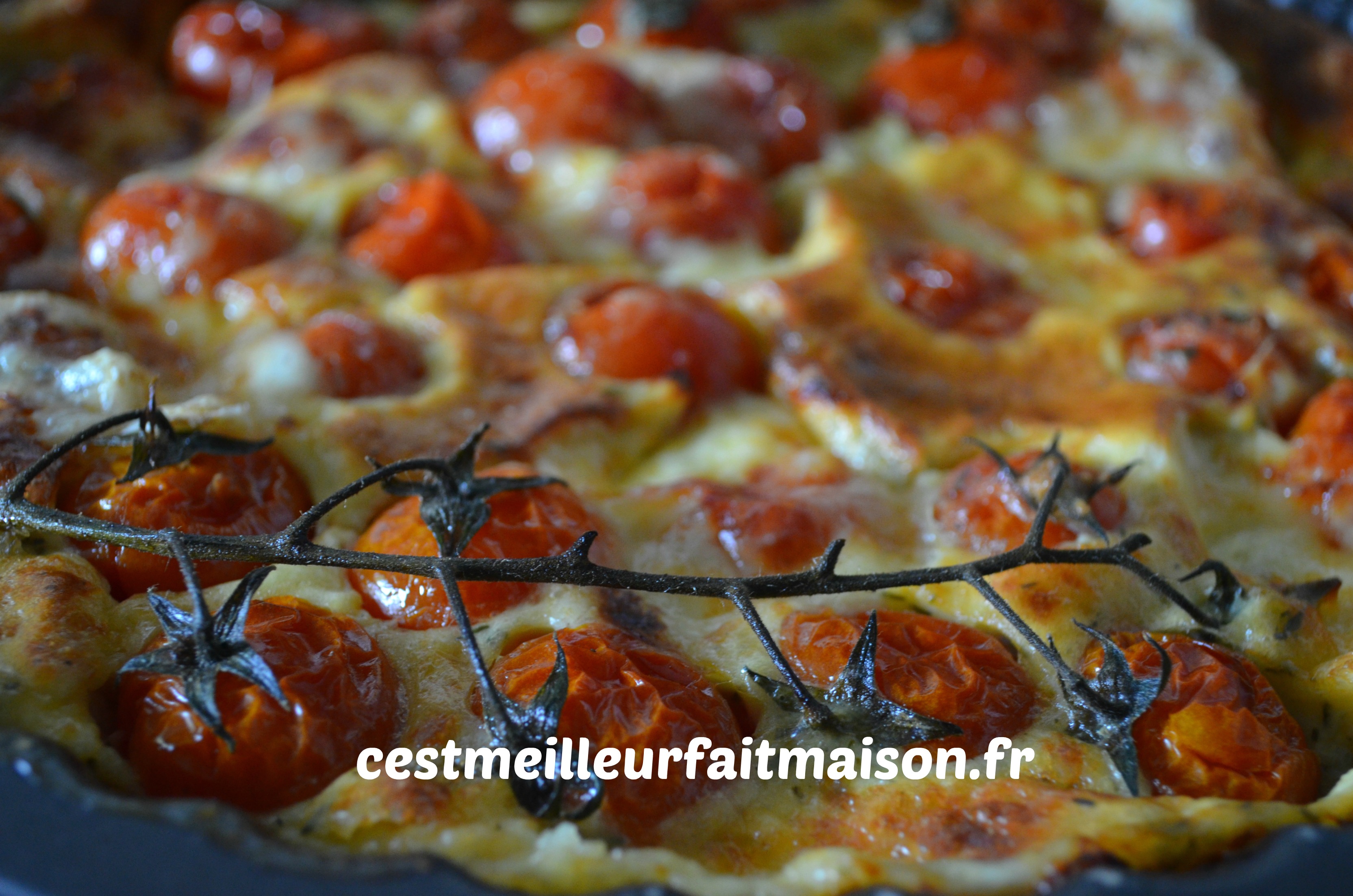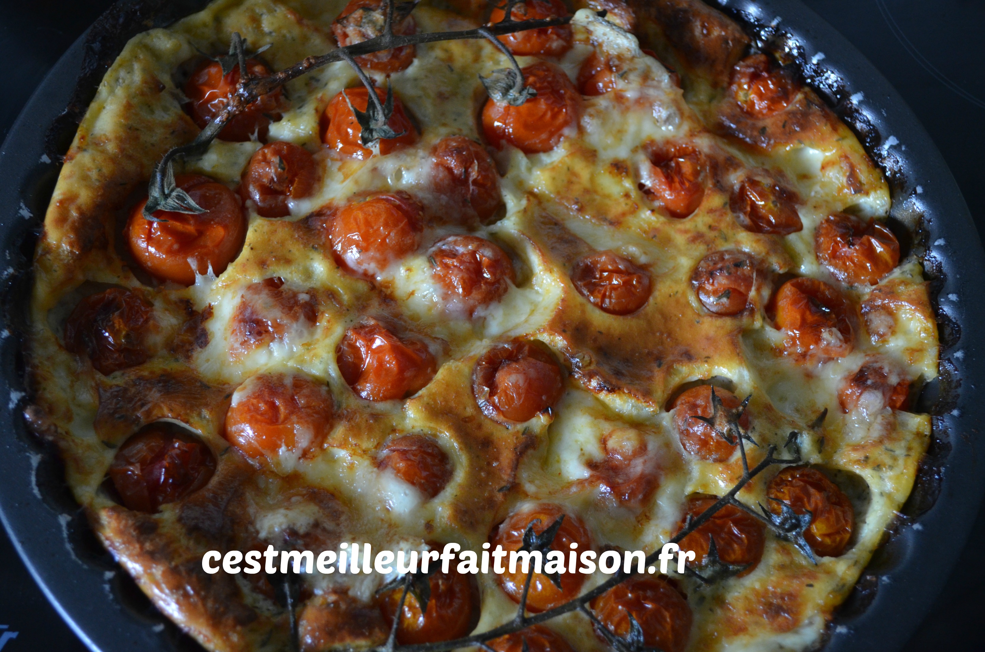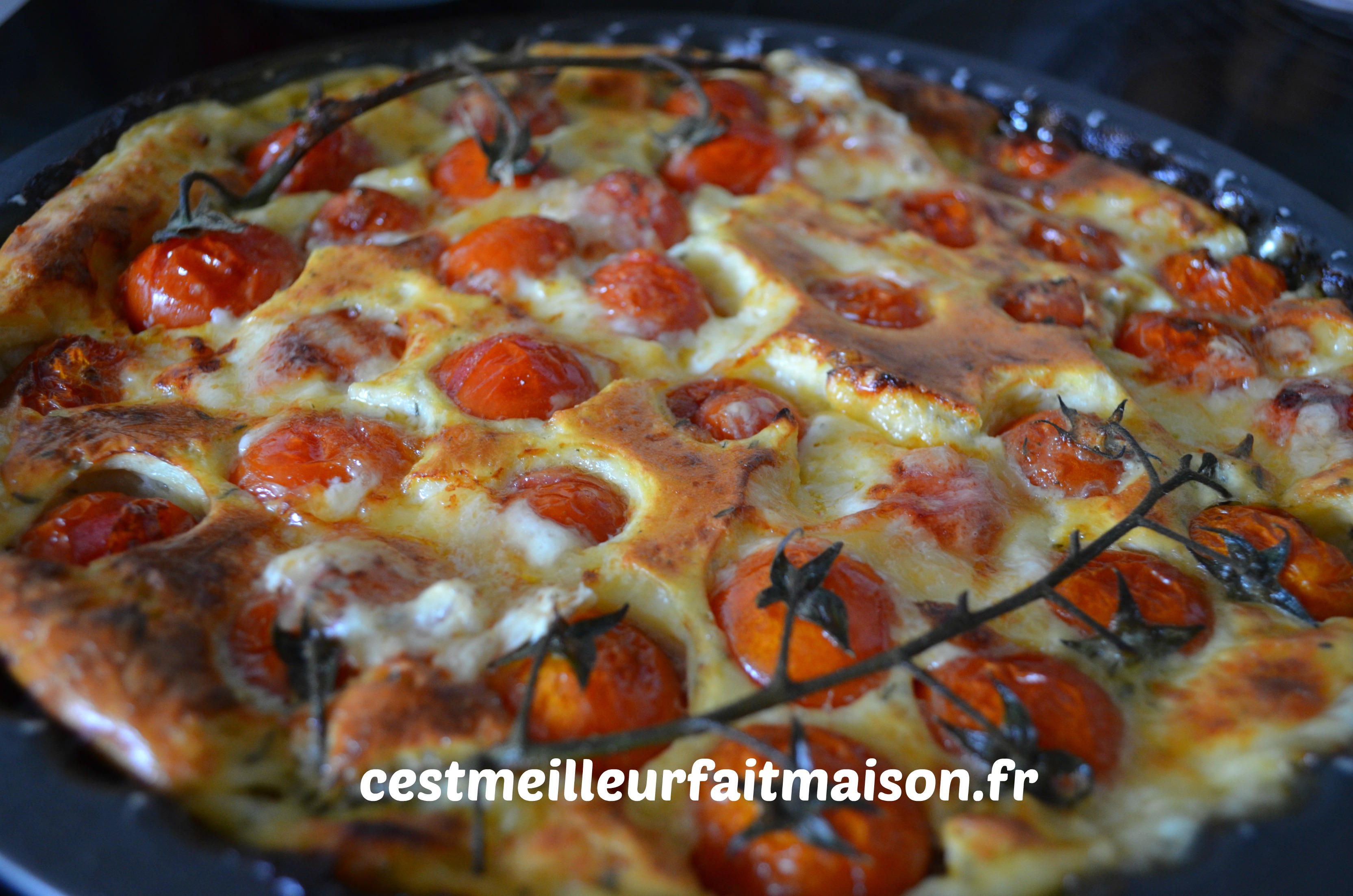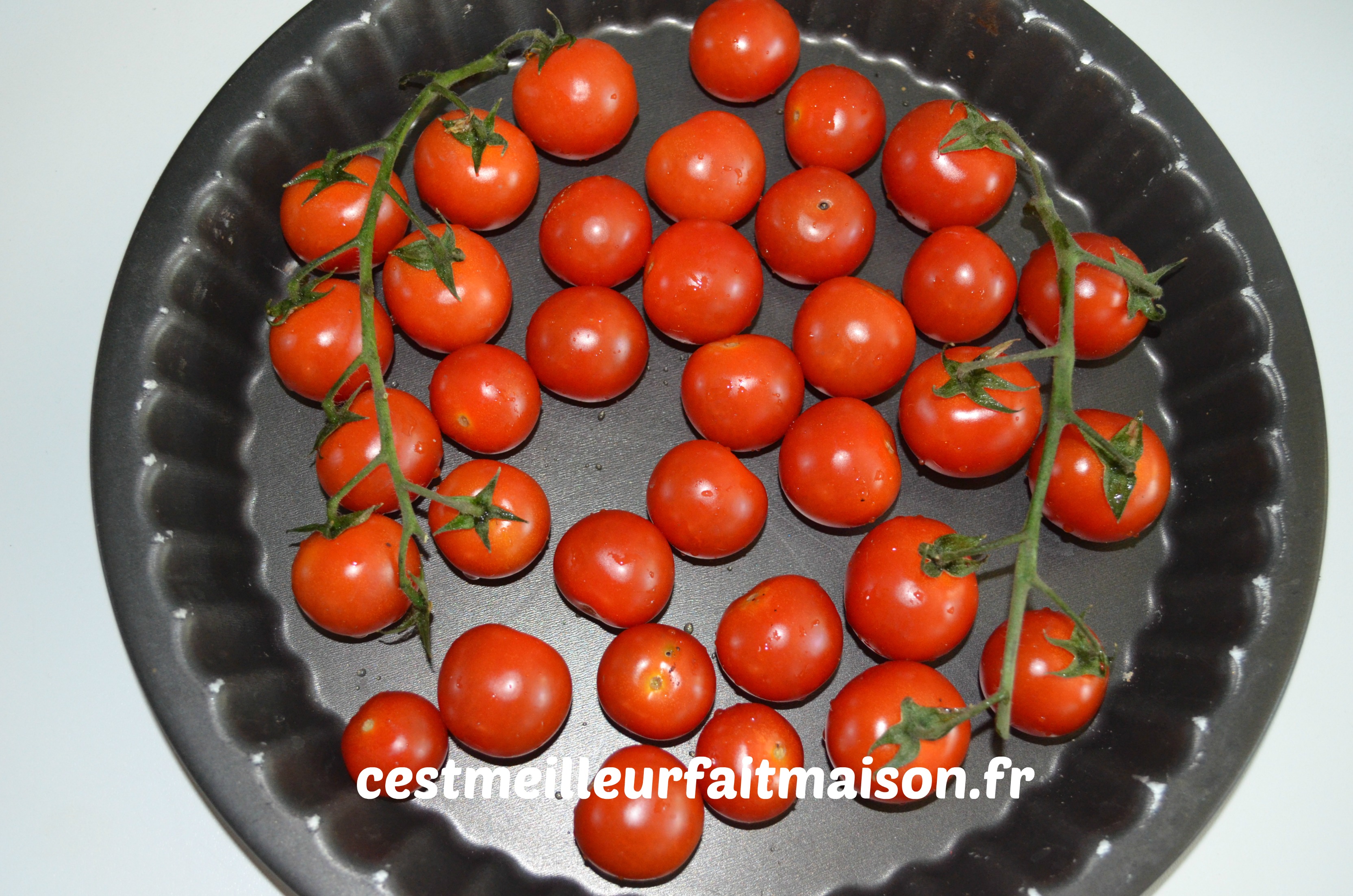 Rincer les tomates et les mettre dans un plat à tarte antiadhésif. J’ai pris un moule de 26 cm de diamètre.