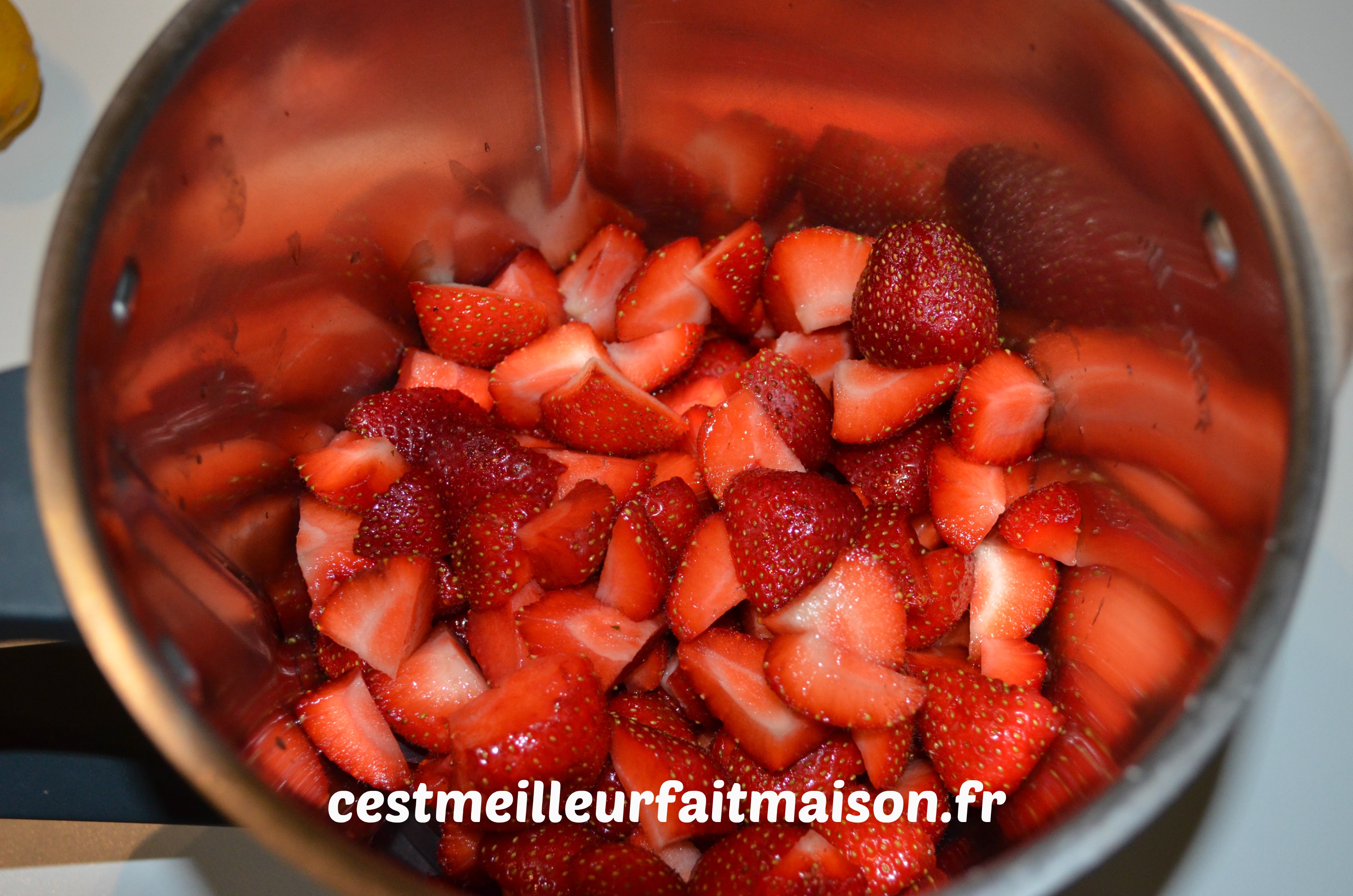 1- Laver et couper les fraises en quatre et les mettre dans le bol du Thermomix. Ajouter 300 g de sucre.