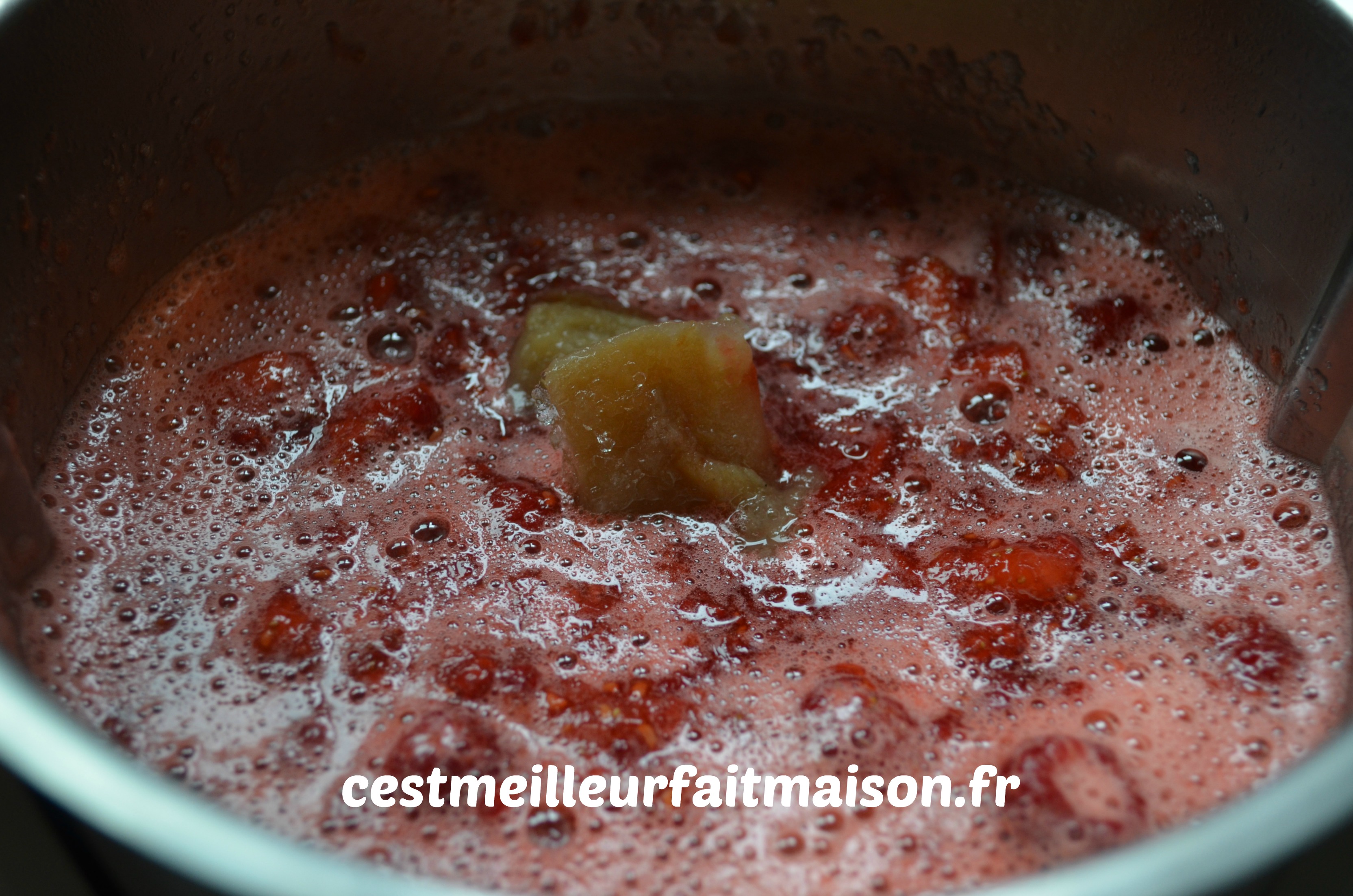 Il y avait des fraises et des framboises à profusion à la cueillette. J’en suis donc revenue avec plusieurs kilo de fraises et un peu moins de framboises (c’est plus long à cueillir). J’en ai profité pour commencer la saison des confitures. J’ai utilisé de la pectine de pomme fait maison. L’année dernière, j’avais fait de la gelée de pomme au cidre et j’avais conservé la chair des pommes pour m’en servir dans les confitures qui ne gélifient pas sans aide. J’ai mis cette purée dans des cubes à glaçons.