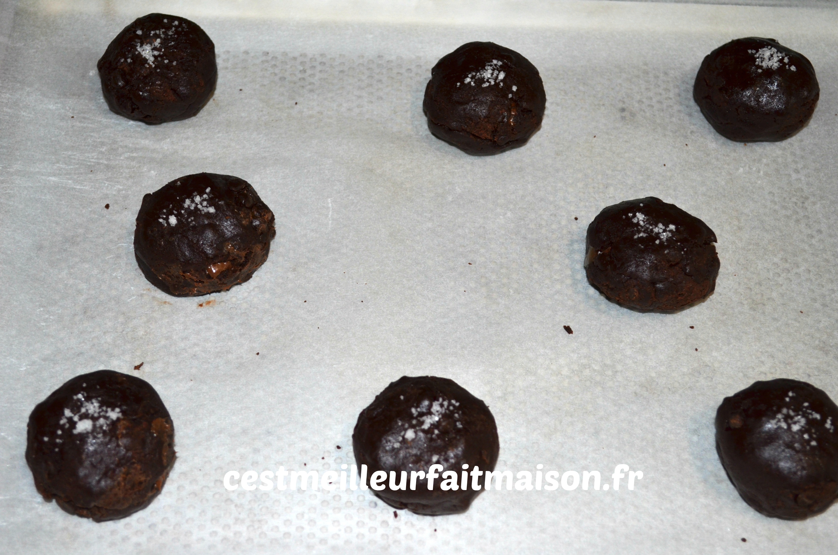 11- Ajouter un peu de fleur de sel sur les cookies. Je ne l’ai fait que sur 8 car je ne savais pas trop si cela plairait. La prochaine fois, j’en mettrais sur tous les cookies.