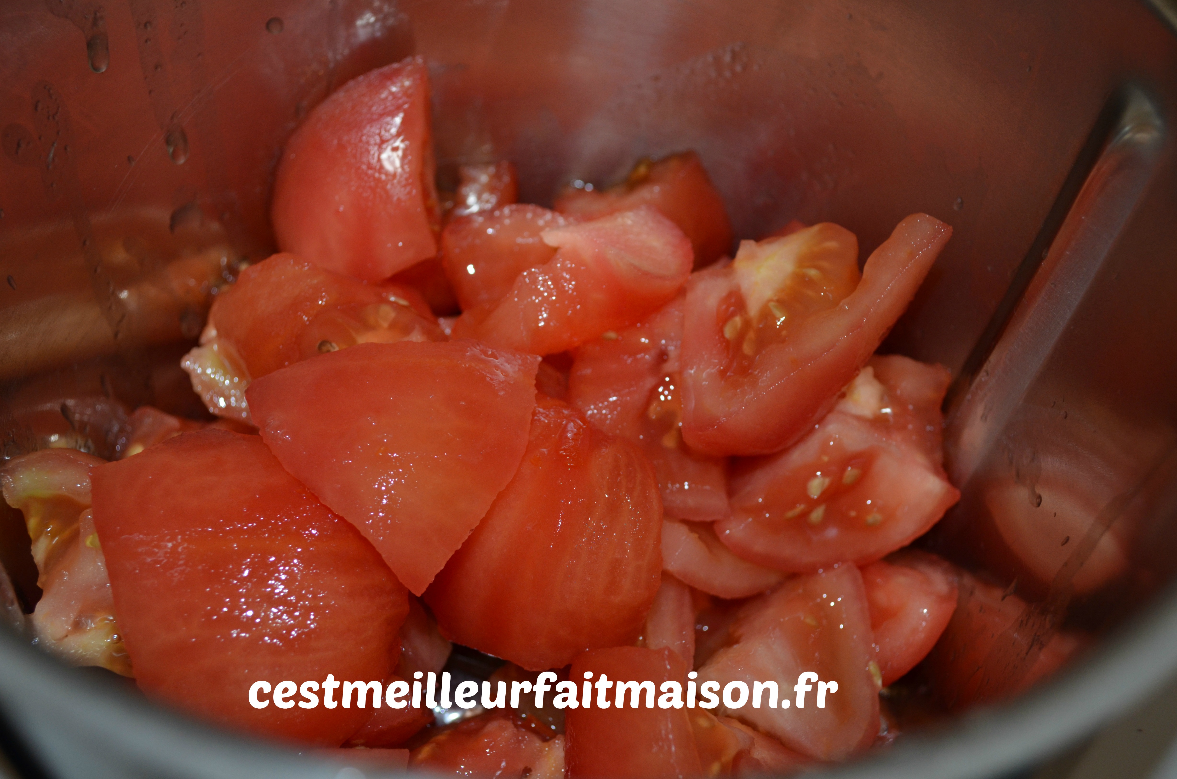 1- Eplucher les tomates, les couper grossièrement et les mettre dans le bol du Thermomix. Enlever ou non les pépins en fonction de votre goût. J’ai essayé avec ou sans et pour moi c’est pareil.