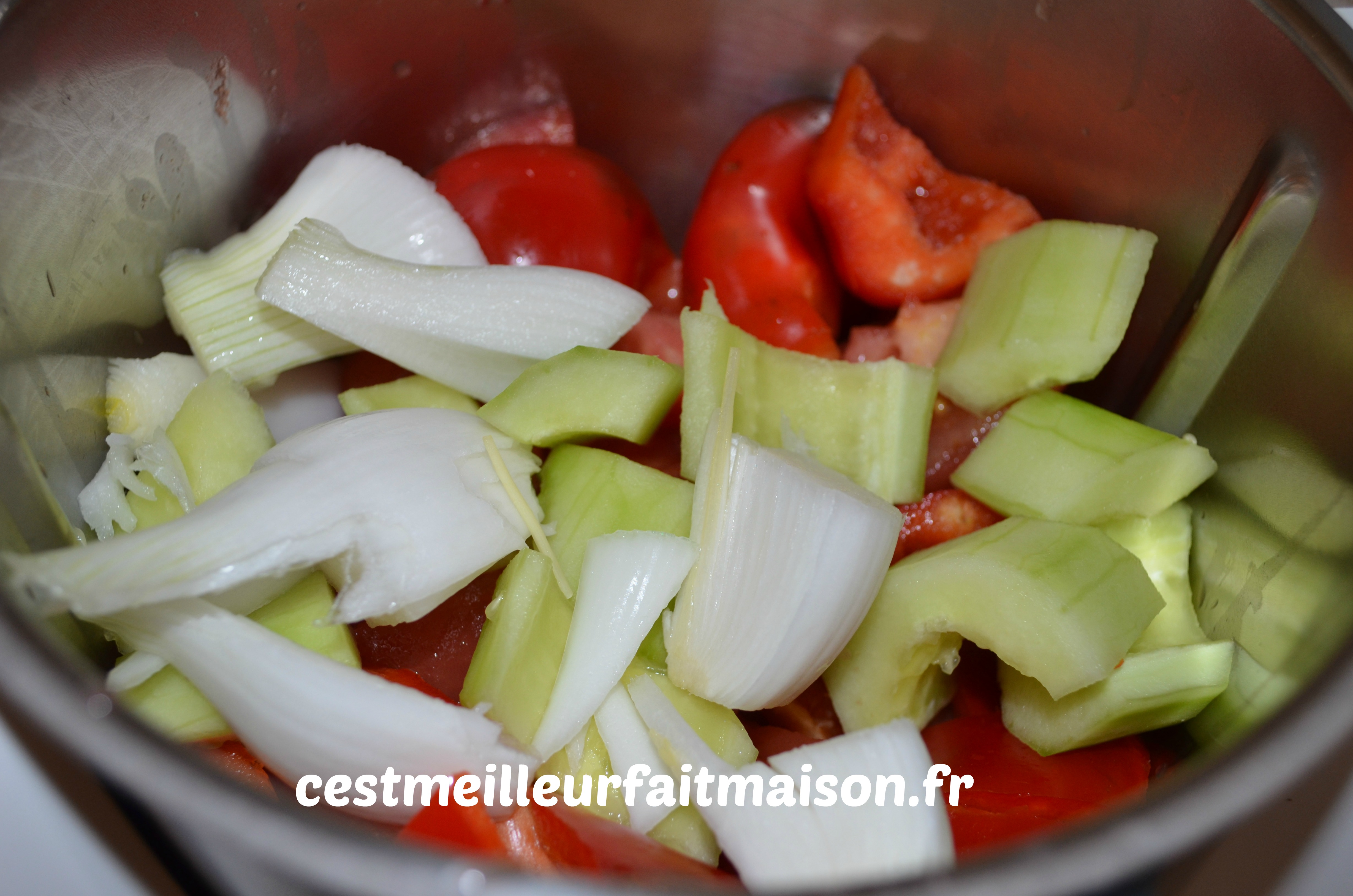 2- Eplucher et épépiner le concombre. Le couper en morceau et l’ajouter dans le bol. Faire de même avec le poivron, l’oignon et l’ail.