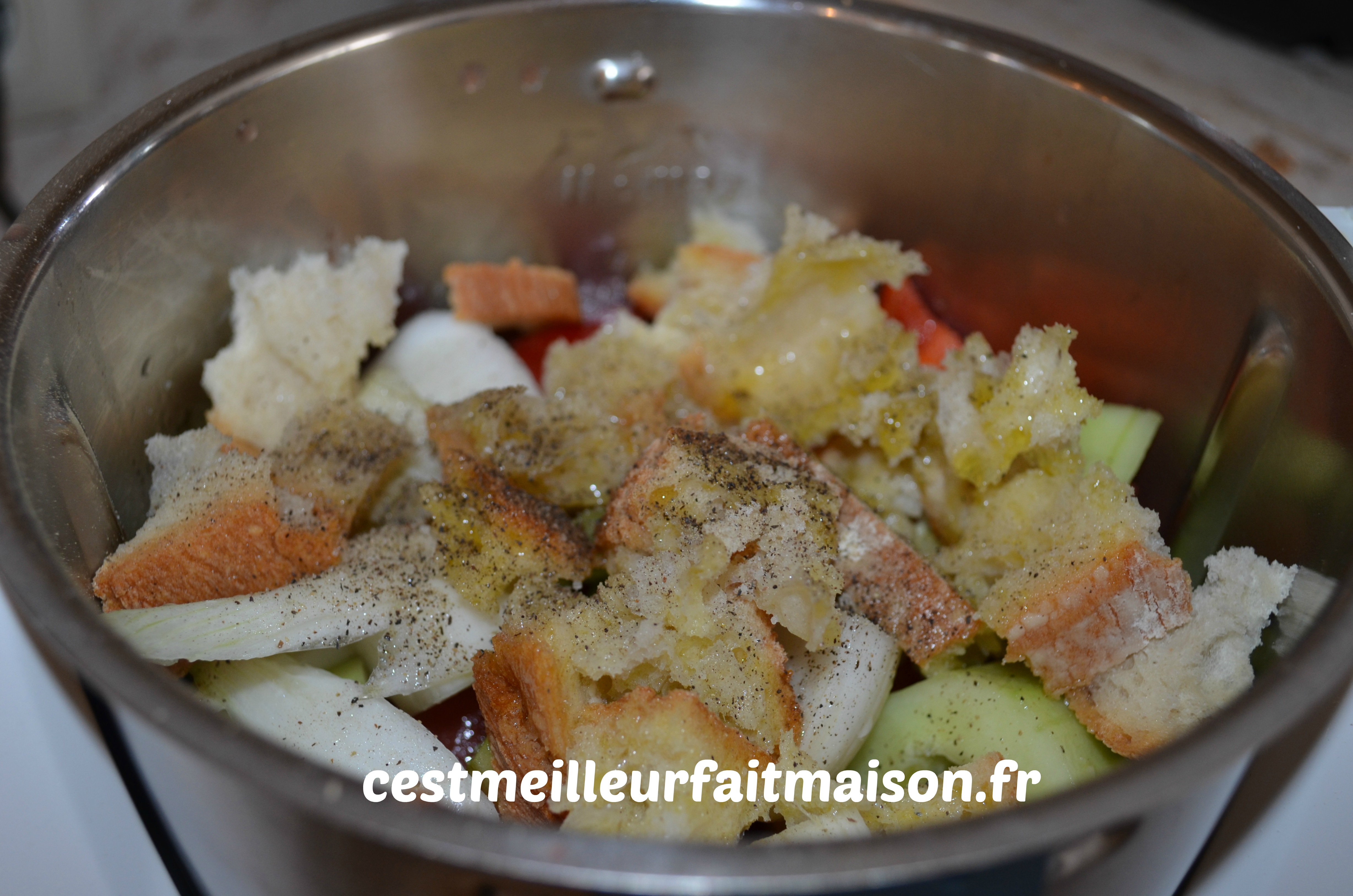 3- Ajouter le pain coupé en morceaux, le sel, le poivre, le vinaigre, l’huile et l’eau. Mixer pendant 2 min de la vitesse 5 à la vitesse 10.