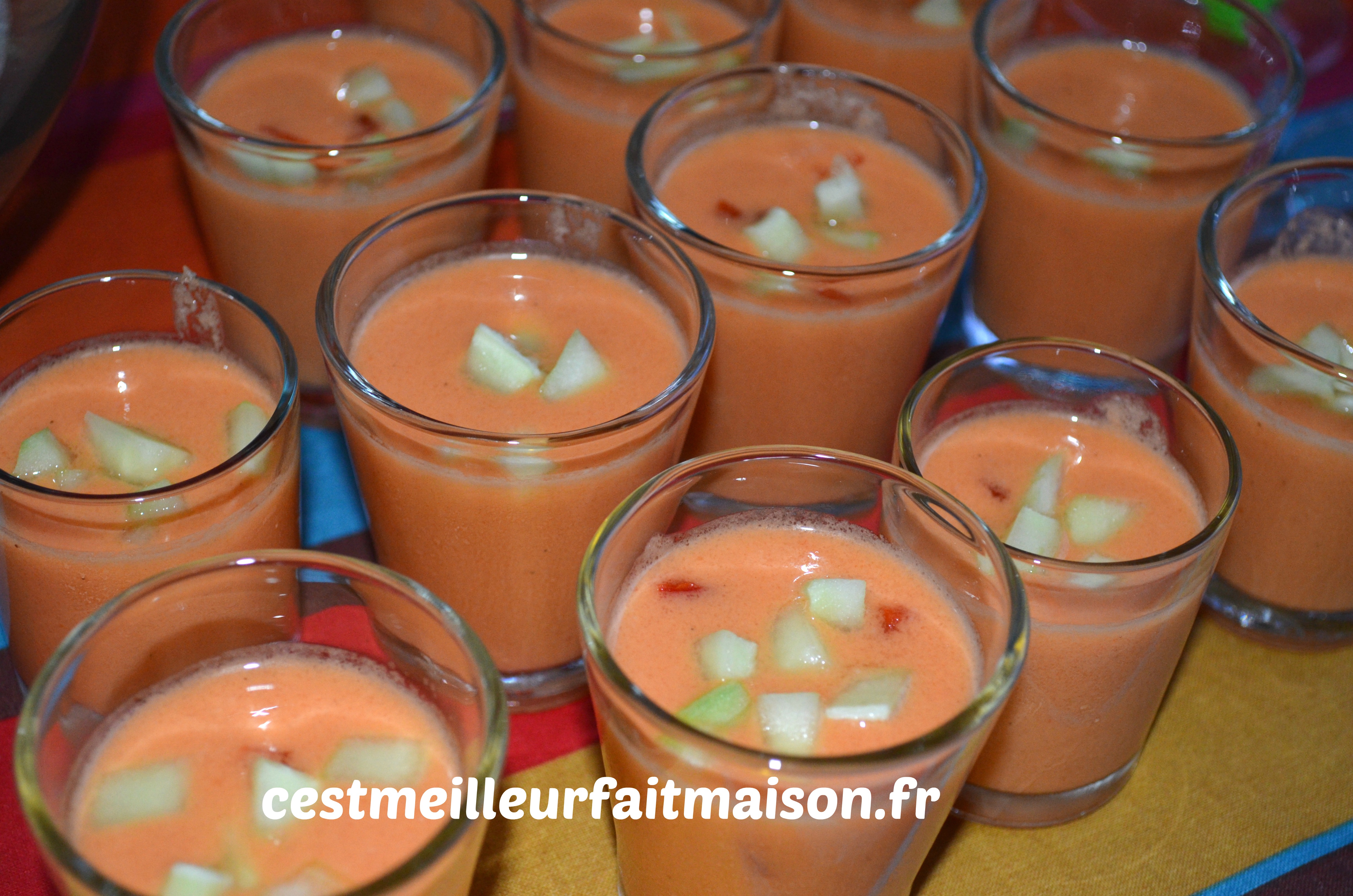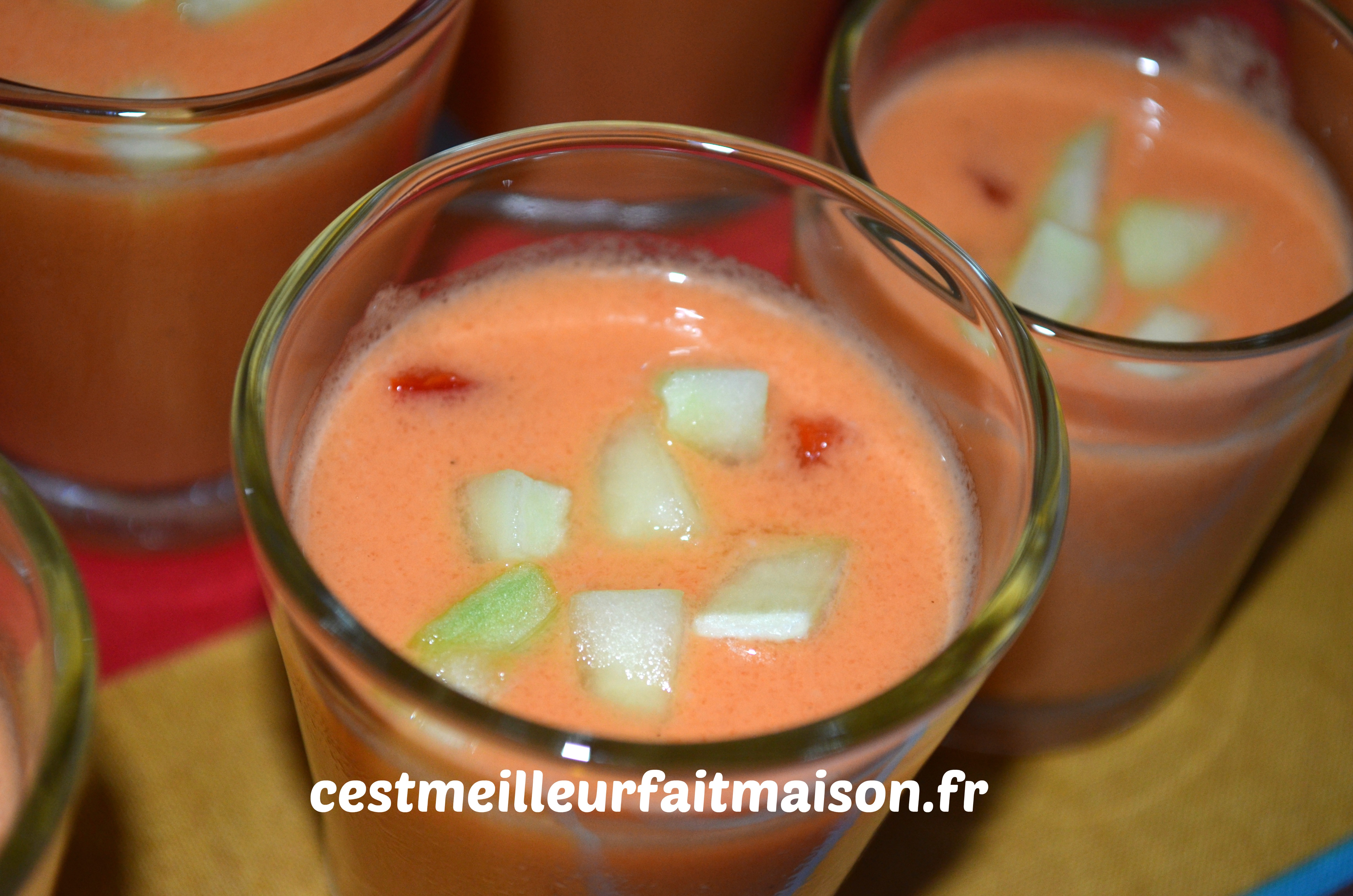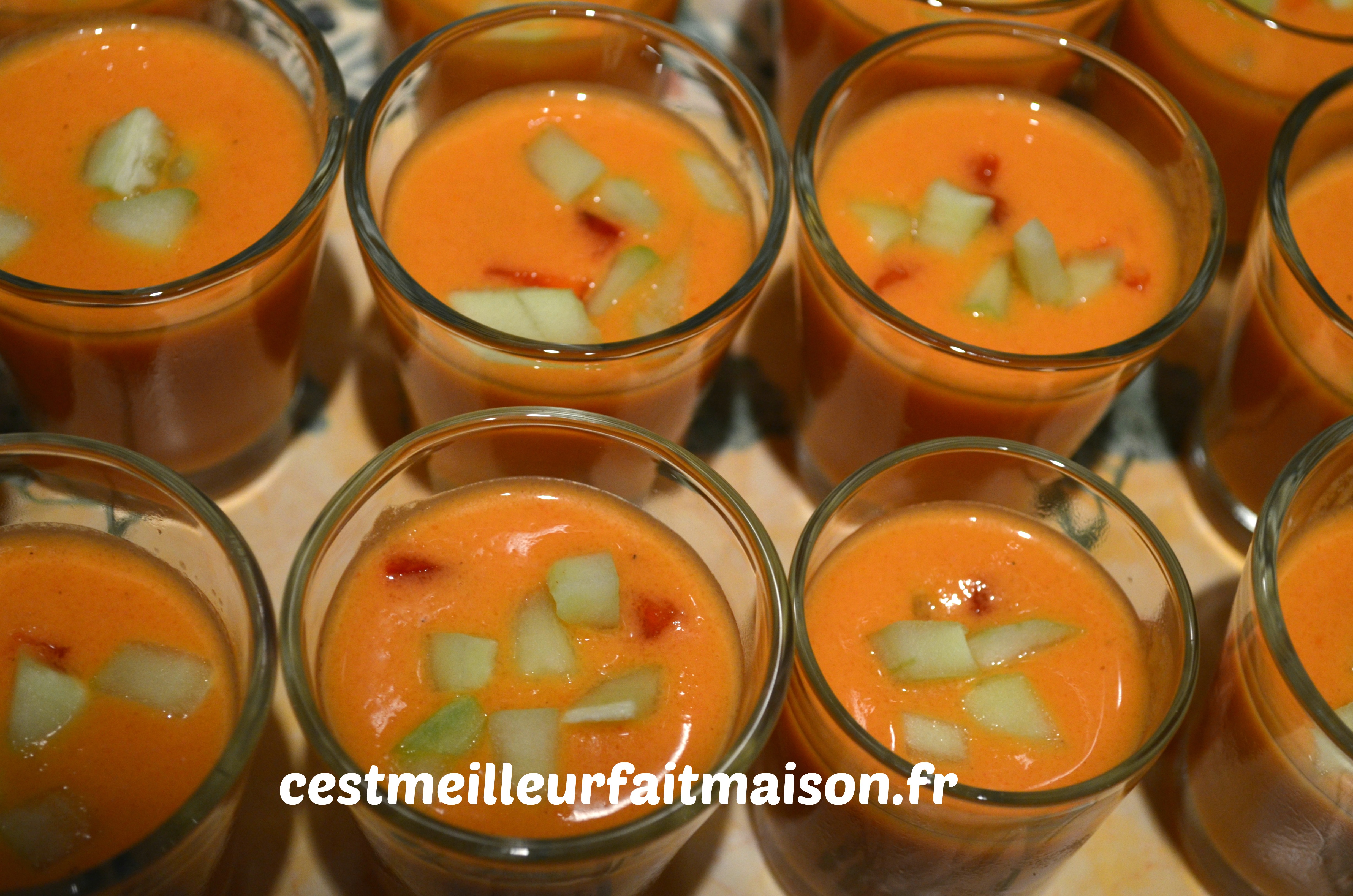 Avec cette chaleur, je continue dans les recettes rafraîchissantes. Aujourd’hui, c’est gaspacho! Au Thermomix pour moi et au blender pour celles et ceux qui n’ont pas le Thermomix. On peut servir le gaspacho dans des verrines pour l’apéritif ou dans des assiettes creuses en guise d’entrée.