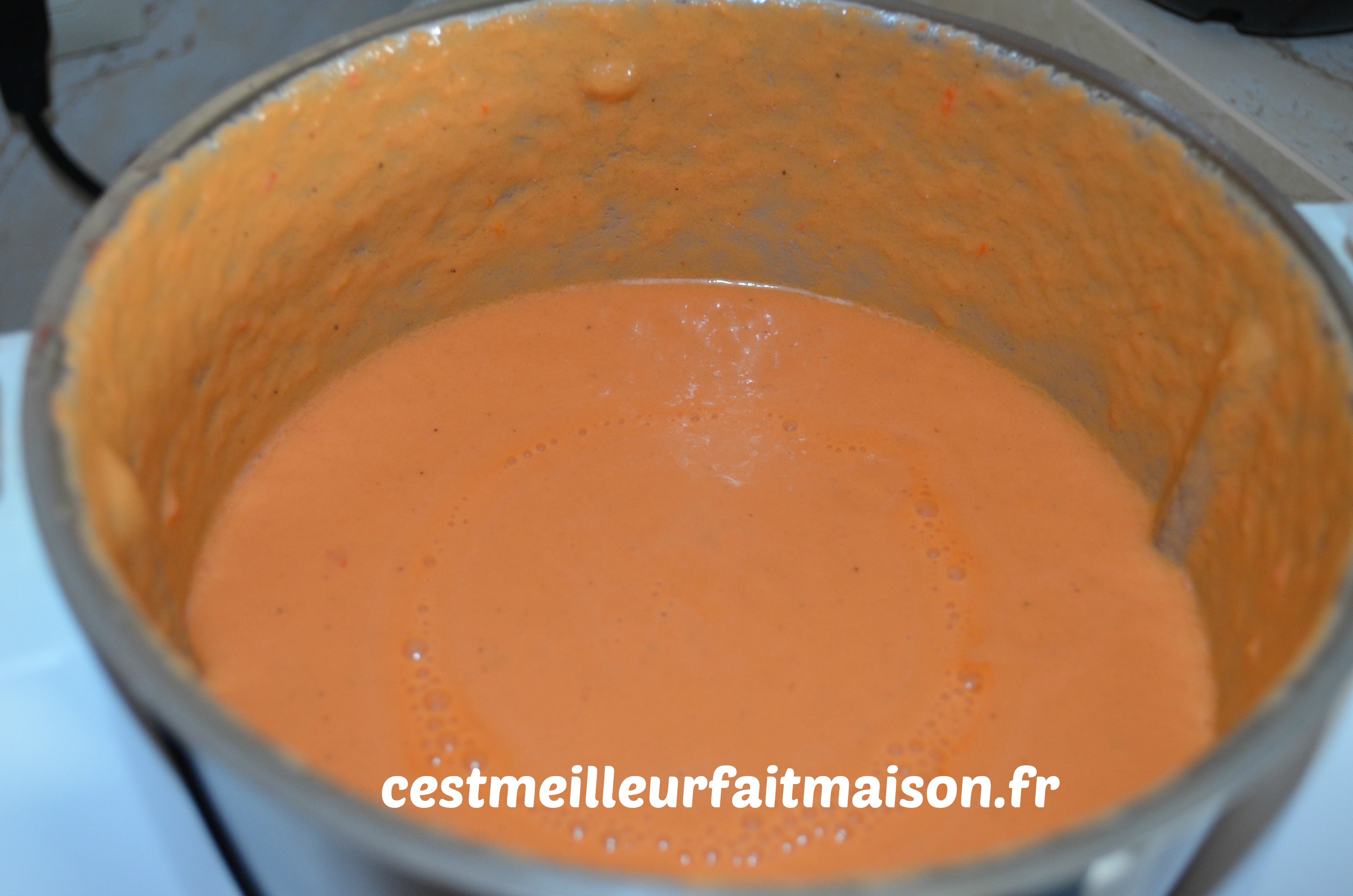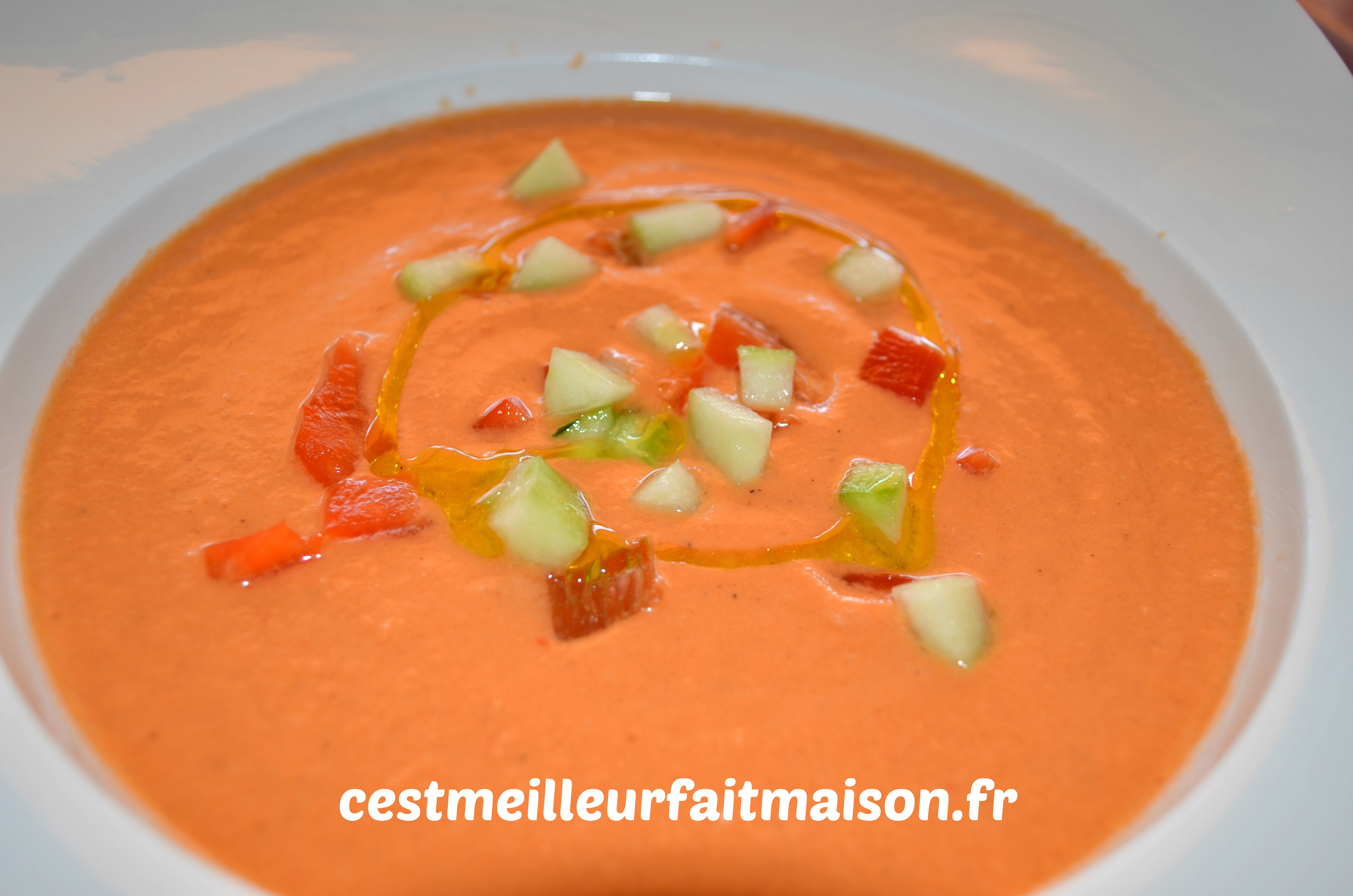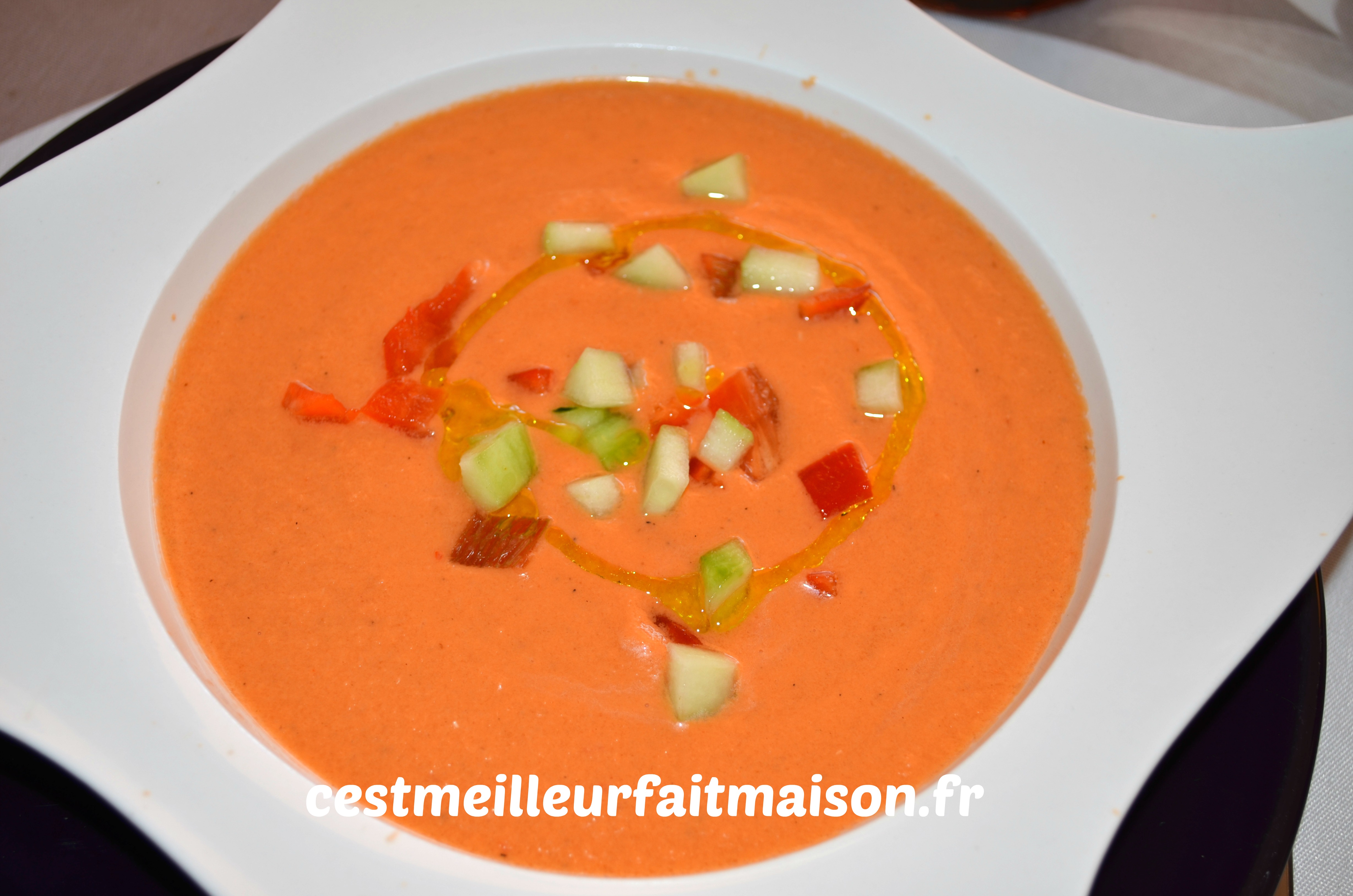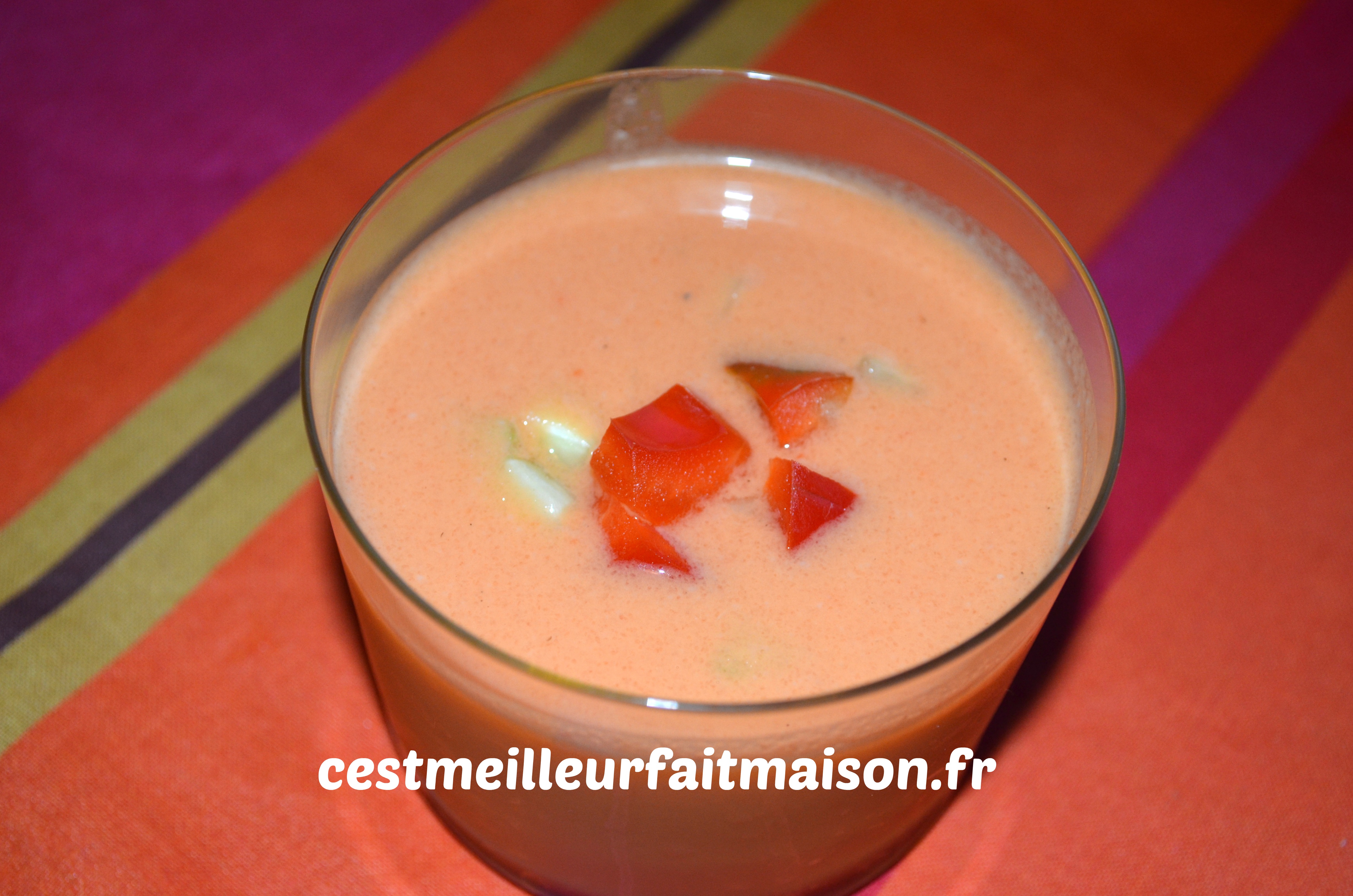 4- Si la texture vous convient, mettre le gaspacho au frais plusieurs heures avant de le servir. Vous pouvez aussi le passer à la moulinette à légumes avant la réfrigération. Servir le gaspacho avec des dés de concombre et de poivron.