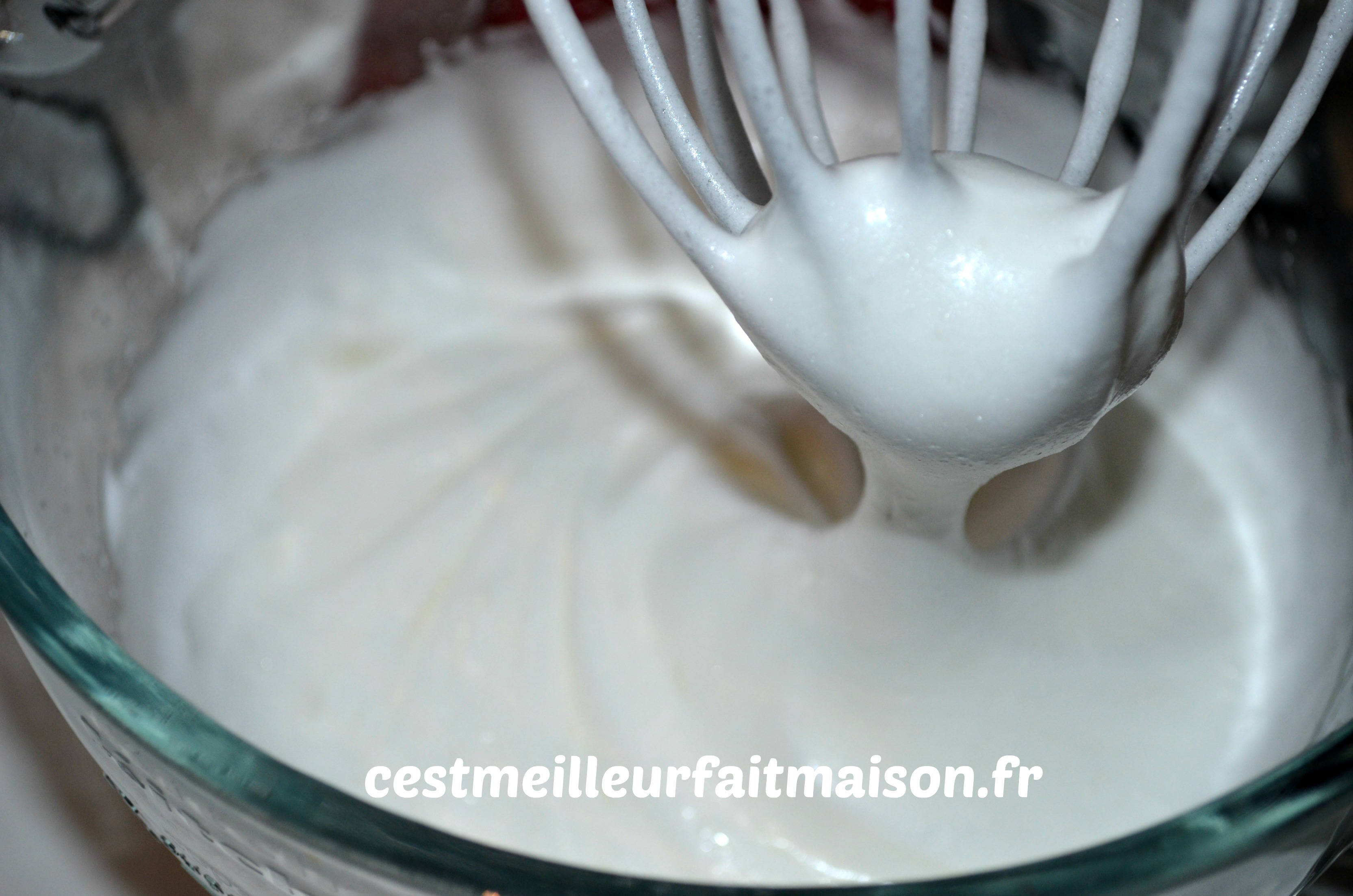 Monter les blancs en neige et ajouter, en trois fois, le sucre en poudre.