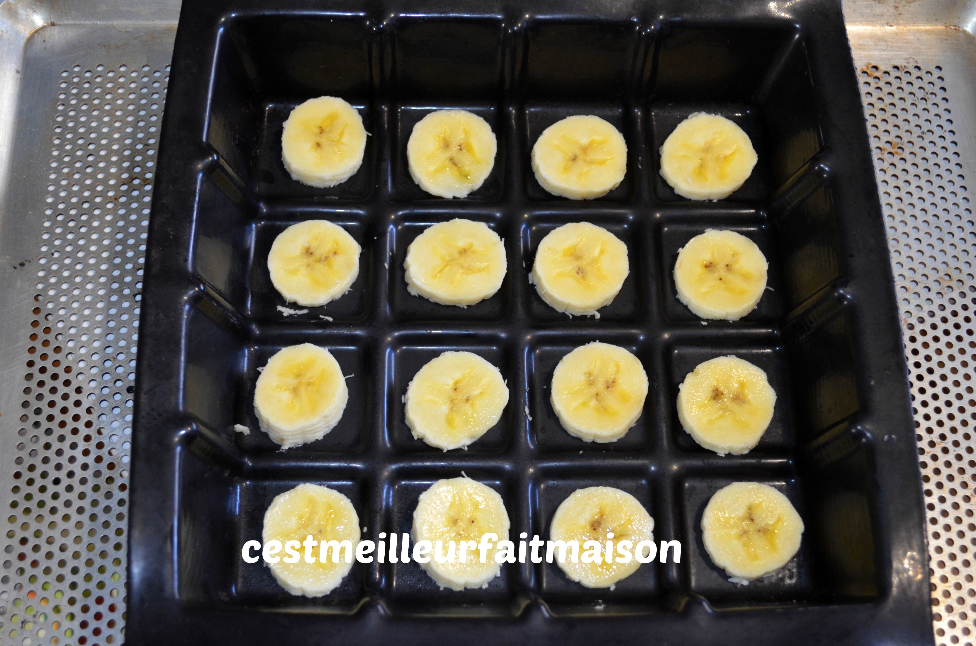 3- Couper 16 rondelles de banane et les disposer dans les carrés du moule tablette.