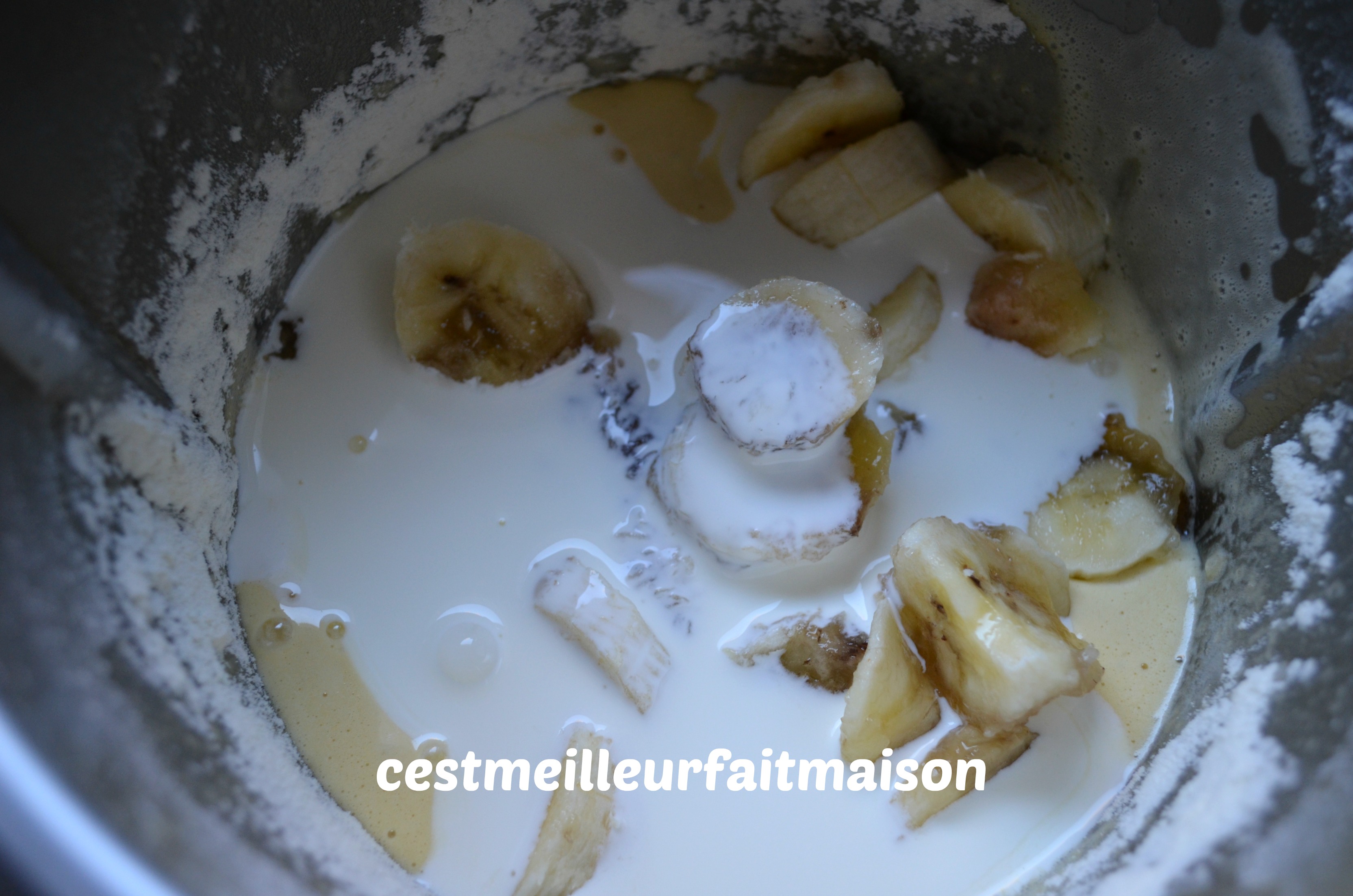4- Couper le reste des bananes et les ajouter à la préparation dans le bol du Thermomix avec la crème liquide. Mixer 15 sec/Vit 2.