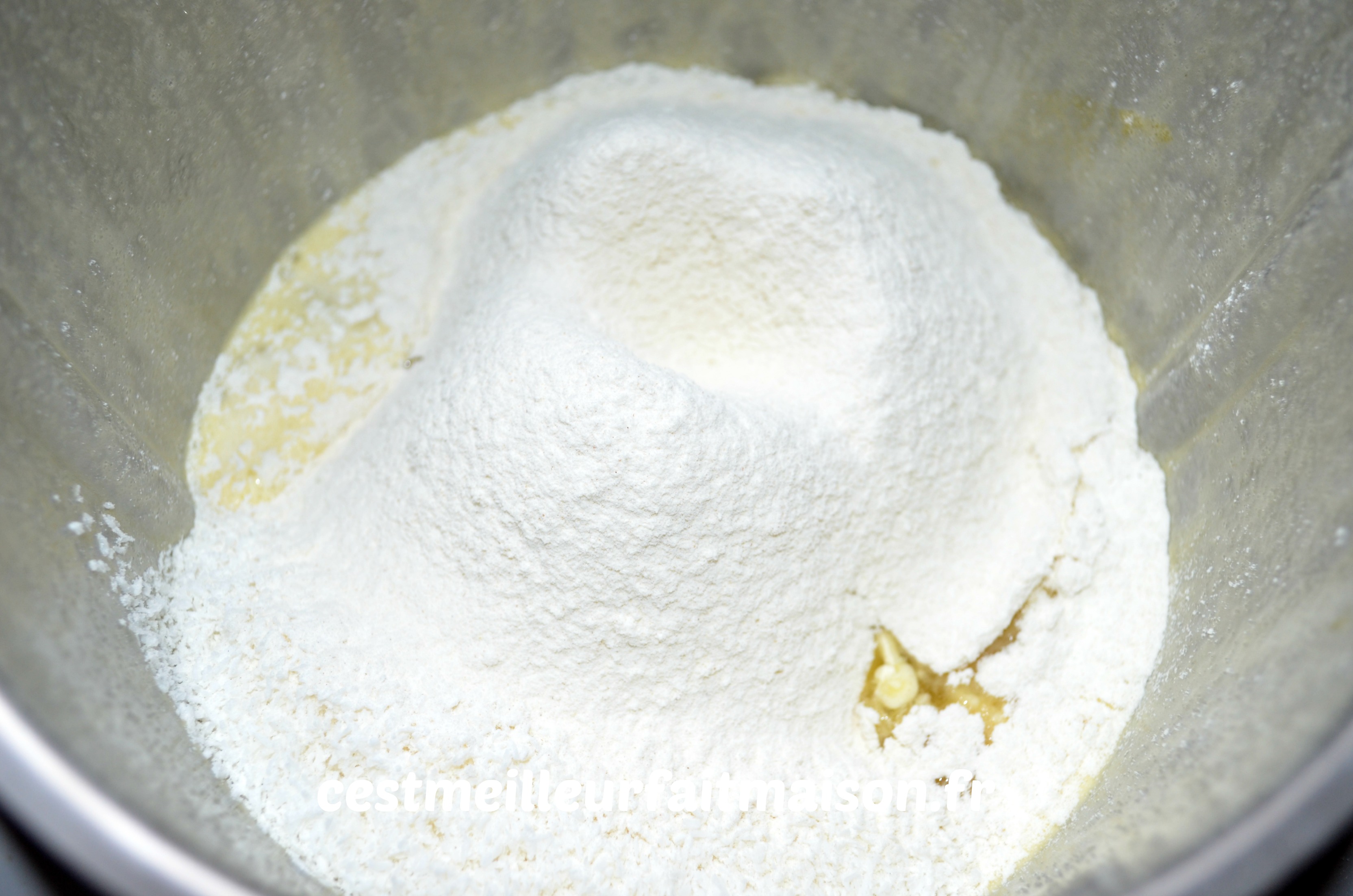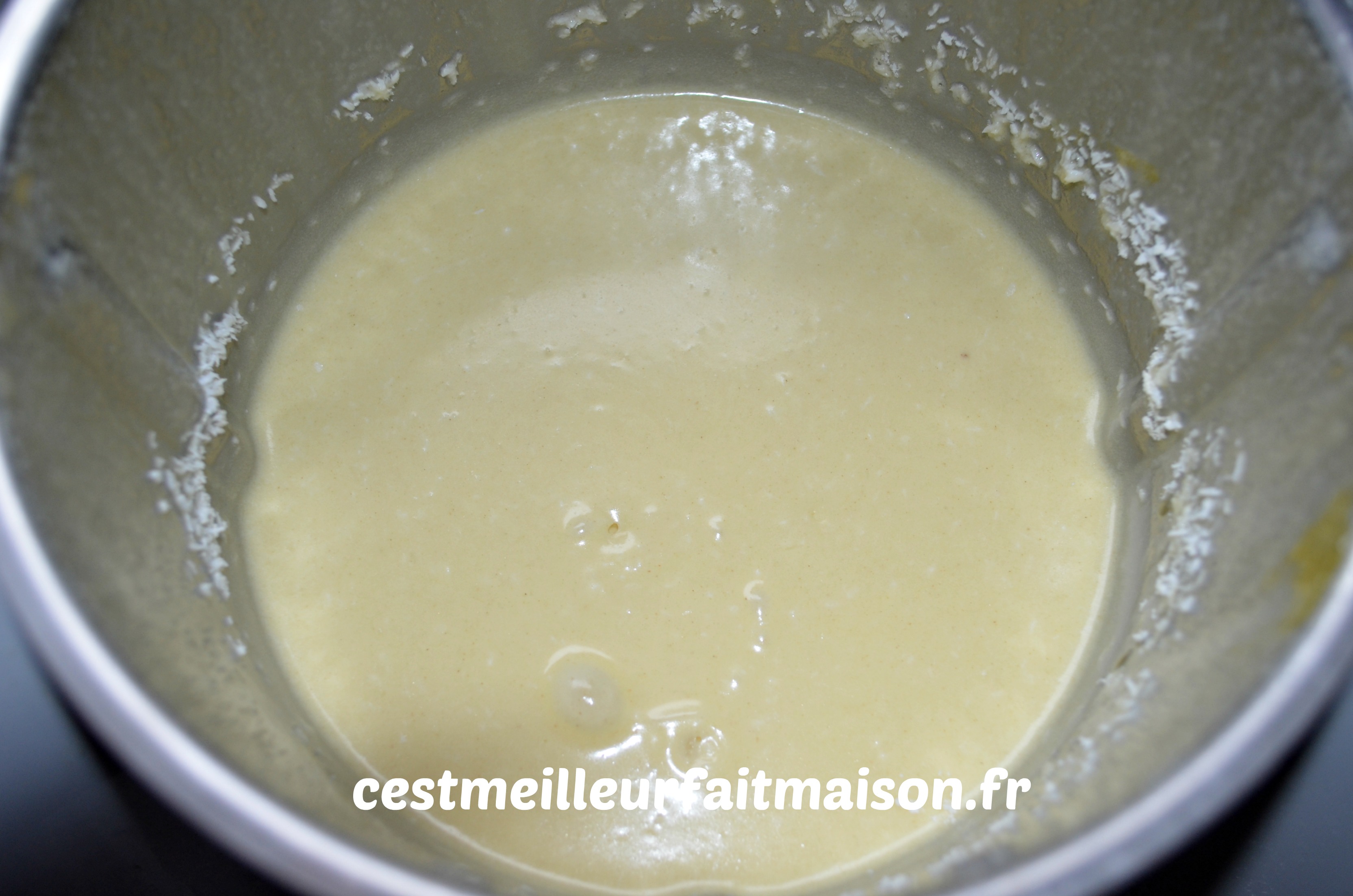 2- Ajouter le lait de coco, le beurre fondu, la noix de coco râpée, la levure et la farine tamisés. Mixer 30 sec/Vit 4.5.