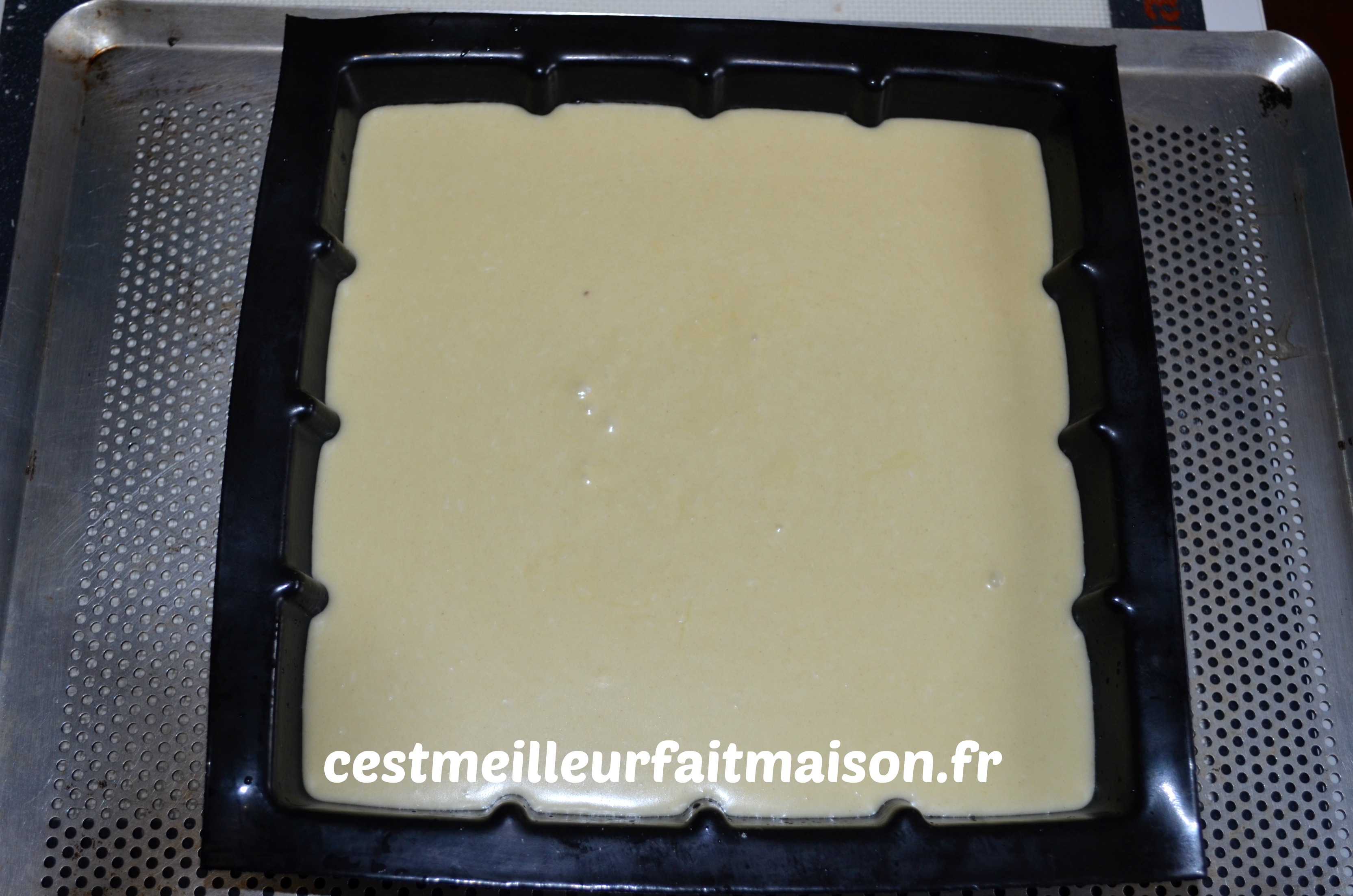 3- Verser la préparation dans un moule souple. J’ai choisi le moule tablette de Guy Demarle. Pas besoin de beurrer et les portions sont parfaites.