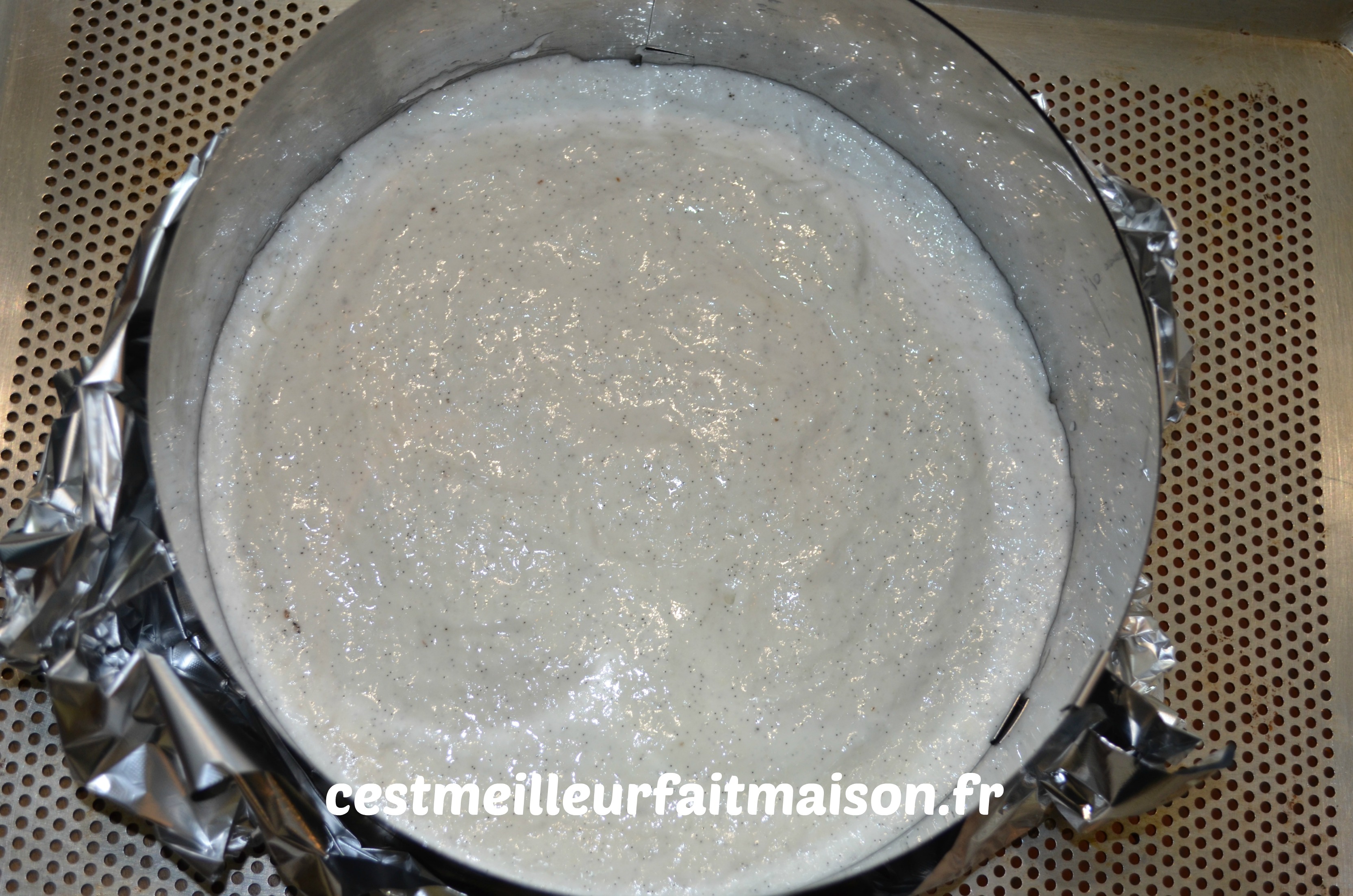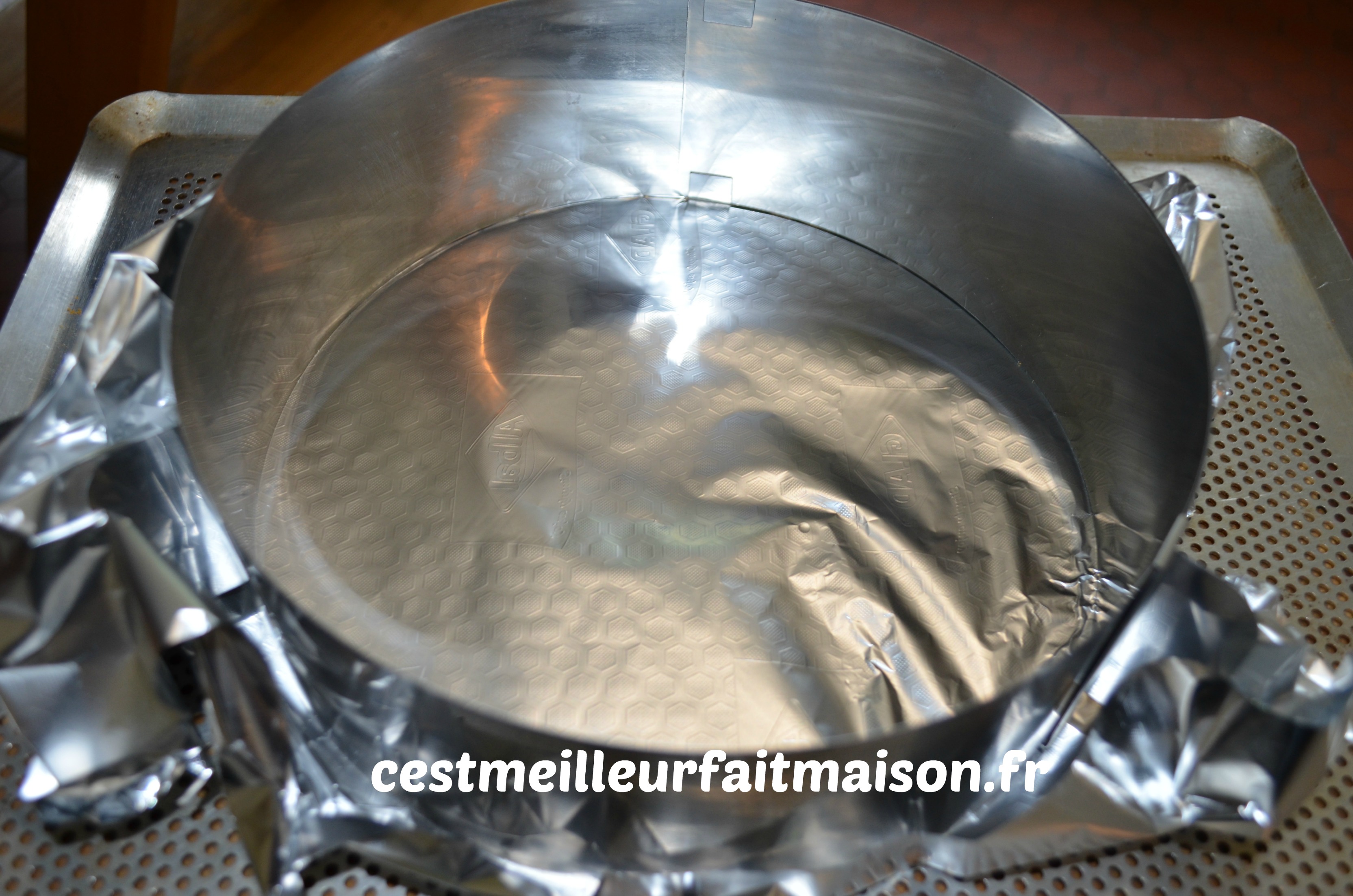 Préparer un cercle à gâteau. Je l’ai réglé à 22 cm et j’ai mis de l’aluminium en dessous pour éviter que la pâte coule sous le cercle.