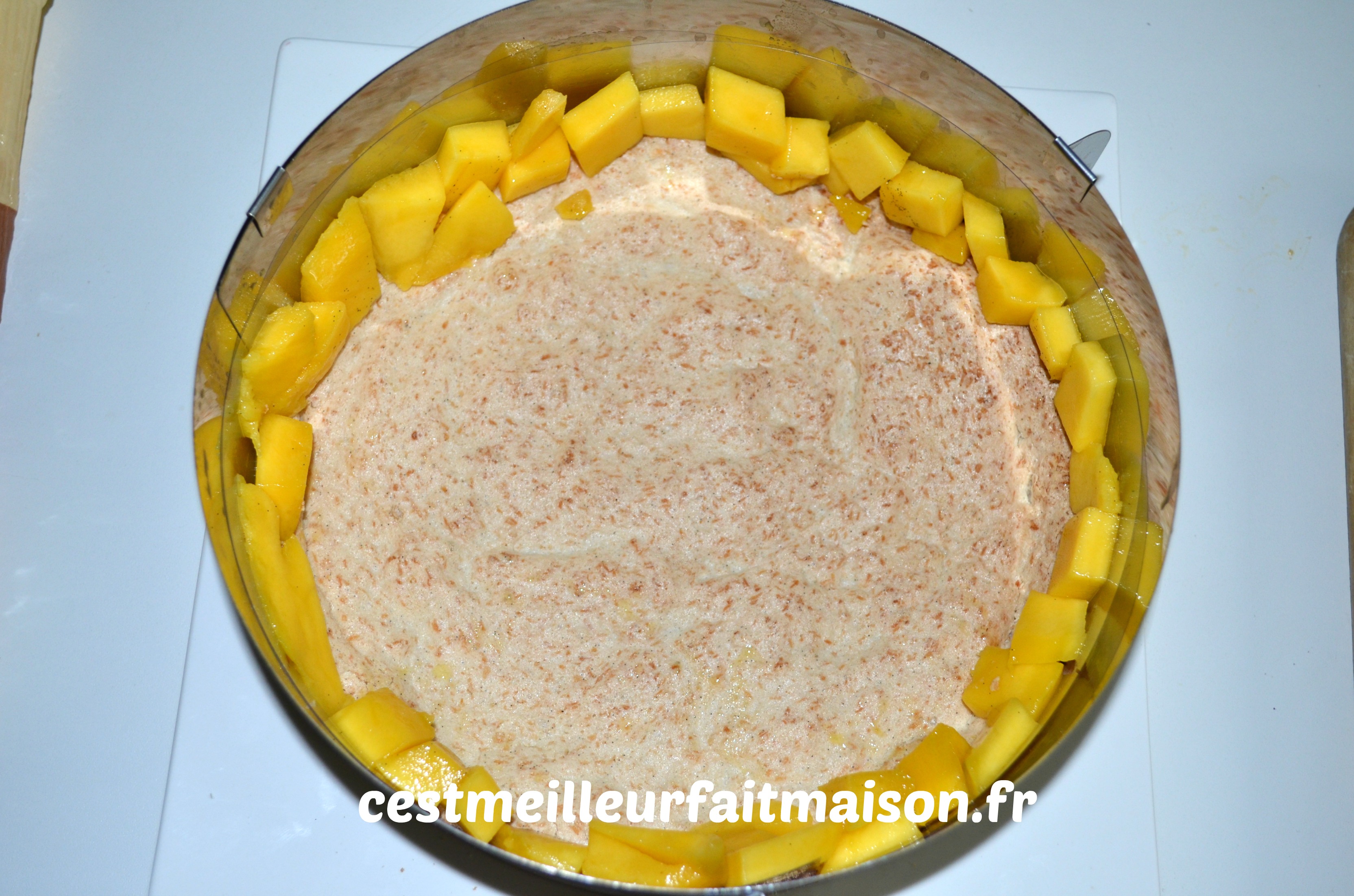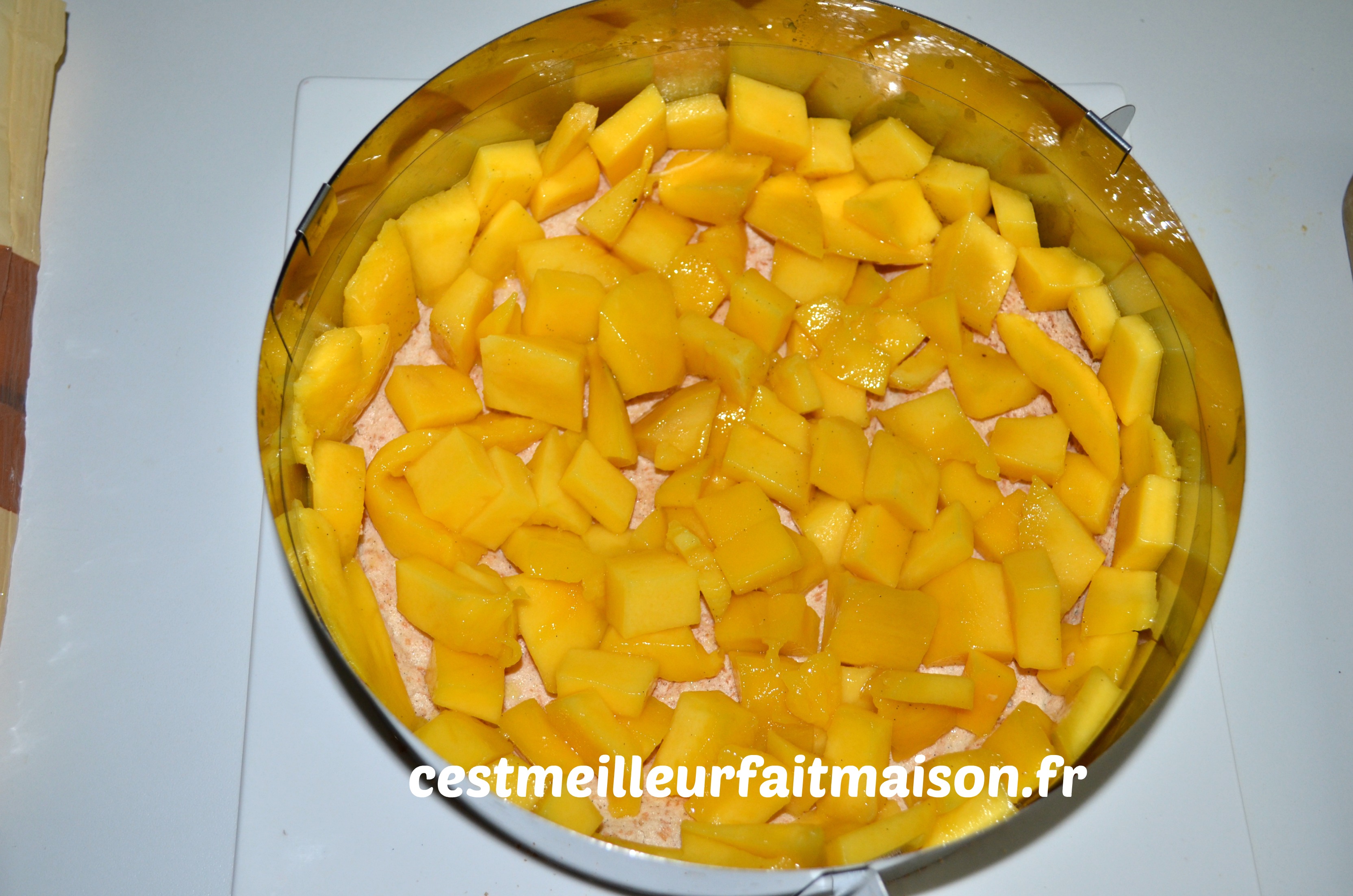 Remettre la dacquoise dans le cercle. Recouvrir avec la mangue en commençant par le tour du cercle. Réserver quelques morceaux pour la déco.
