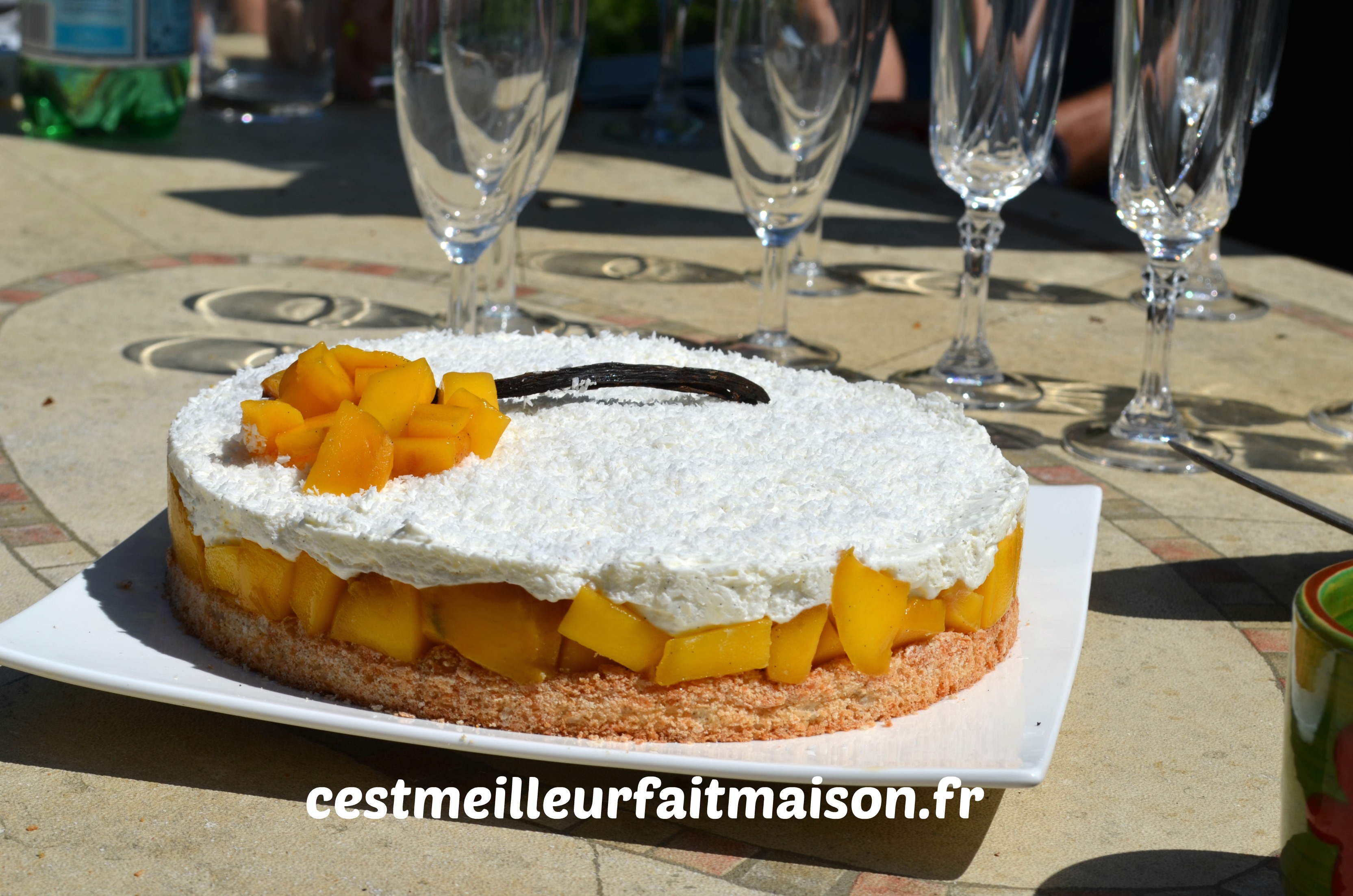 Pour cette recette je suis allée chercher l’inspiration sur le blog Hervé cuisine. Je m’y suis reprise à 4 fois avant de vous proposer cette version. J’ai supprimé le mascarpone que j’ai remplacé par de la crème liquide. Je n’ai pas trouvé l’agar-agar très pratique donc j’ai utilisé des feuilles de gélatine. Pour ne pas faire de gaspillage, j’ai diminué les quantités de la dacquoise à la noix de coco pour la cuire dans un cercle. Et pour finir, j’ai coupé la mangue en petits morceaux car c’est plus facile à manger ainsi et plus facile aussi pour découper le gâteau.