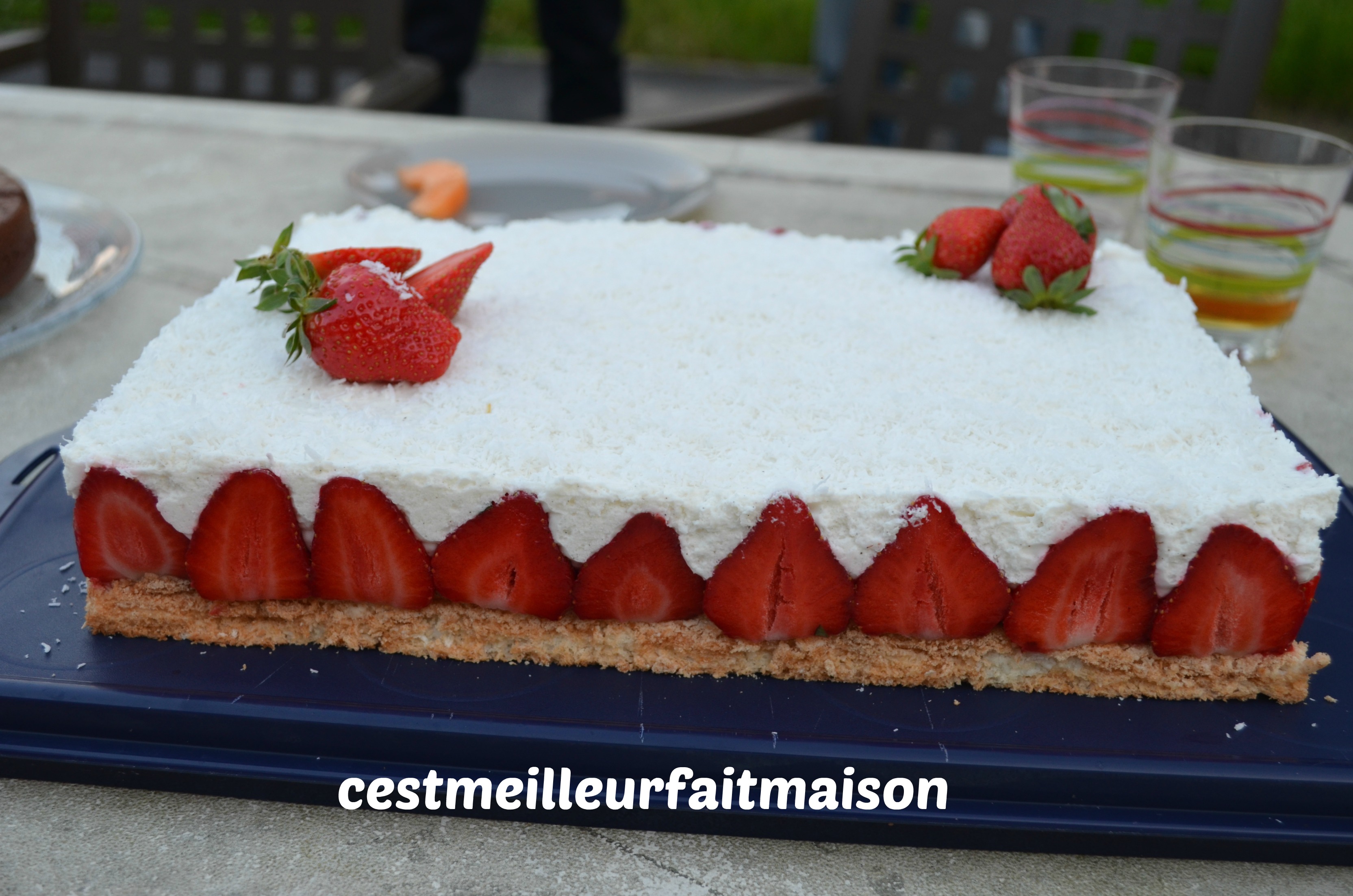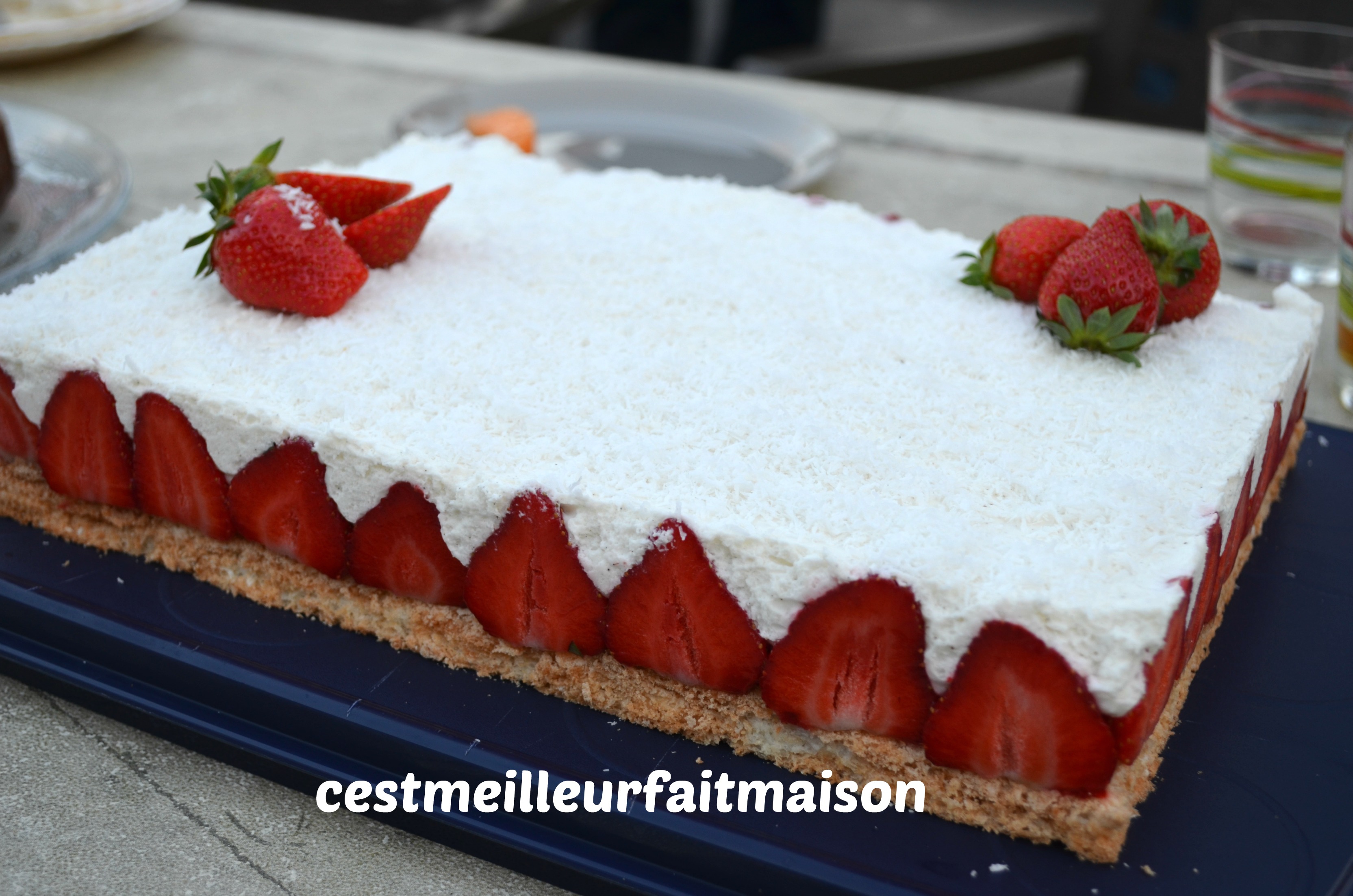 Pour ce gâteau, je suis partie du gâteau noix de coco mangue vanille. J’ai juste changé le fruit et la forme. Comme j’ai fait ce dessert pour une occasion particulière, j’ai doublé les quantités mais dans le déroulé que je vous donne ci-dessous les doses sont pour un gâteau de taille normale (cercle de 22 cm).