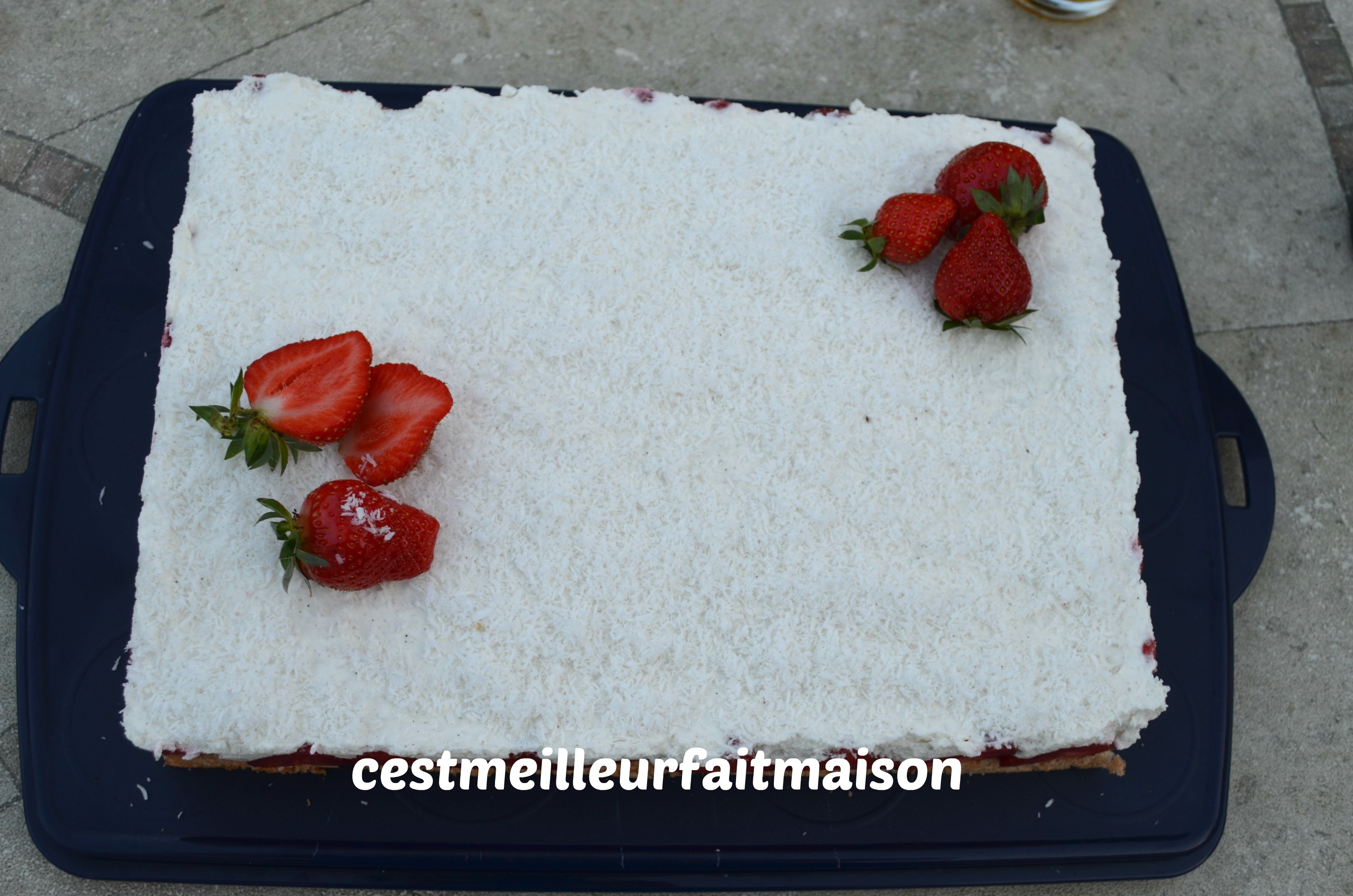 Recouvrir avec la crème, lisser et saupoudrer de noix de coco.