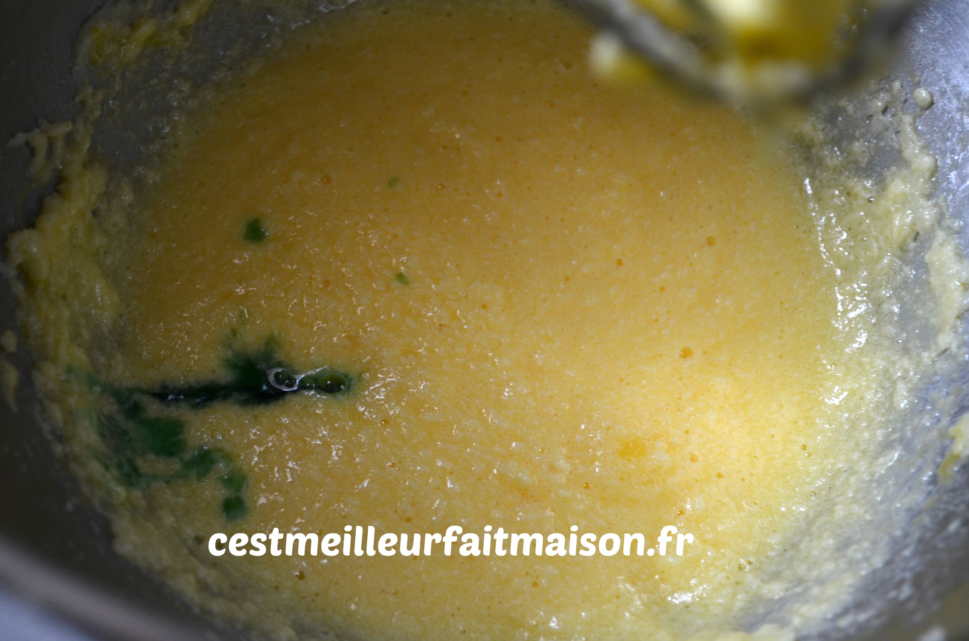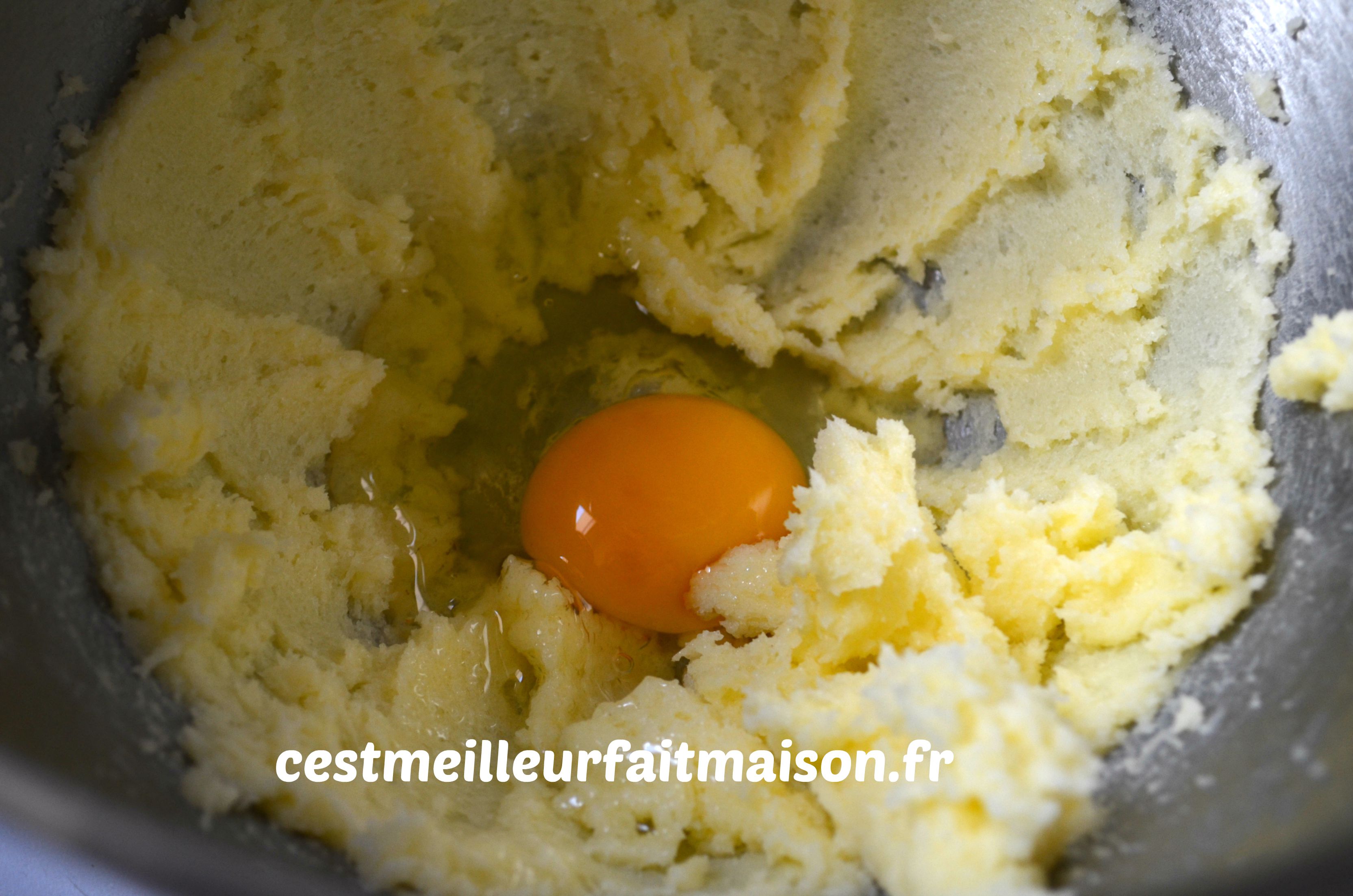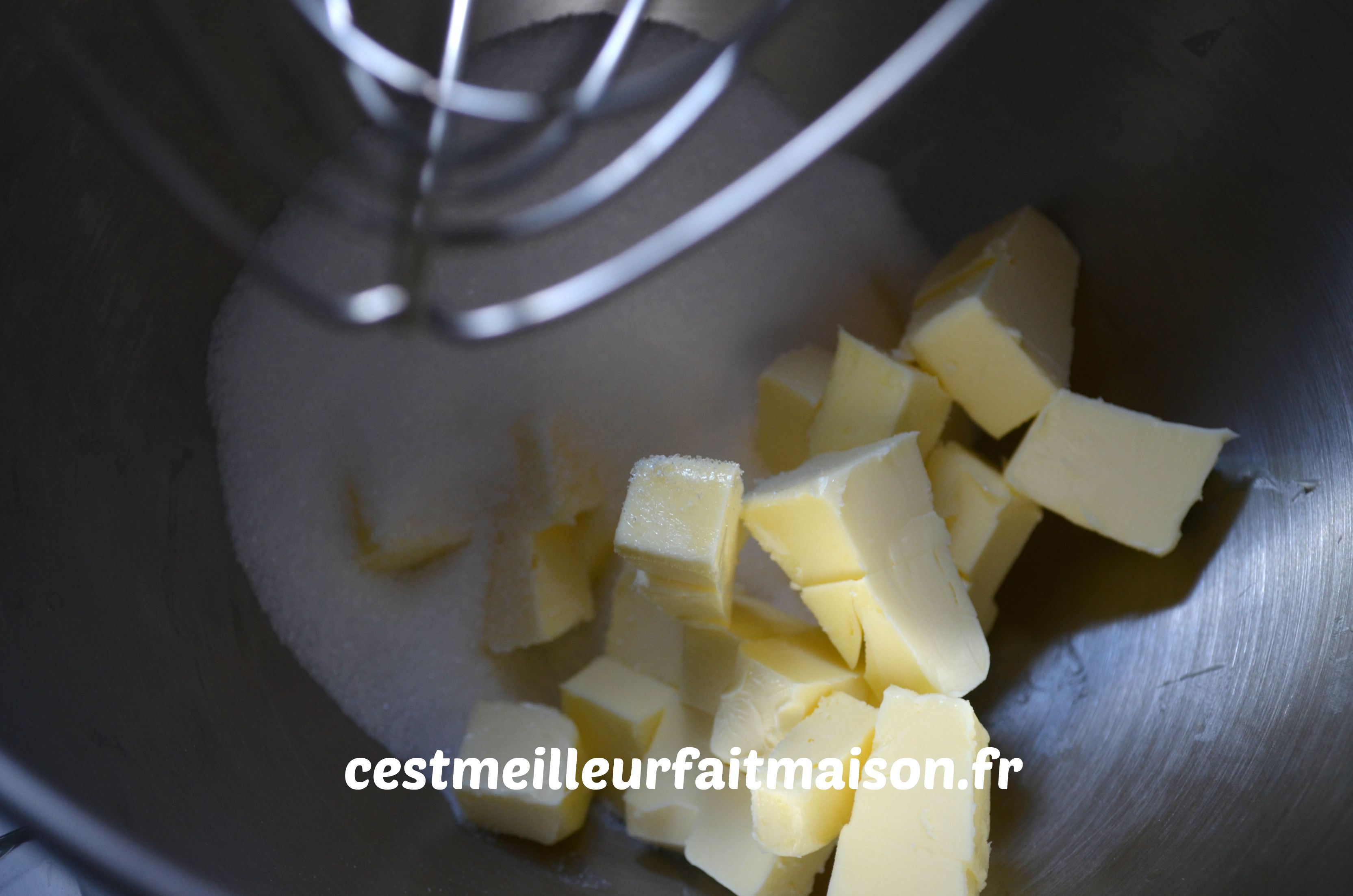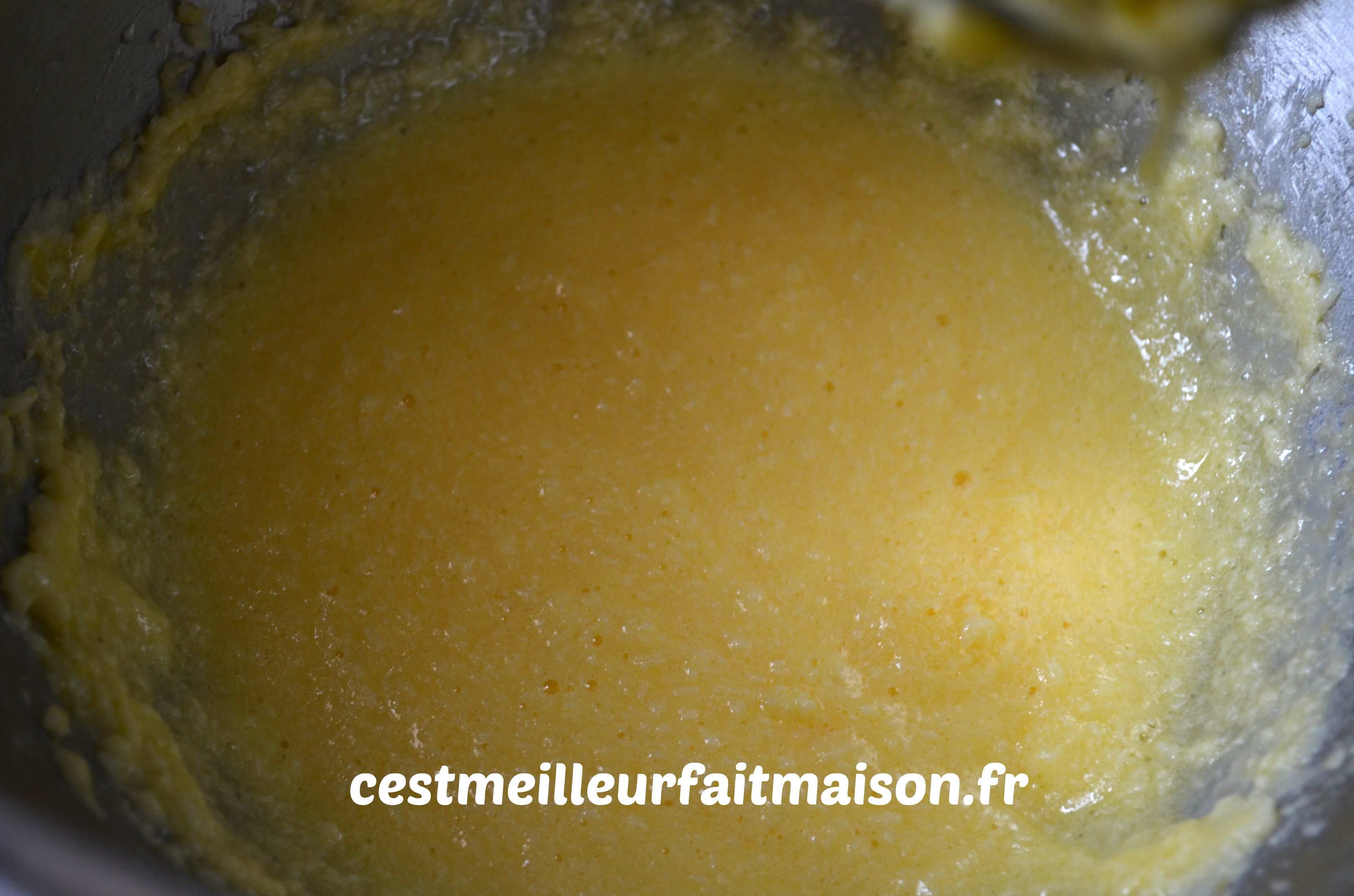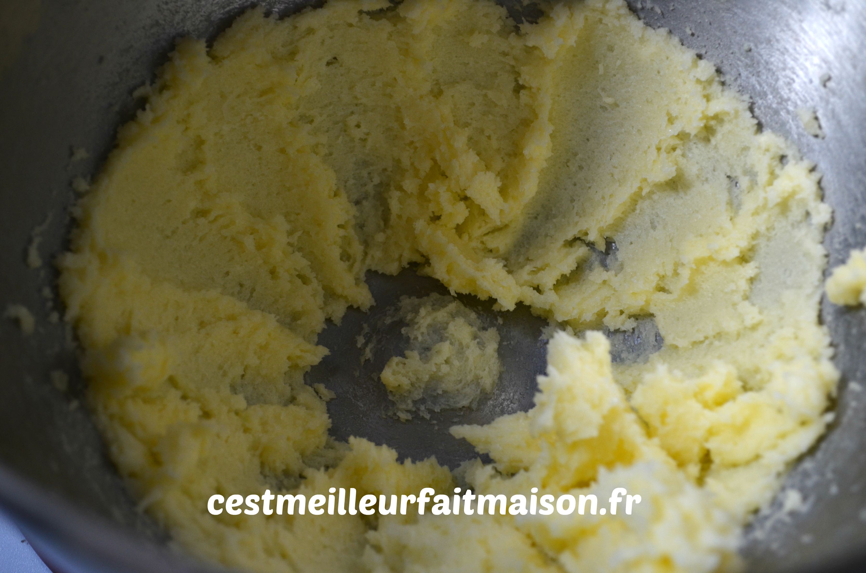1- Dans le bol du robot muni du fouet, battre le beurre avec le sucre jusqu’à l’obtention d’une crème blanche.