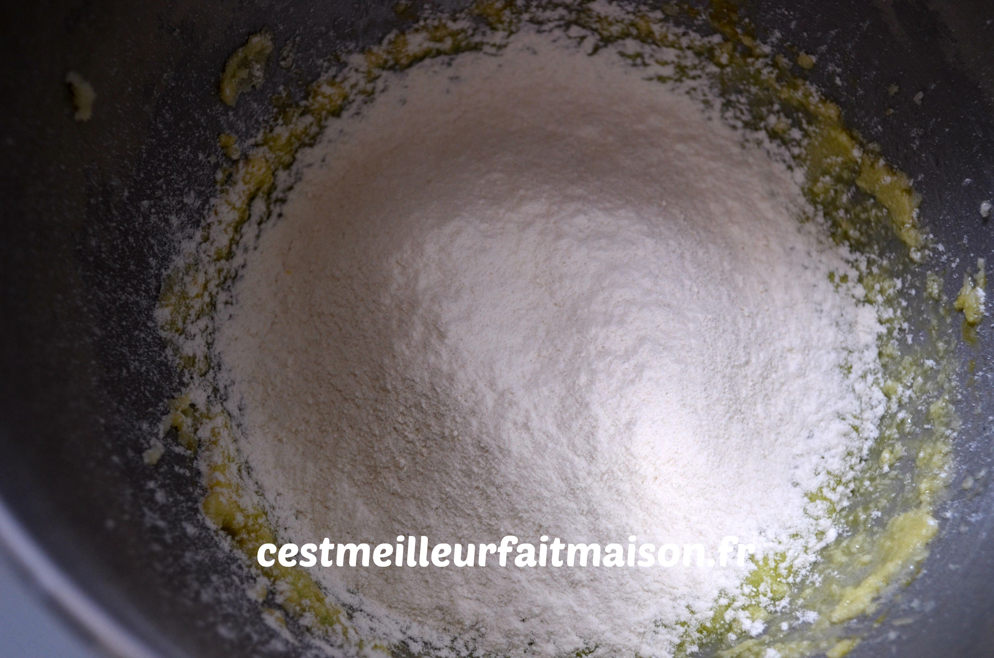 4- Ajouter la farine et la levure tamisées. Bien mélanger.