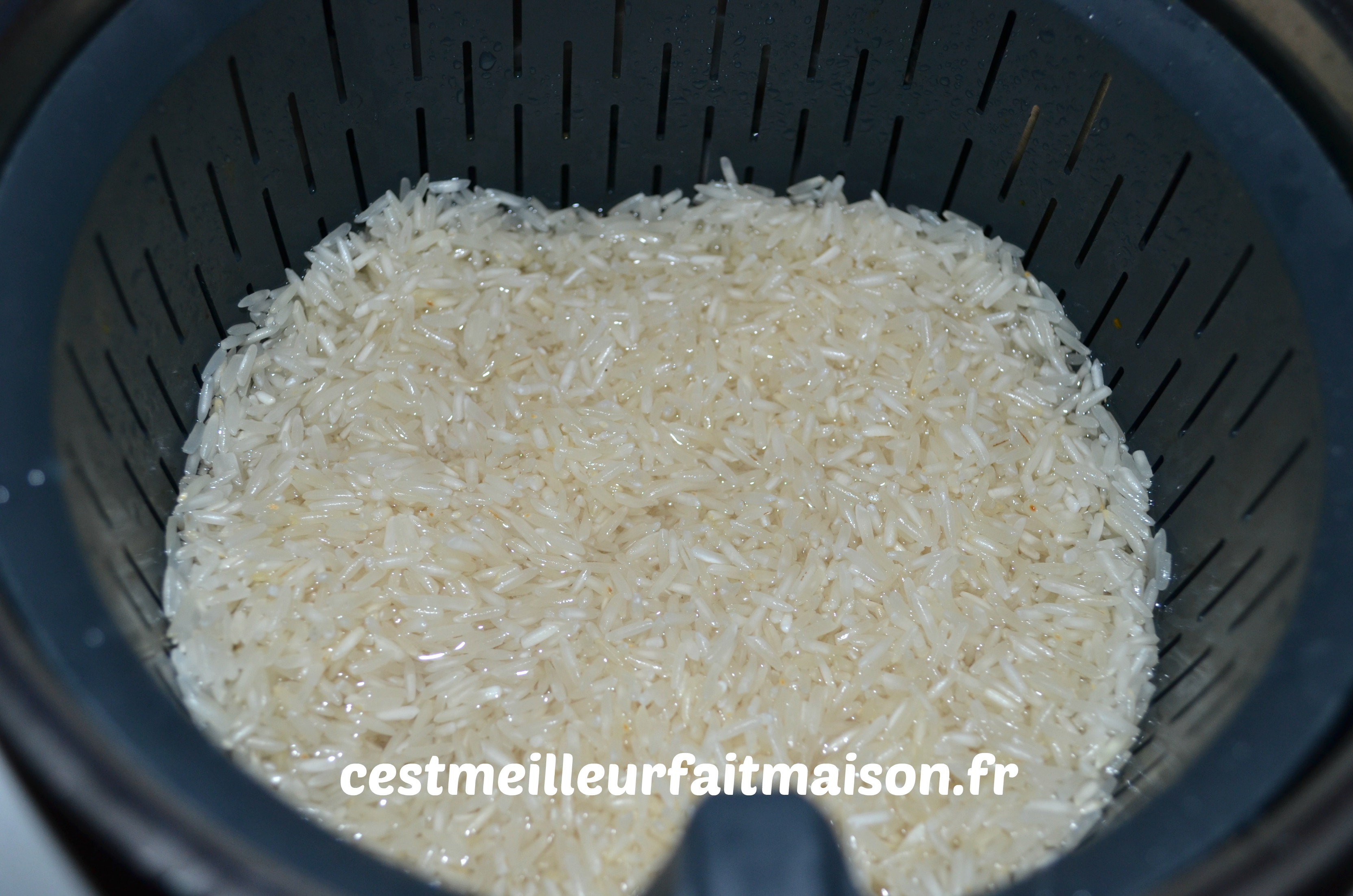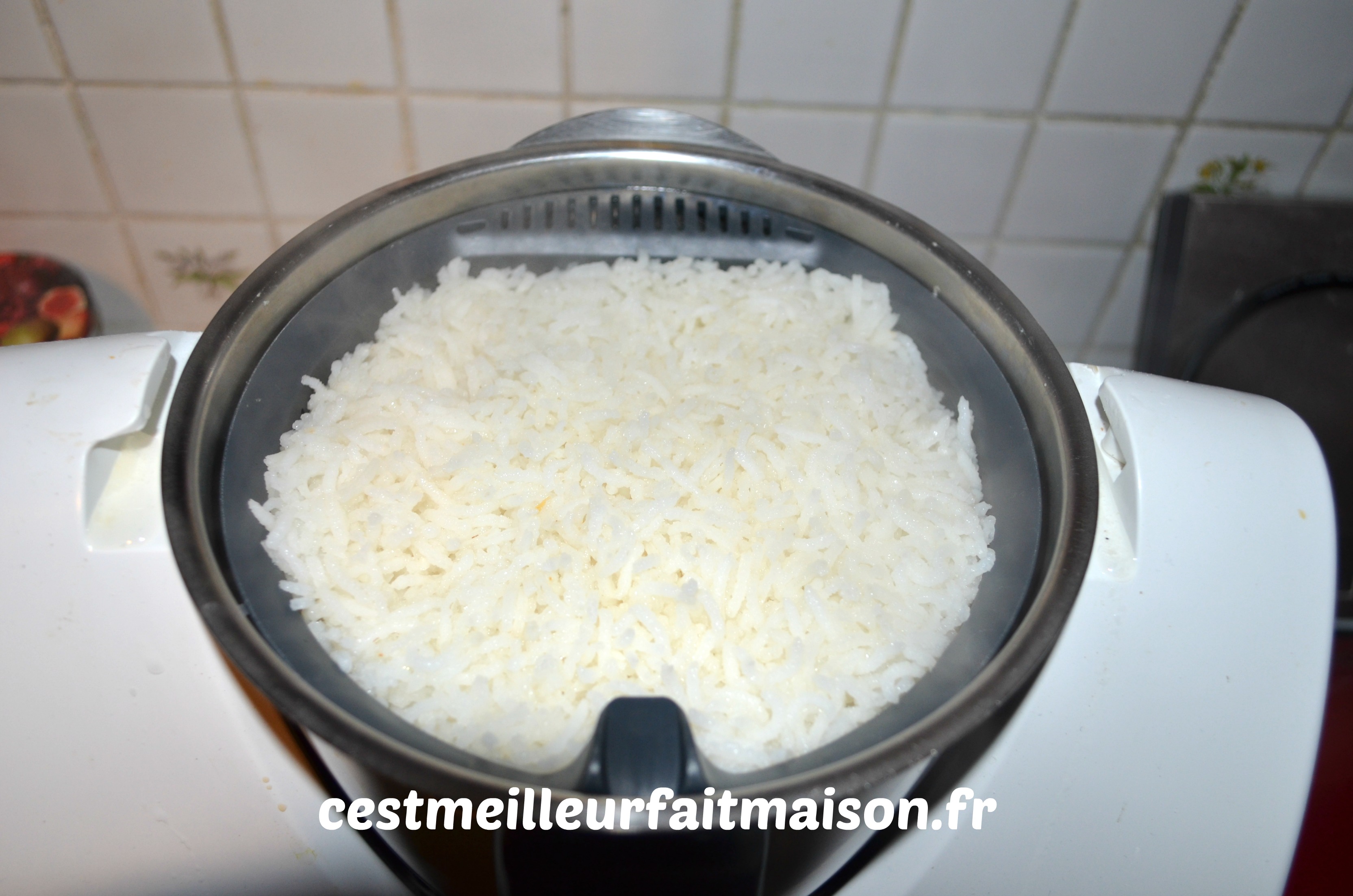 3- Au bout de ce temps le riz est cuit mais pas forcement le poisson et les légumes. Dans ce cas, retirer le panier avec le riz et programmer à nouveau quelques minutes. J’ai rajouté 3 min/Varoma/Vit 1. Réserver le riz au chaud.