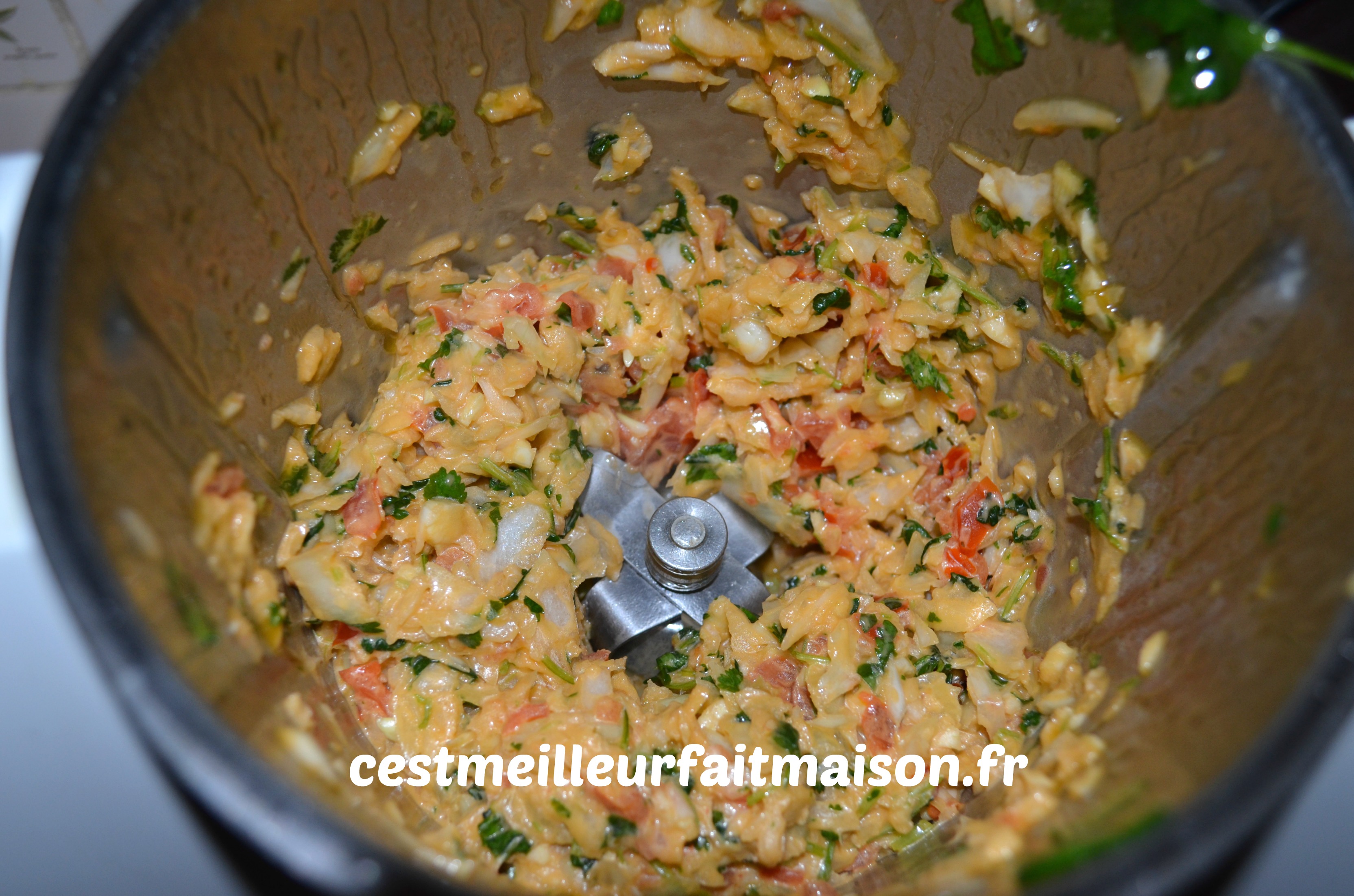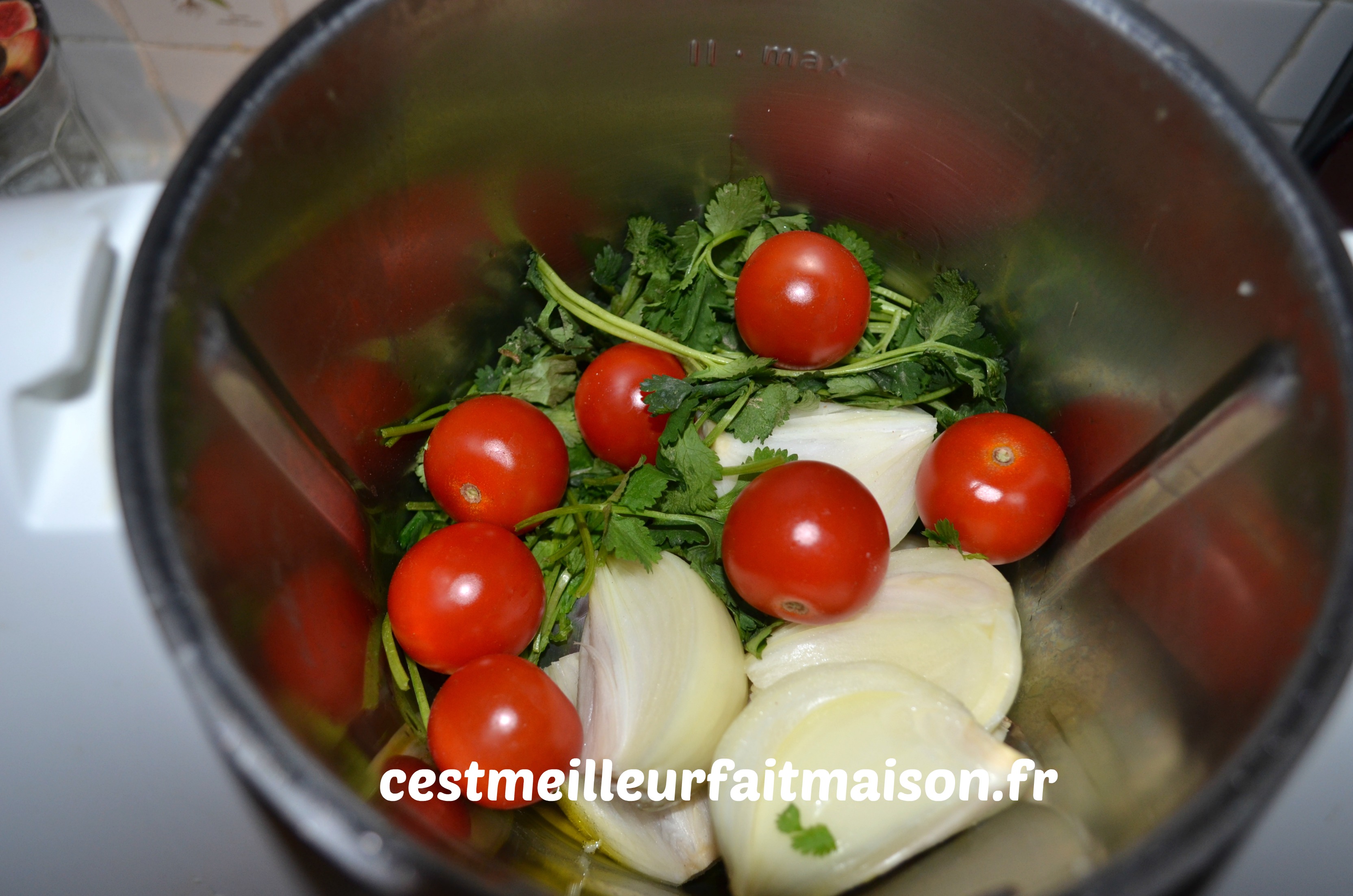 6- Ajouter l’ail et les oignons coupés en deux, la tomate et la coriandre. Mixer 7 sec/Vit 5 puis faire rissoler 4 min/100°C/Vit 1.