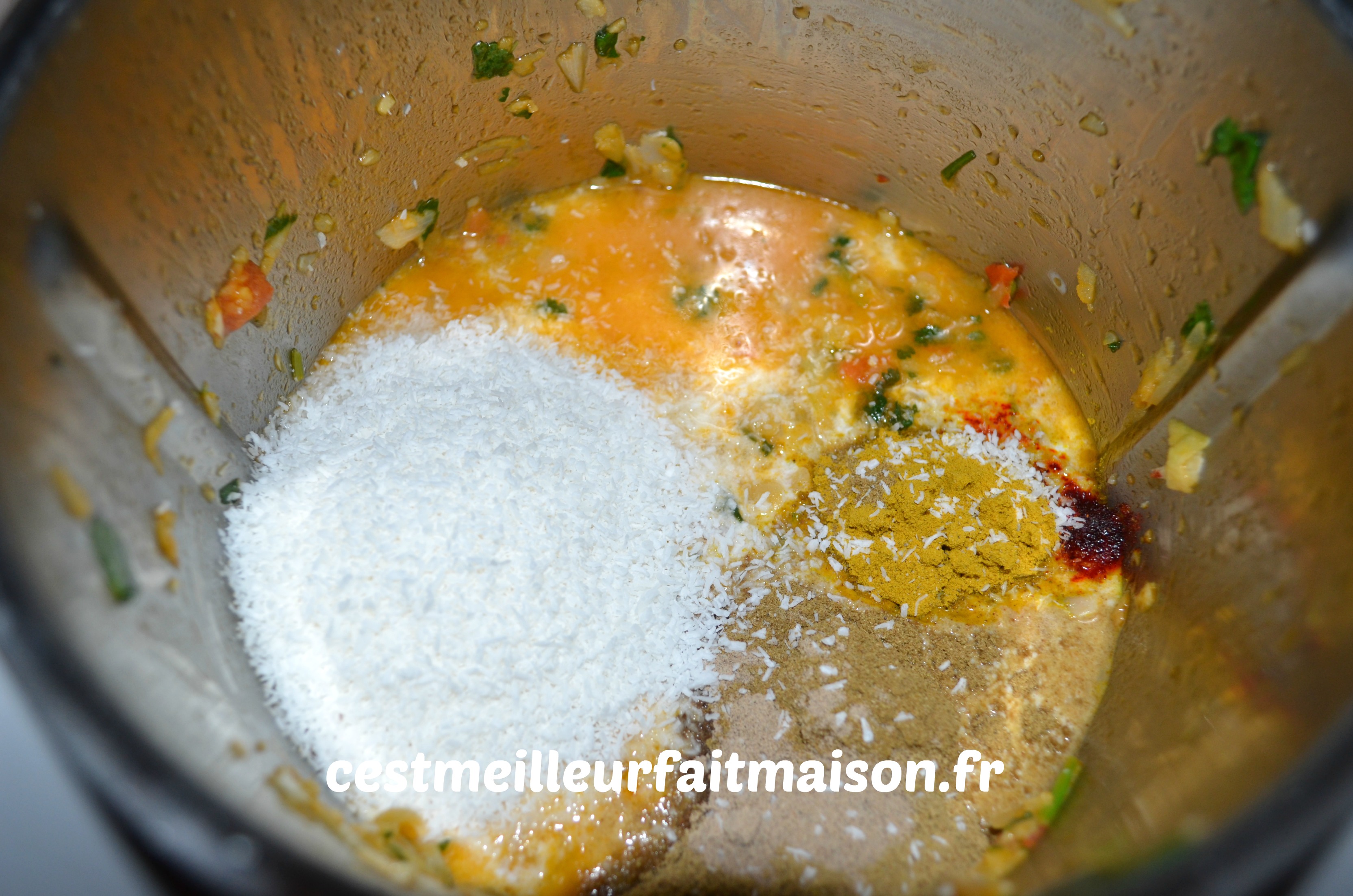 7- Ajouter le vin blanc, le lait de coco, 2 cc de sel, le curry, le safran, le cumin, l’anis, la cardamome et la noix de coco râpée. Cuire 3 min/100°C/Vit 1.
