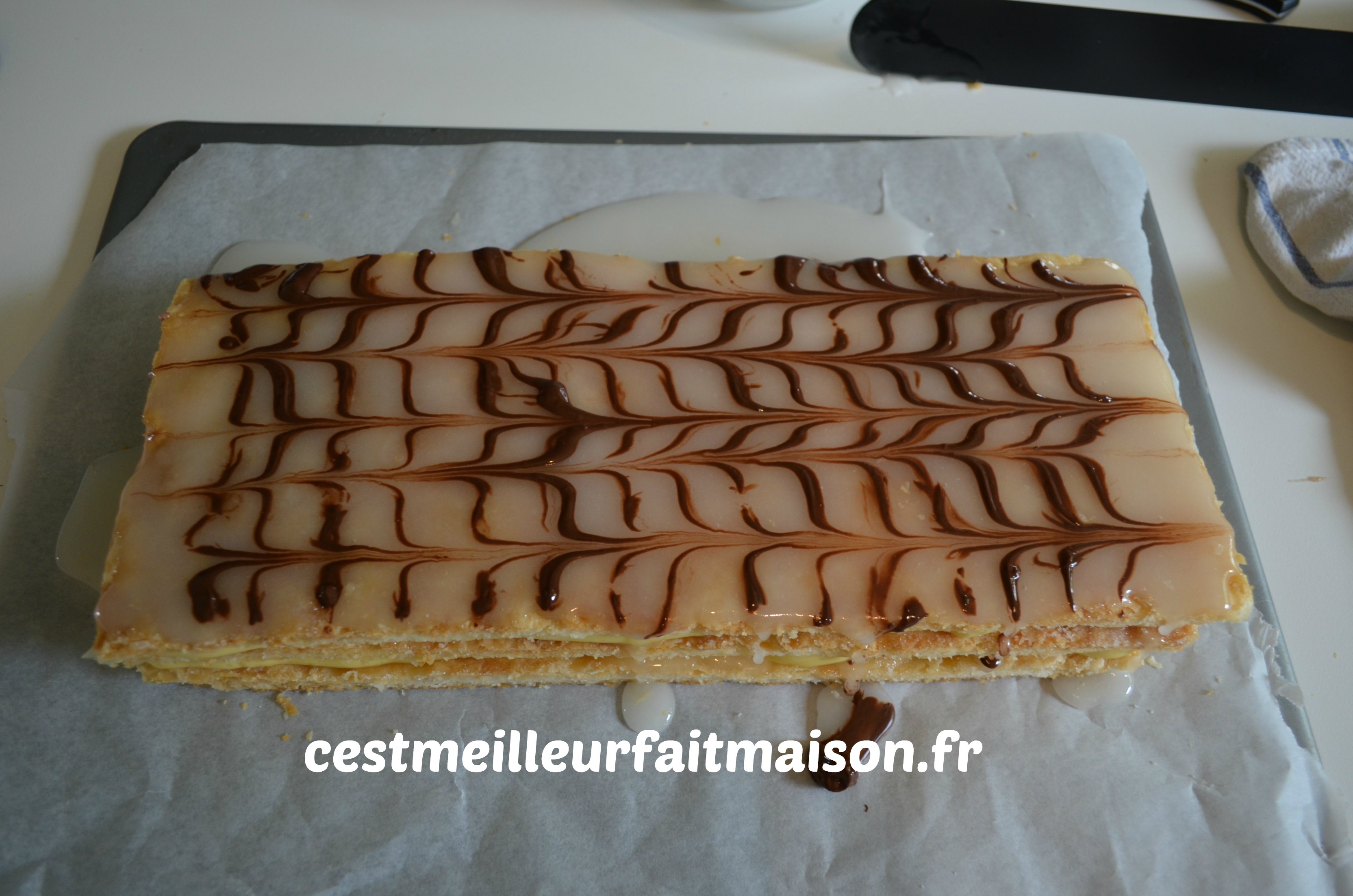 8- Faire fondre le chocolat au micro onde ou au bain marie. Je n’ai pas réussi à faire un cornet avec du papier cuisson pour le verser sur le millefeuille. J’ai donc fait les traits de chocolat avec une petite cuillère. Du coup, ce n’est pas très beau.