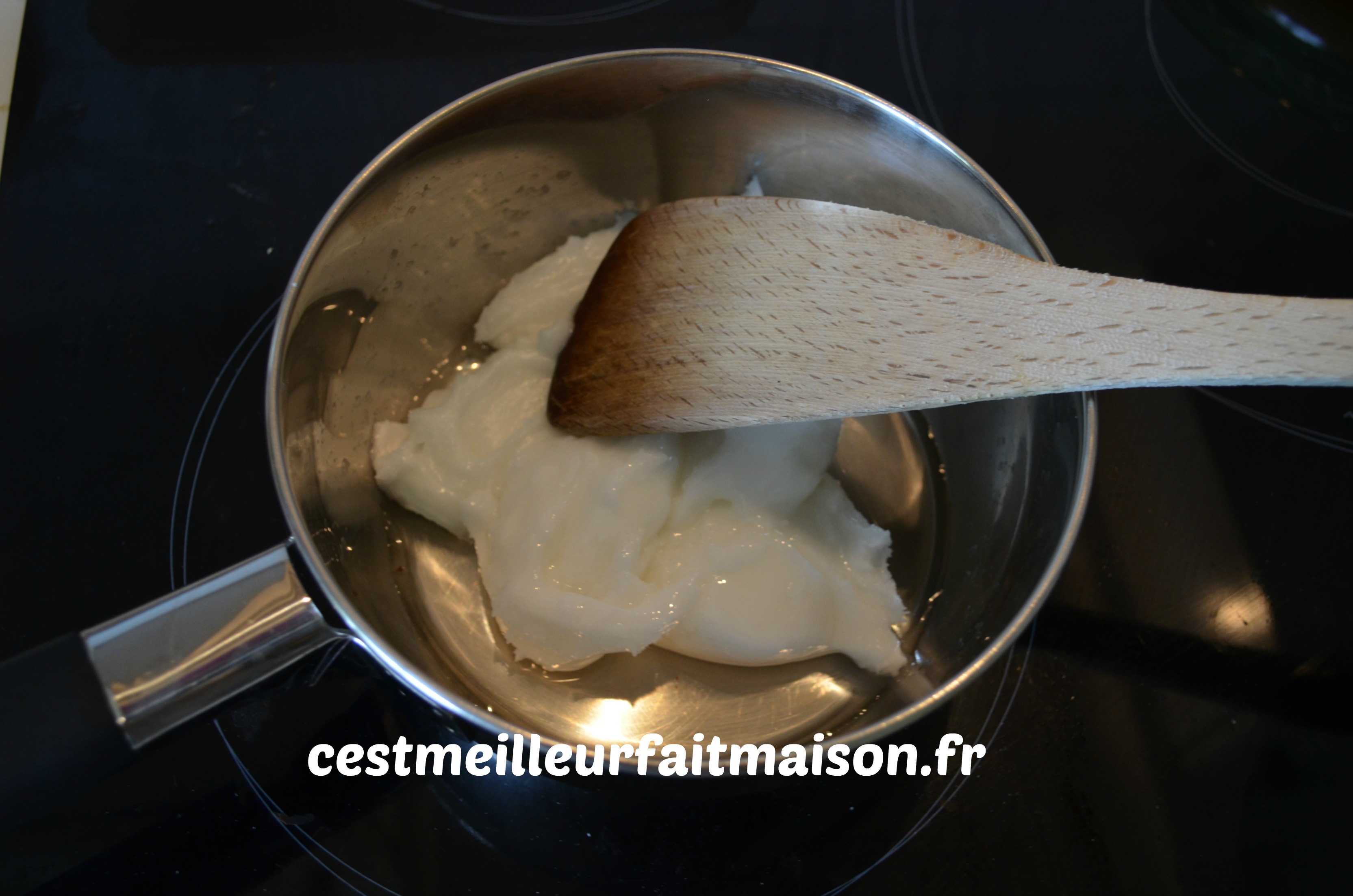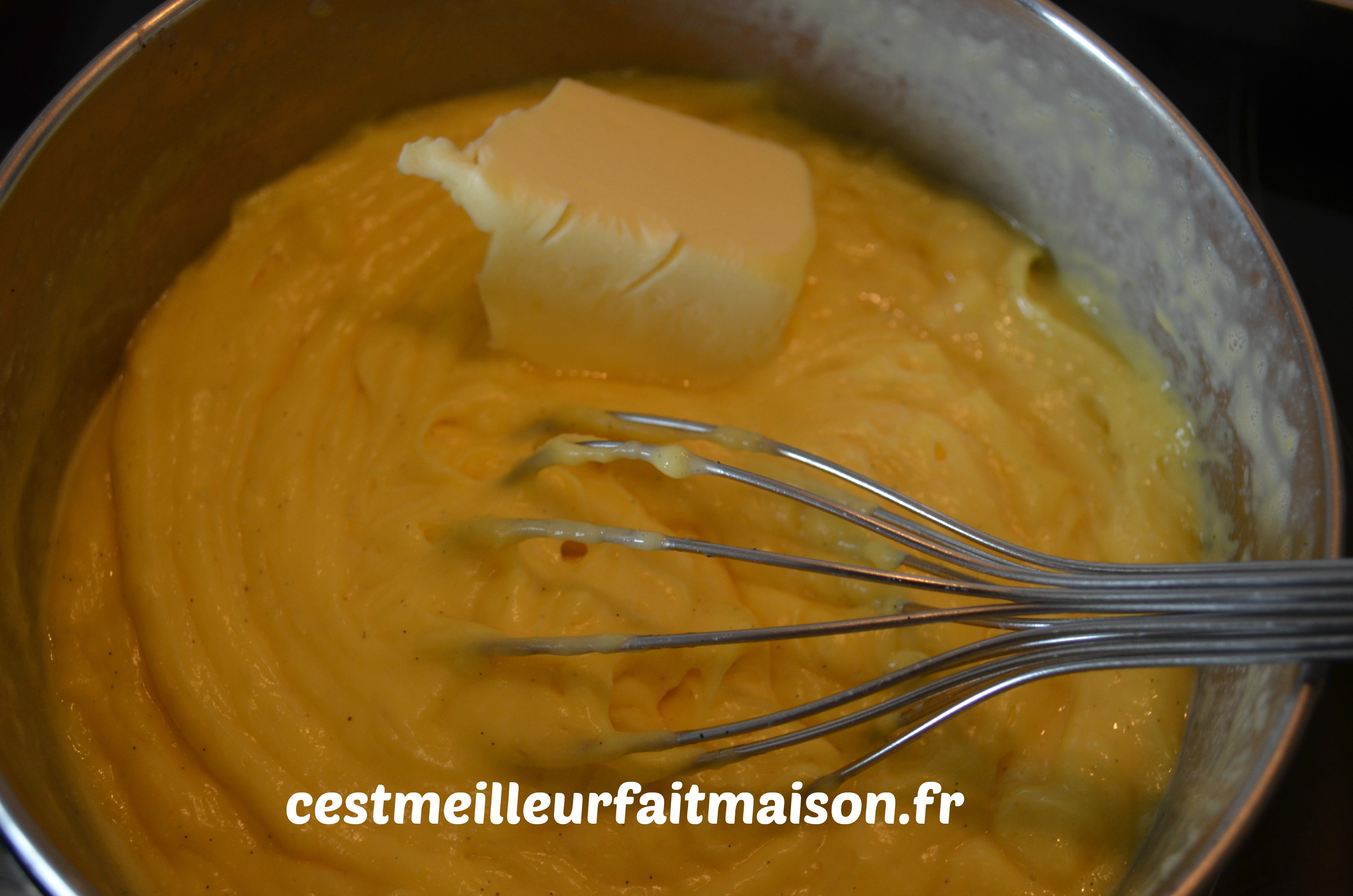 Remettre dans la casserole et mélanger sans cesse jusqu’à ce que la crème épaississe. Mettre le beurre dans la crème chaude et remuer.