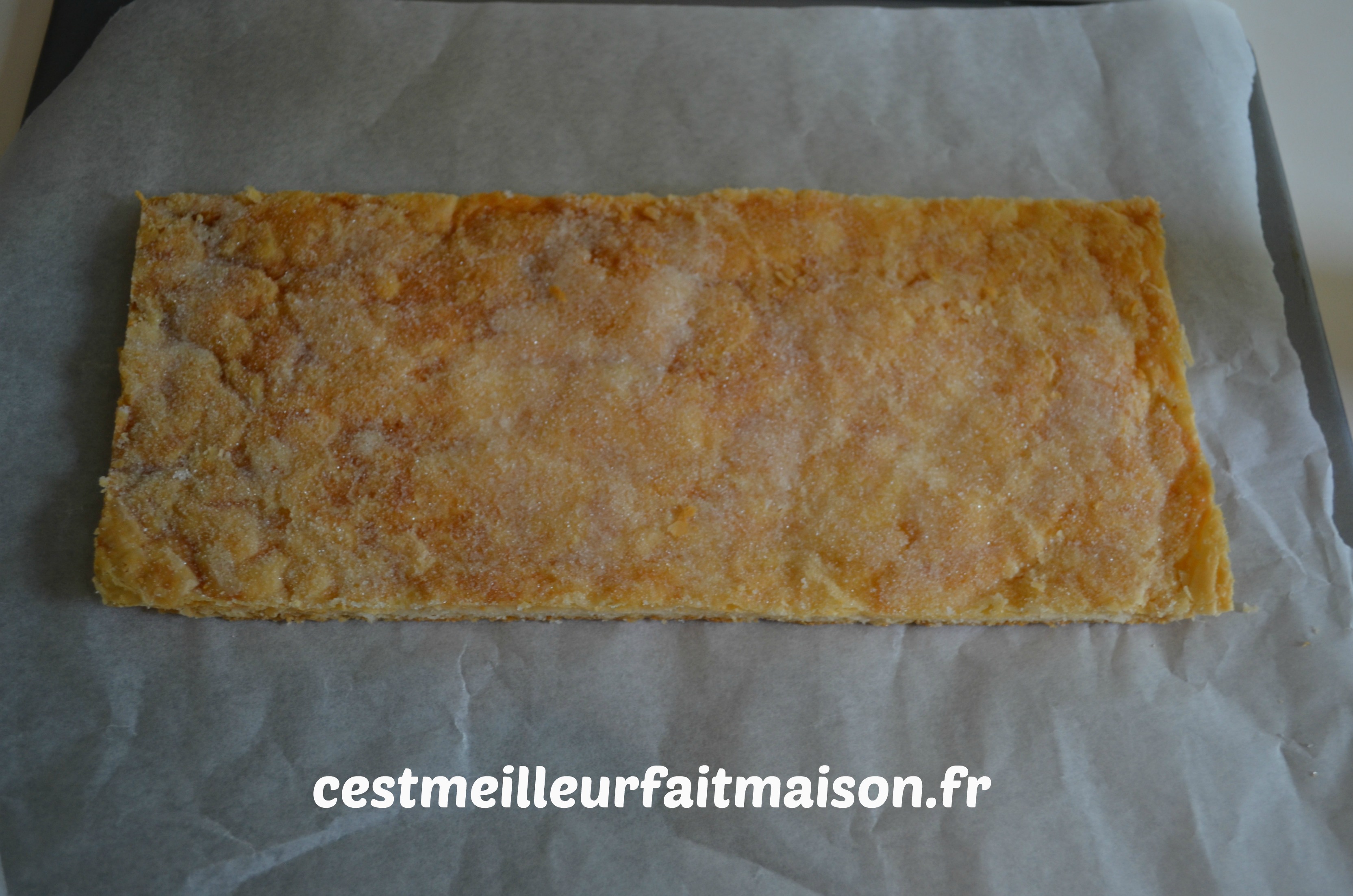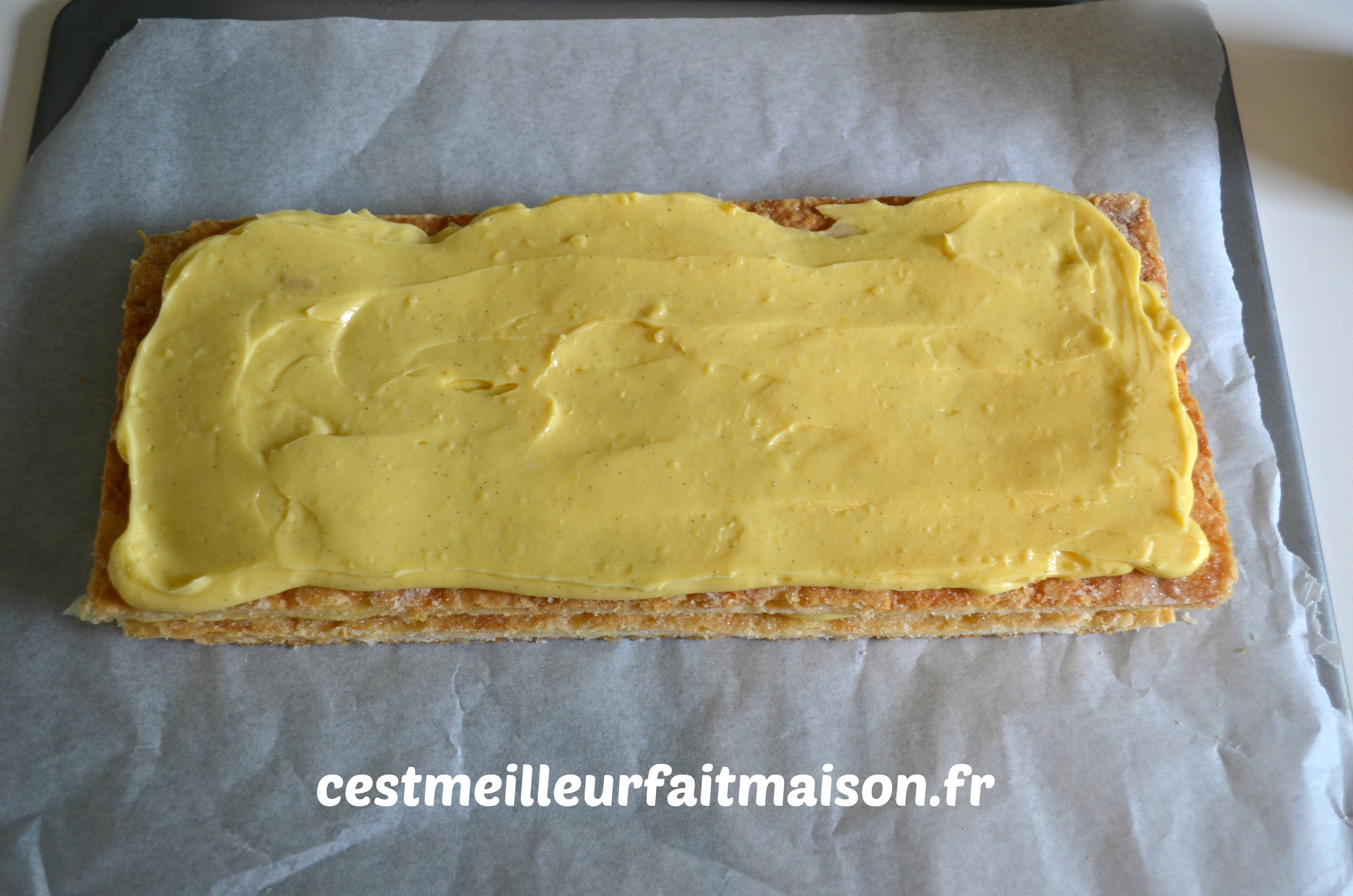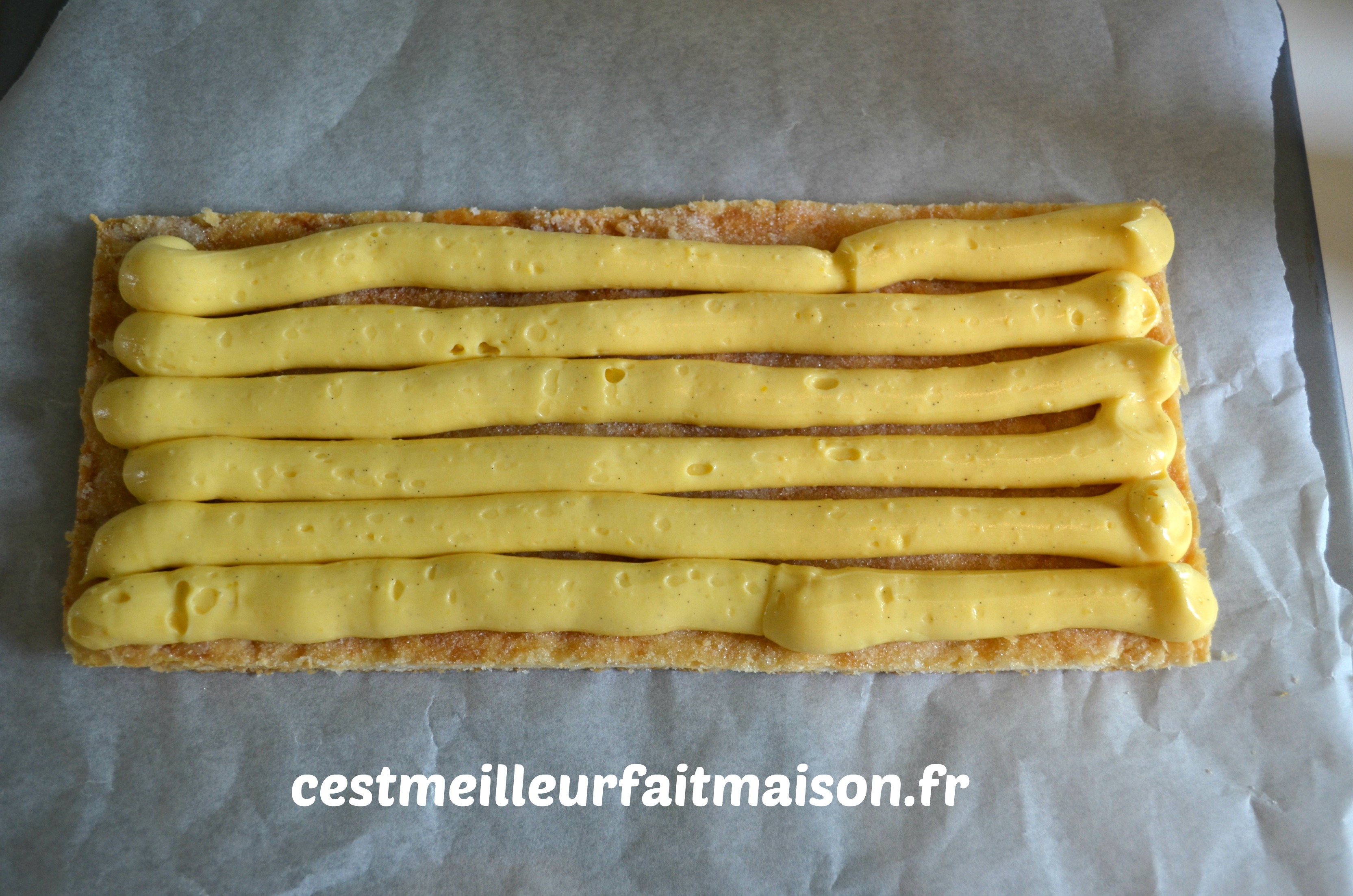 5- Mettre la crème pâtissière dans une poche à douille et en étaler la moitié sur la première plaque de pâte feuilletée. Recouvrir de la deuxième pâte feuilletée. Remettre le reste de crème et terminer par la dernière pâte feuilletée.