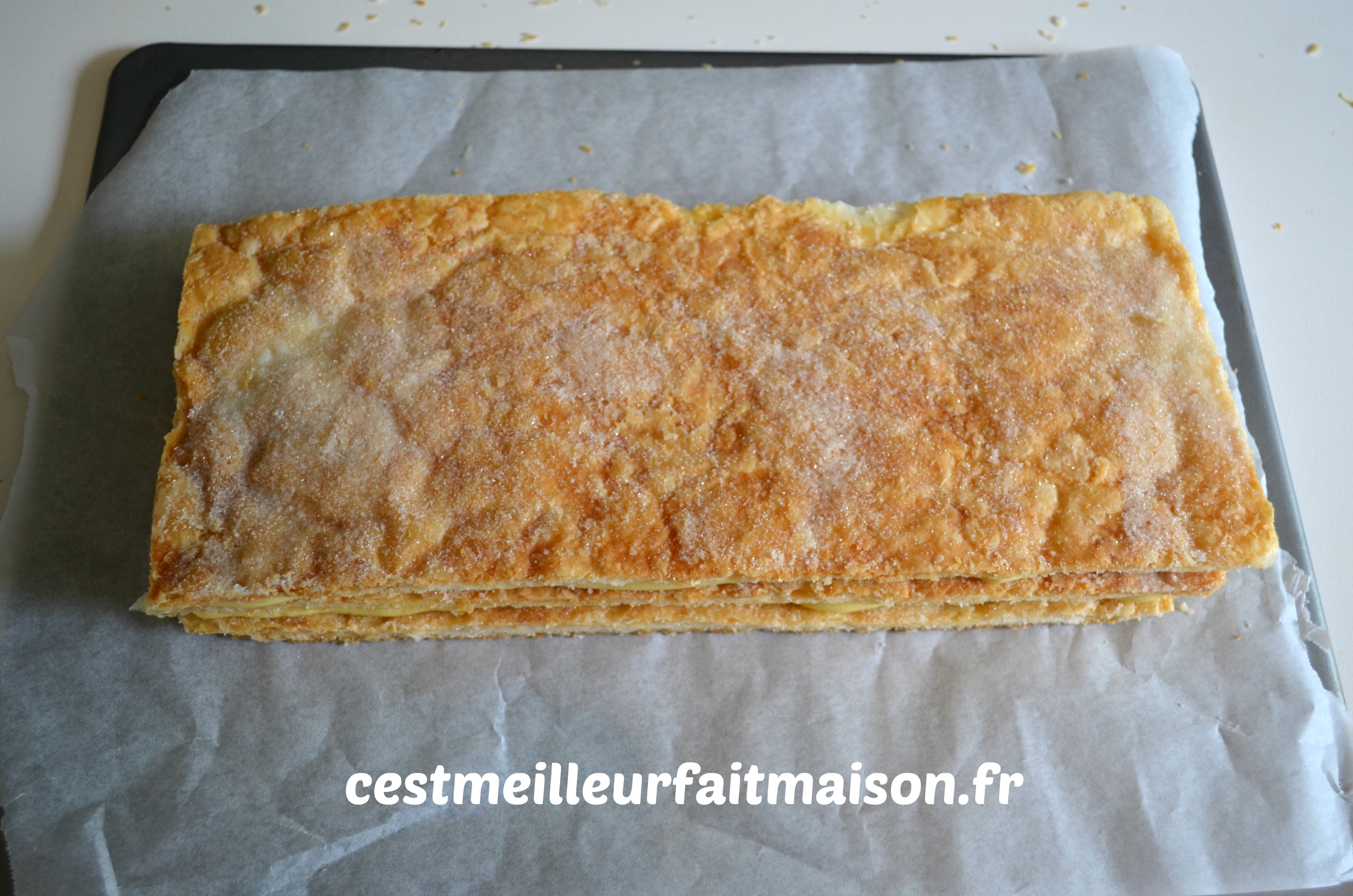 9- Egaliser les bords avec un couteau à pain. J’ai laissé le millefeuille au réfrigérateur et je l’ai sorti 30 min avant de le déguster.