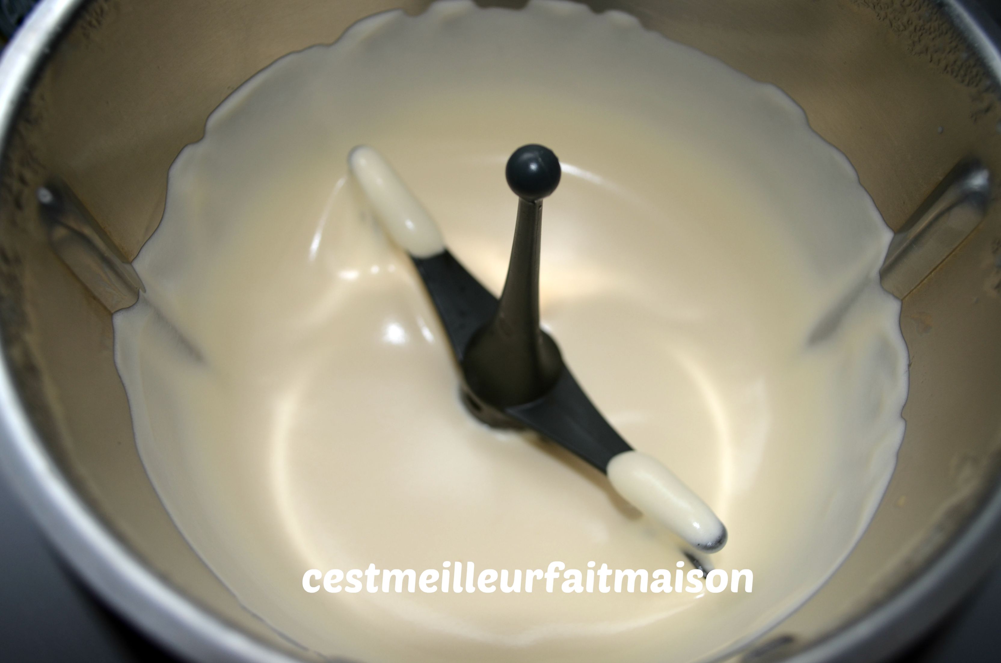 2- Dans le bol du Thermomix muni du fouet, mettre les œufs, le sucre et l’eau. Chauffer 3 min/70°C/Vit 3.5. Continuer 5 min de plus sans chauffer à la vitesse 3.5.