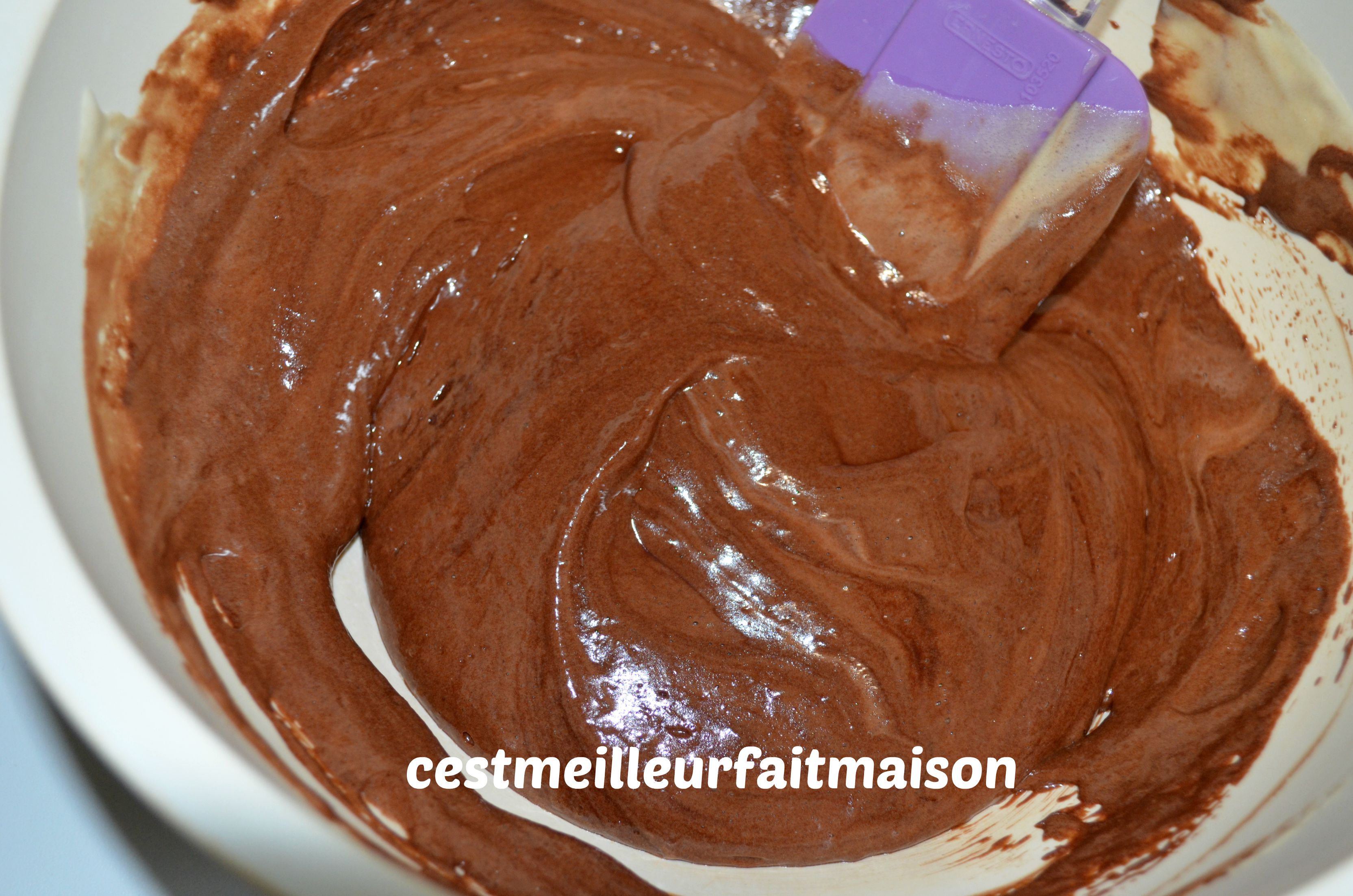 3- Verser une partie des œufs bien mousseux sur le chocolat fondu. Mélanger délicatement à la spatule et ajouter le reste des œufs. Mélanger.
