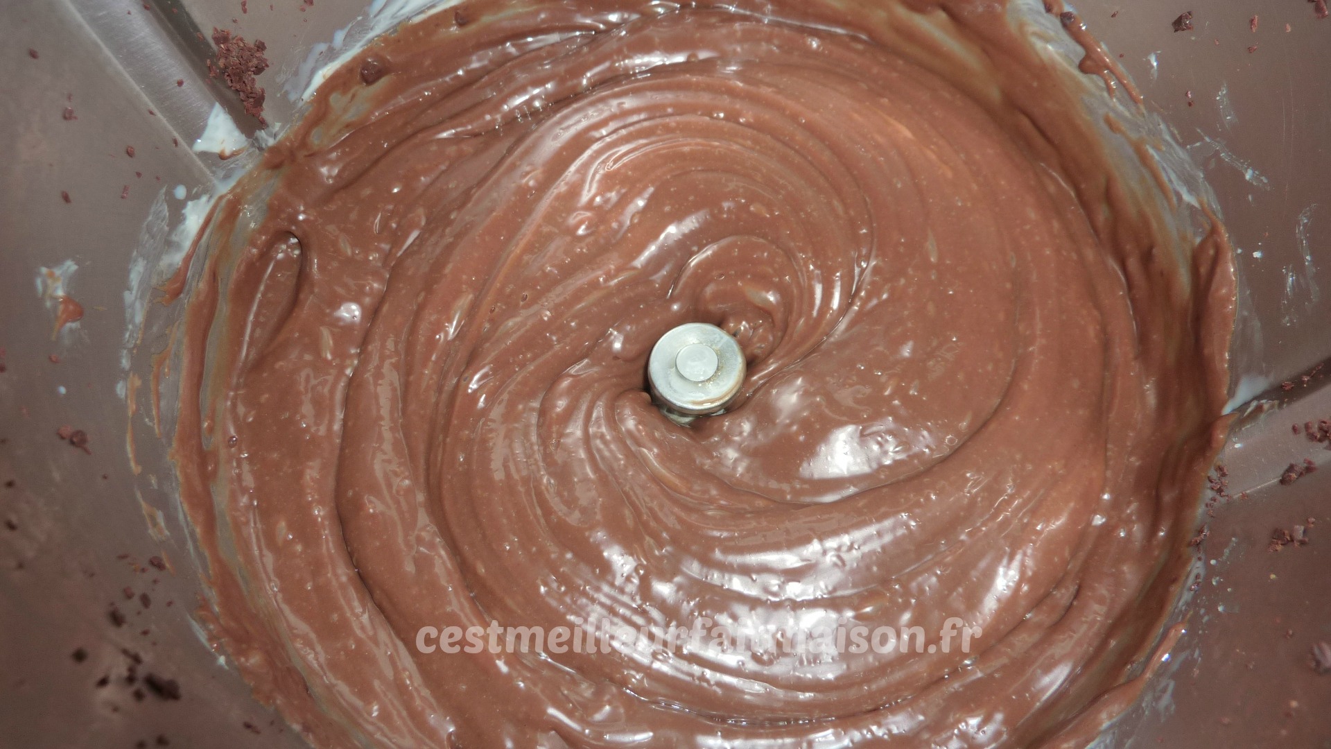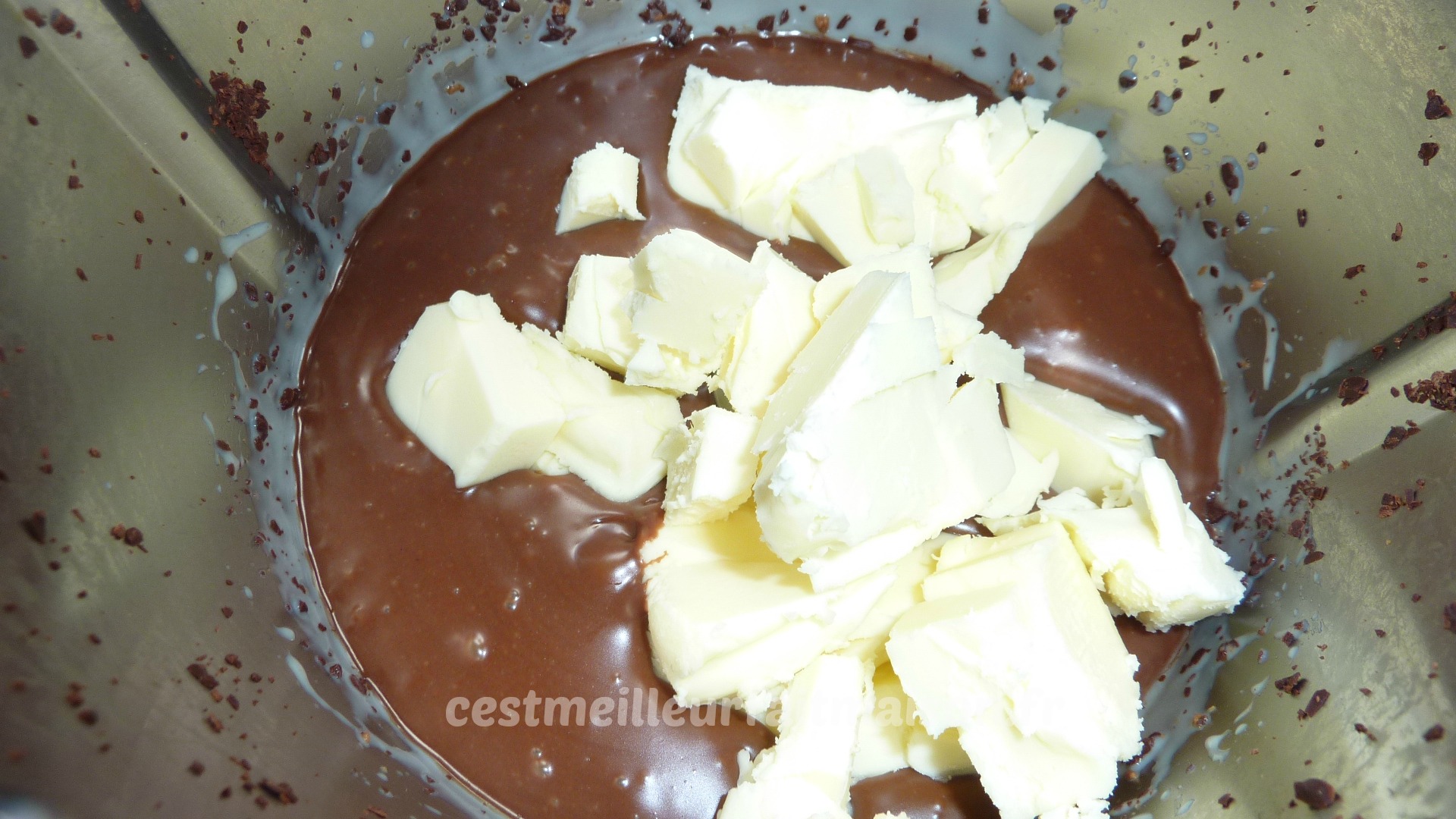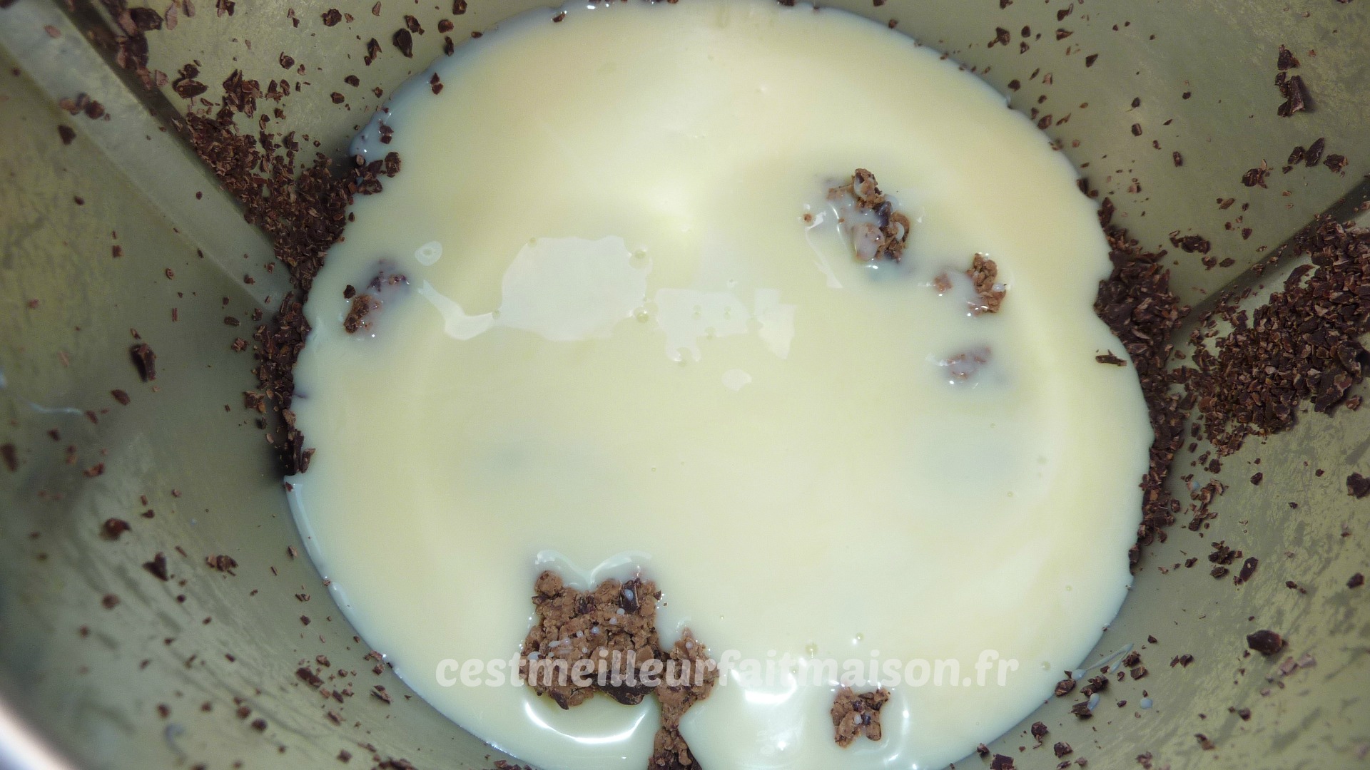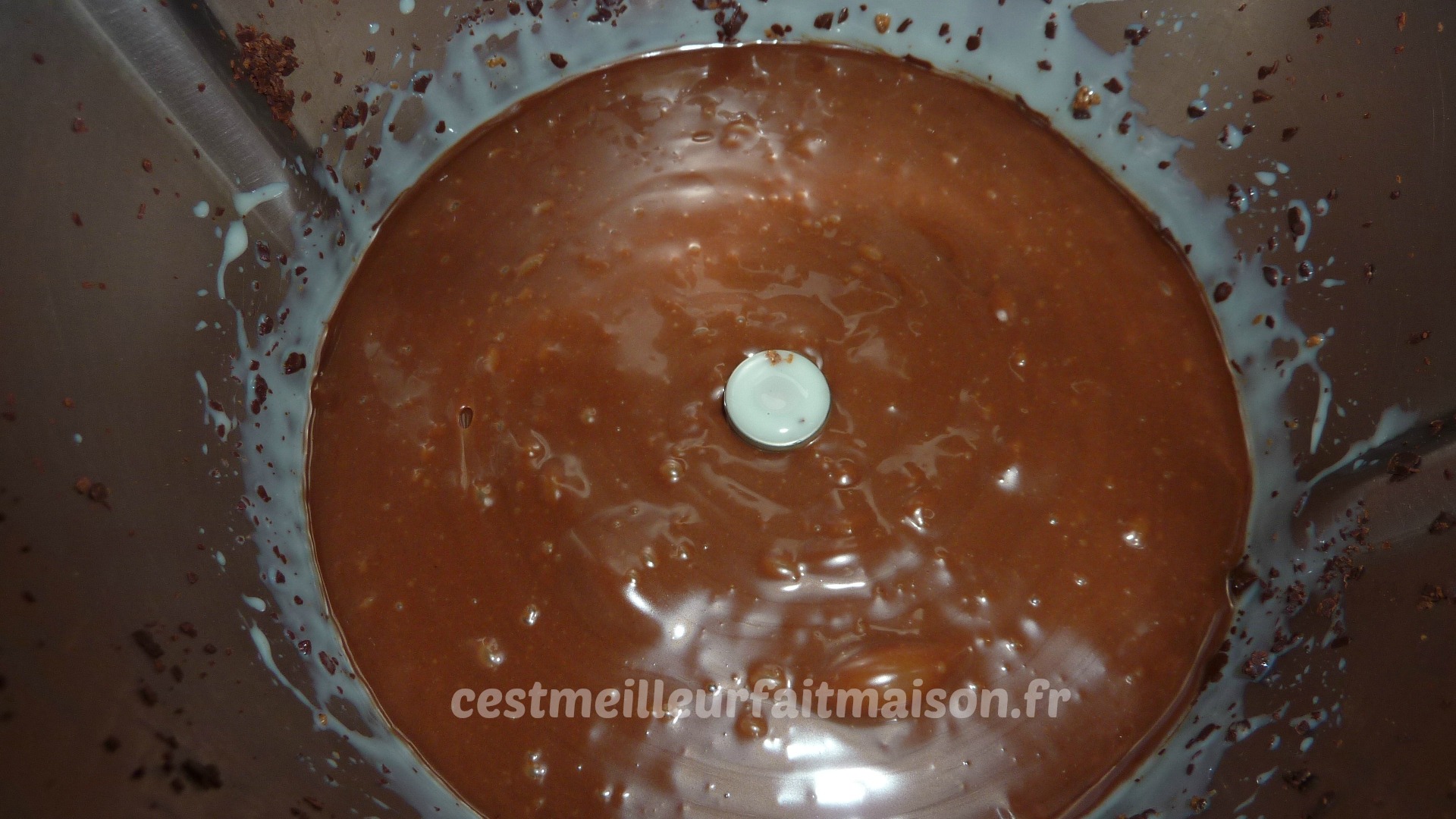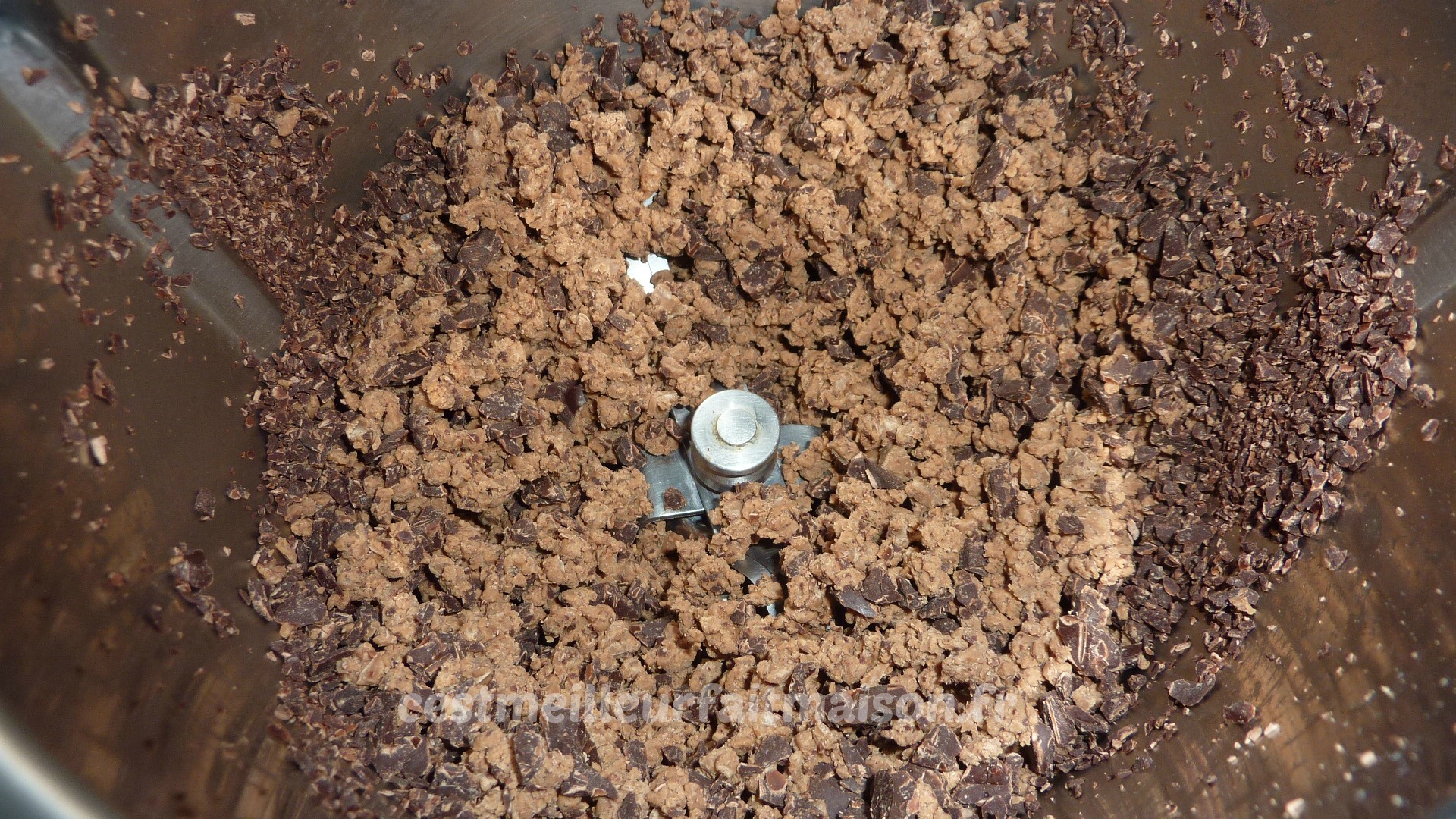 1- Mettre le chocolat pralinoise et le chocolat noir dans le bol du Thermomix. Mixer 5 sec/Vit 6.