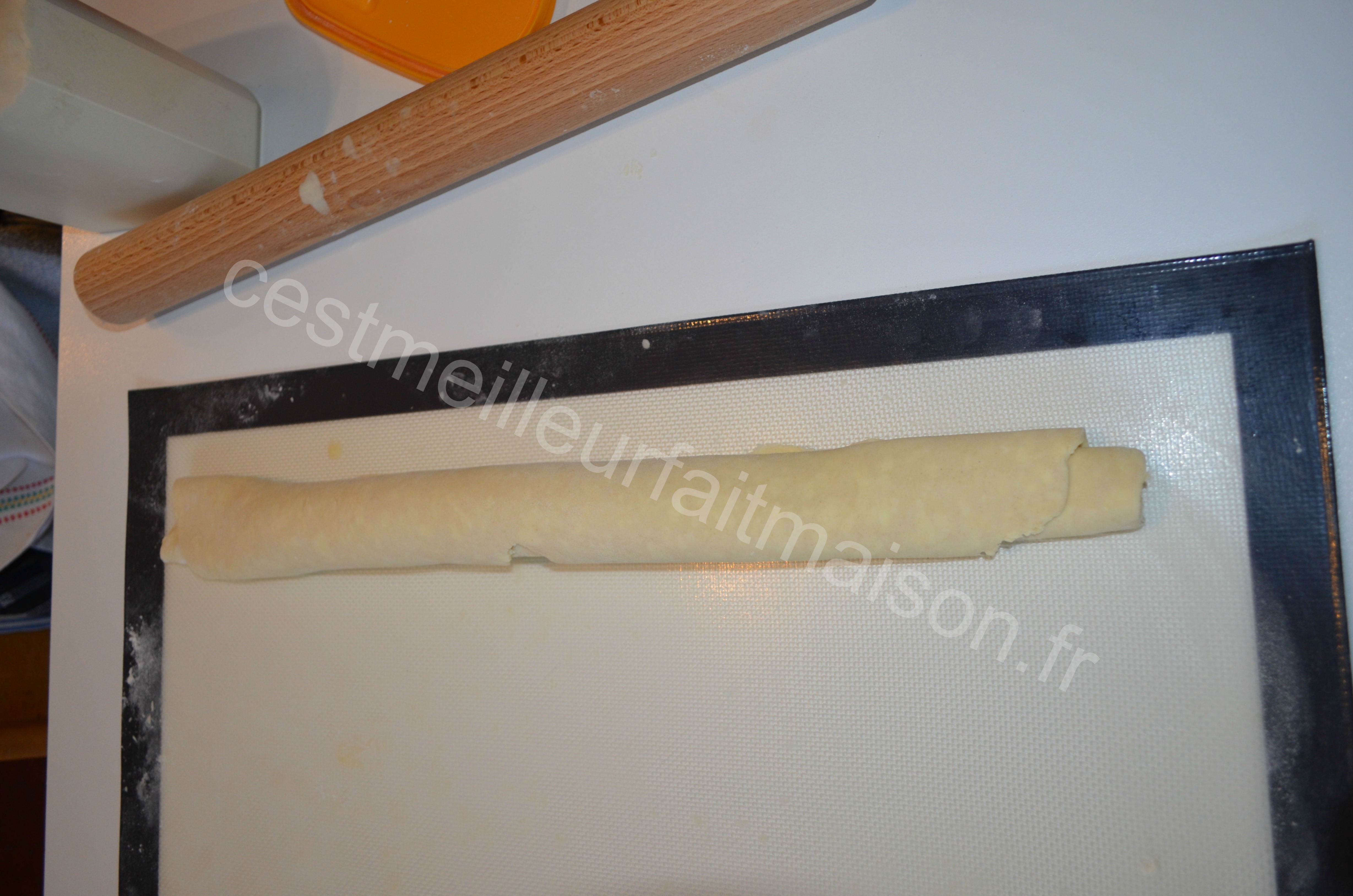 4- Sortir l’escargot du réfrigérateur. Attendre quelque minute pour qu’il soit moins dur. Le mettre sur la tranche, toujours sur un plan de travail fariné, et taper dessus avec le rouleau à pâtisserie. Etaler la pâte en rond ou en rectangle suivant son besoin.