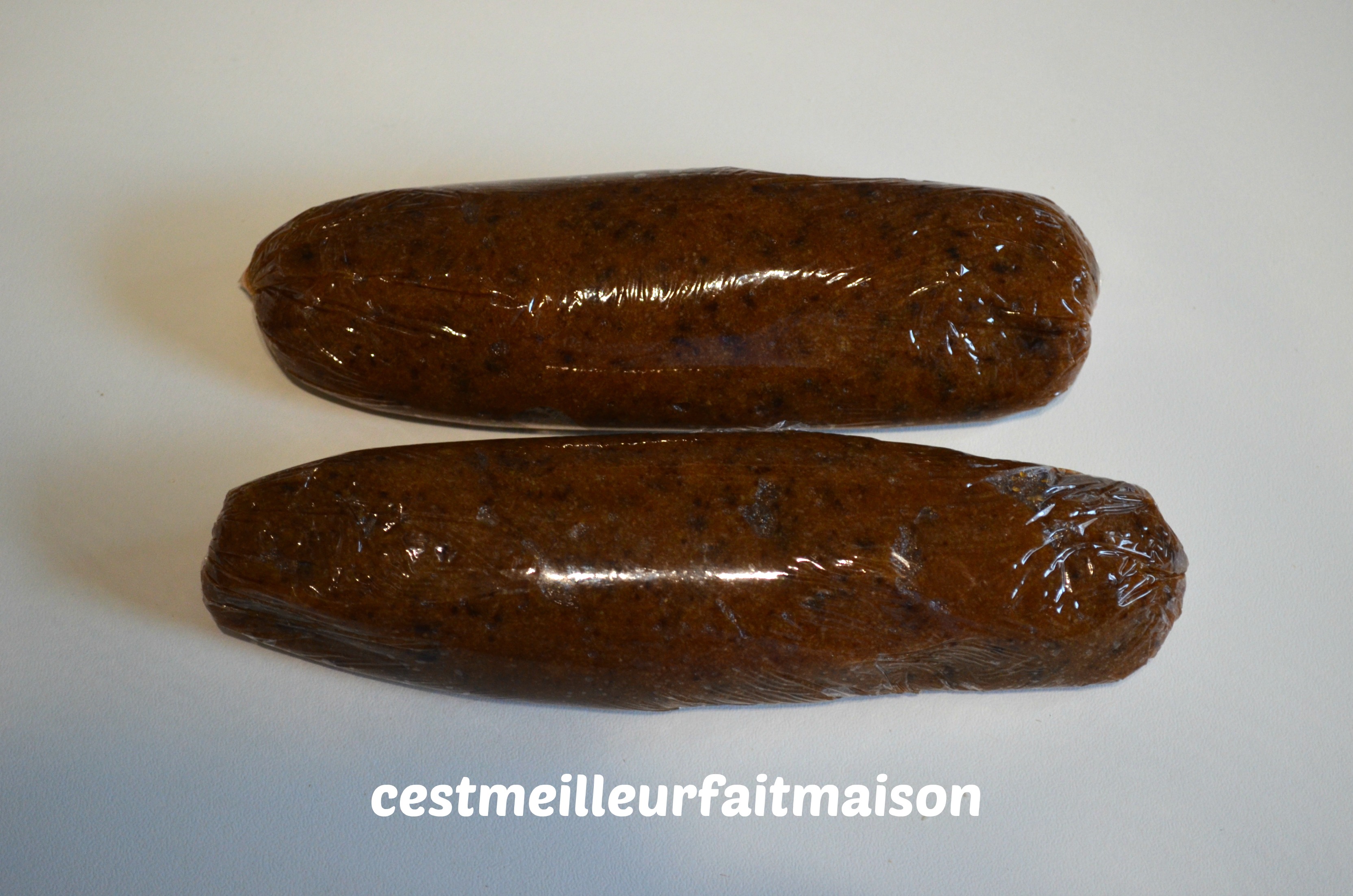 3- Confectionner deux boudins et les rouler dans du film alimentaire. Mettre au réfrigérateur au moins 1 heure.